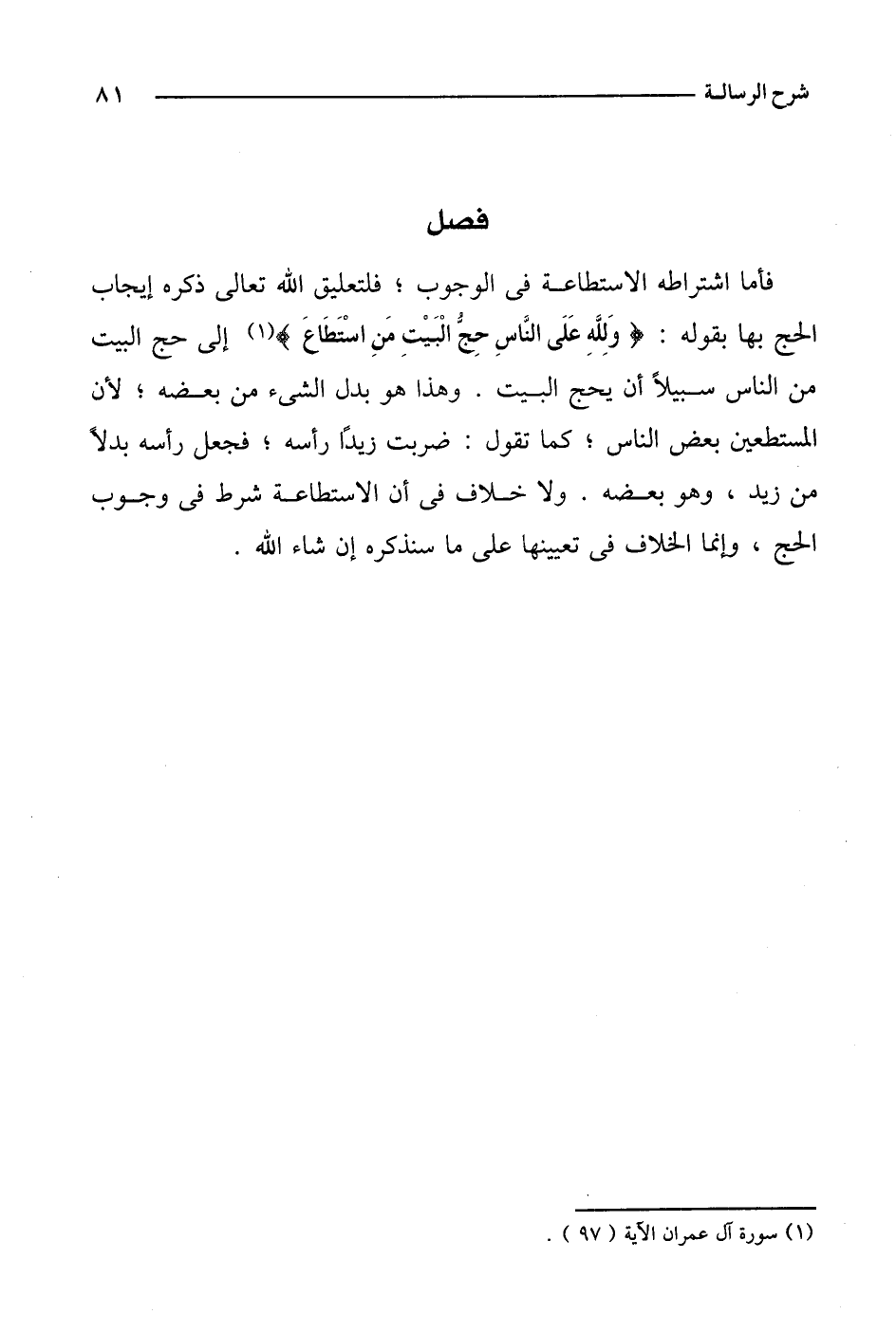 فأما اشتراطه الاستطاعة في الوجوب؛ فلتعليق الله تعالى ذكره إيجاب الحج بها بقوله:} ولله على الناس حج البيت من استطاع {إلى حج البيت من الناس سبيلاً أن يحج البيت. وهذا هو بدل الشيء من بعضه؛ لأن المستطعين بعض الناس؛ كما تقول: ضربت زيدًا رأسه؛ فجعل رأسه بدلاً من زيد، وهو بعضه. ولا خلاف في أن الاستطاعة شرط في وجوب الحج، وإنما الخلاف في تعيينها على ما سنذكره إن شاء الله.