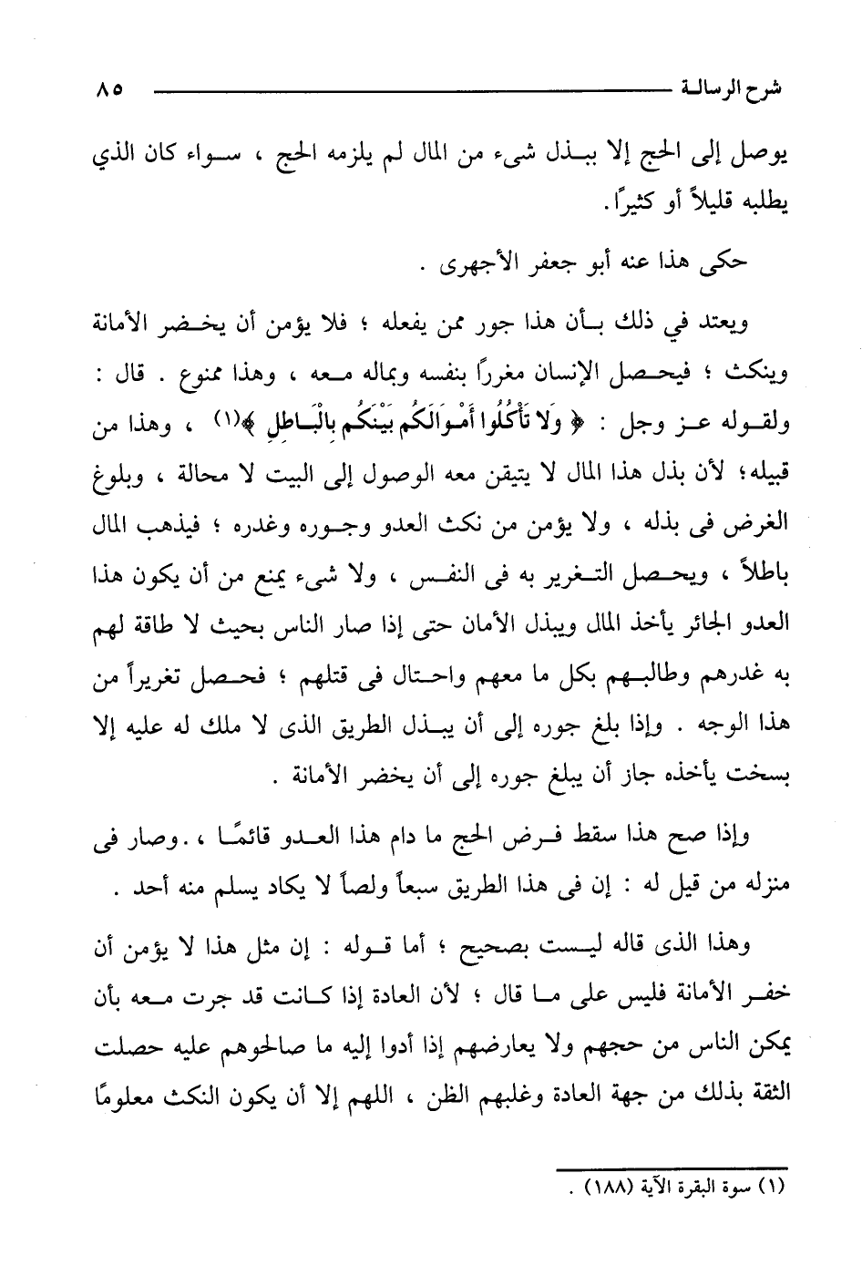 ويعتد في ذلك بأن هذا جور ممن يفعله؛ فلا يؤمن أن يخضر الأمانة وينكث؛ فيحصل الإنسان مغررًا بنفسه وبماله معه، وهذا ممنوع. قال: ولقوله عز وجل:} ولا تأكلوا أموالكم بينكم بالباطل {، وهذا من قبيله؛ لأن بذل هذا المال لا يتيقن معه الوصول إلى البيت لا محالة، وبلوغ الغرض في بذله، ولا يؤمن من نكث العدو وجوره وغدره؛ فيذهب المال باطلاً، ويحصل التغرير به في النفس، ولا شيء يمنع من أن يكون هذا العدو الجائر يأخذ المال ويبذل الأمان حتى إذا صار الناس بحيث لا طاقة لهم به غدرهم وطالبهم بكل ما معهم واحتال في قتلهم؛ فحصل تغريرًا من هذا الوجه. وإذا بلغ جوره إلى أن يبذل الطريق الذي لا ملك له عليه إلا بسخت يأخذه جاز أن يبلغ جوره إلى أن يخضر الأمانة.