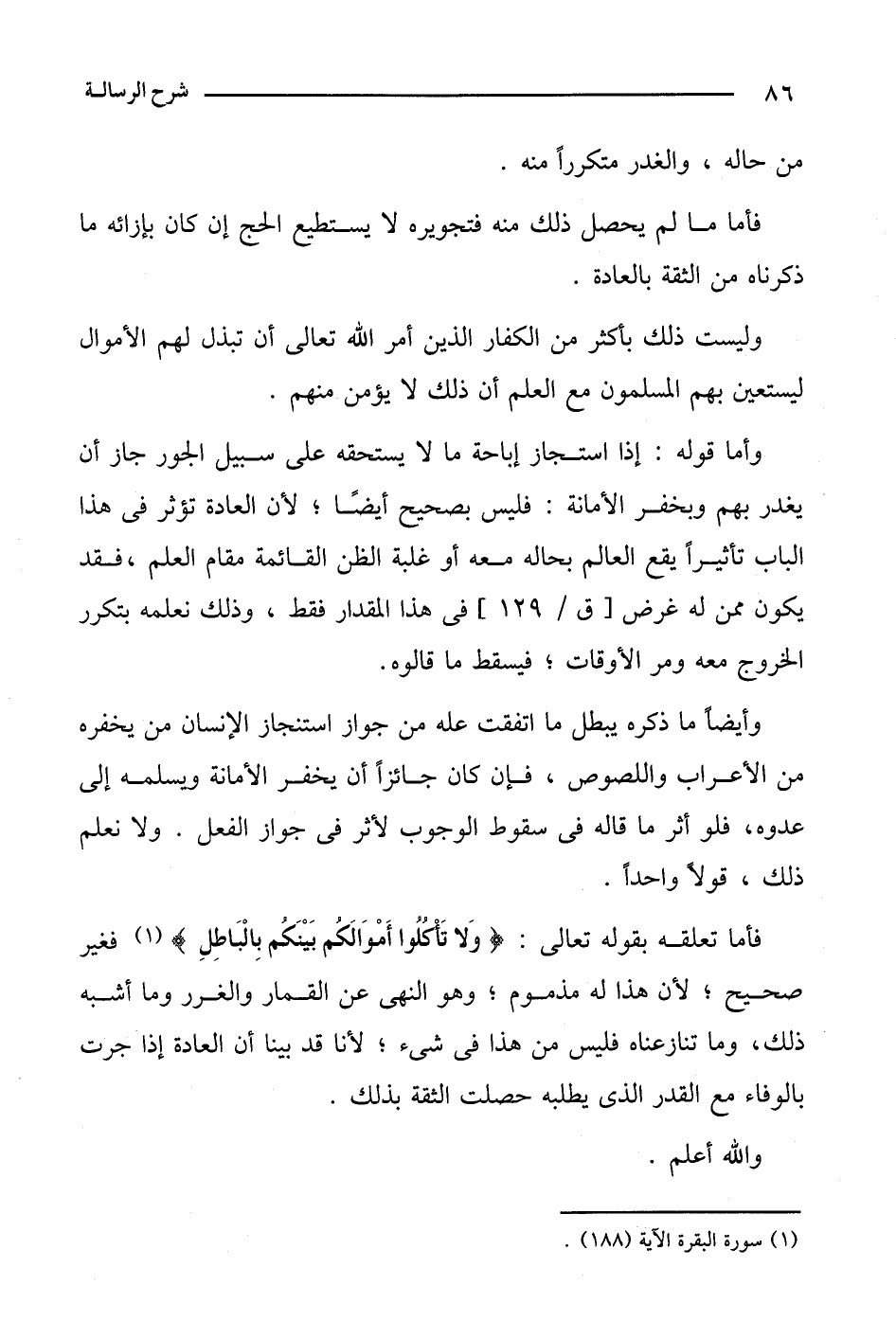 وأما قوله: إذا استجاز إباحة ما لا يستحقه على سبيل الجور جاز أن يغدر بهم وبخفر الأمانة: فليس بصحيح أيضًا؛ لأن العادة تؤثر في هذا الباب تأثيرًا يقع العالم بحاله معه أو غلبة الظن القائمة مقام العلم، فقد يكون ممن له غرض [ق/ 129] في هذا المقدار فقط، وذلك نعلمه بتكرر الخروج معه ومر الأوقات؛ فيسقط ما قالوه.