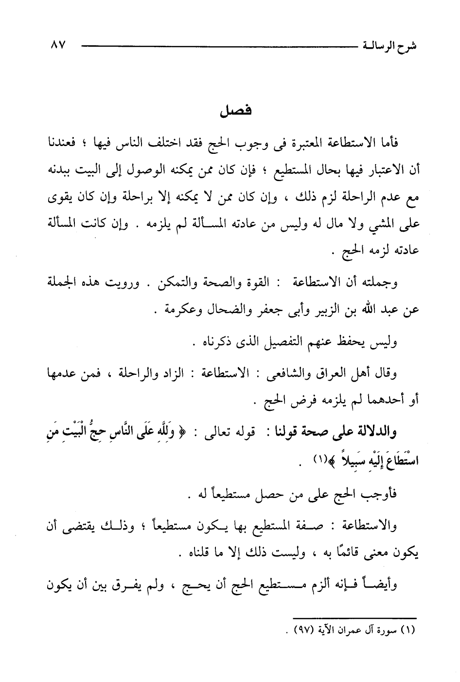 وجملته أن الاستطاعة: القوة والصحة والتمكن. ورويت هذه الجملة عن عبد الله بن الزبير وأبى جعفر والضحال وعكرمة.