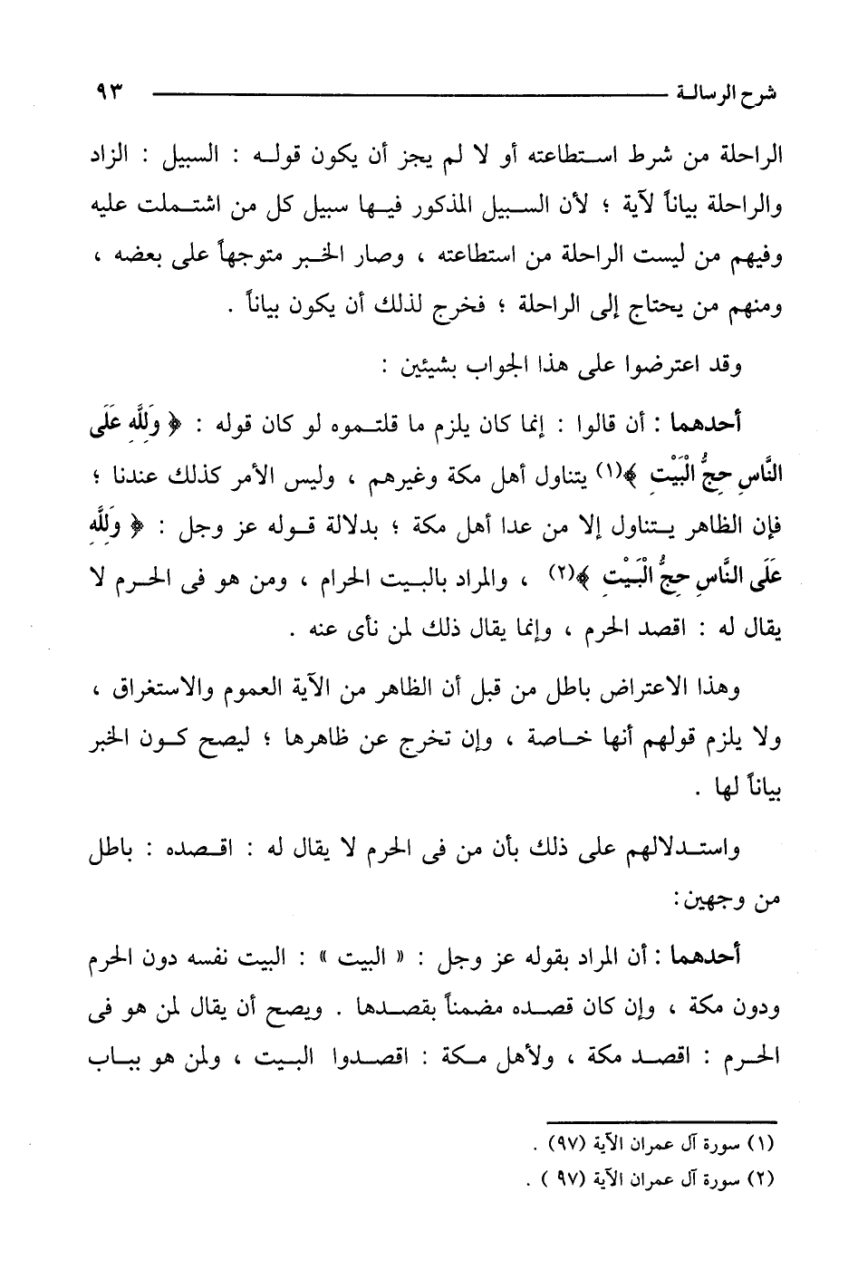 أحدهما: أن قالوا: إنما كان يلزم ما قلتموه لو كان قوله:} ولله على الناس حج البيت {يتناول أهل مكة وغيرهم، وليس الأمر كذلك عندنا؛ فإن الظاهر يتناول إلا من عدا أهل مكة؛ بدلالة قوله عز وجل:} ولله على الناس حج البيت {، والمراد بالبيت الحرام، ومن هو في الحرم لا يقال له: اقصد الحرم، وإنما يقال ذلك لمن نأى عنه.