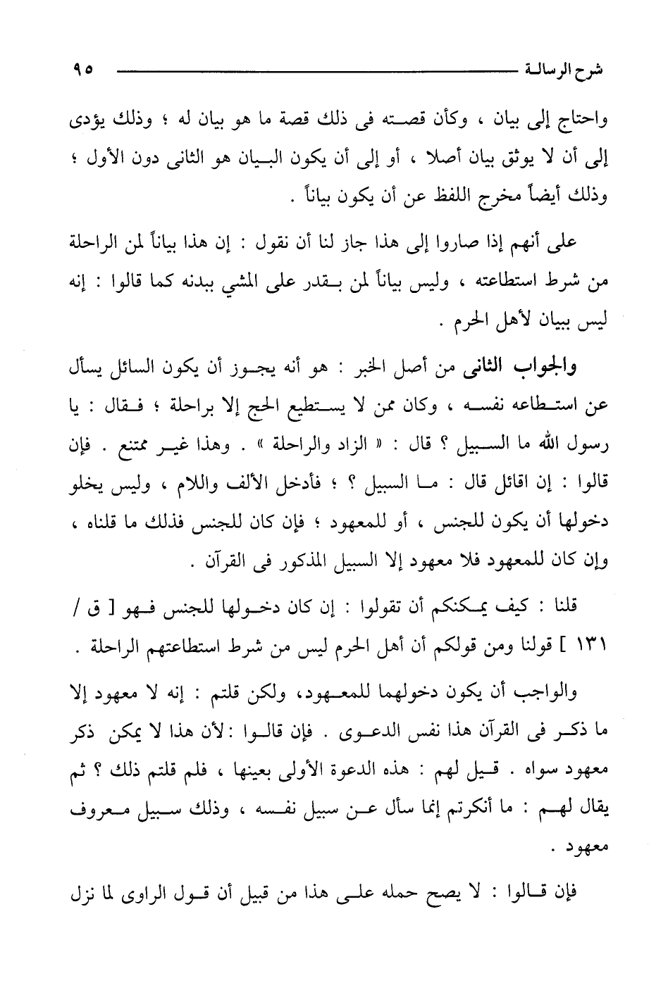 على أنهم إذا صاروا إلى هذا جاز لنا أن نقول: إن هذا بيانًا لمن الراحلة من شرط استطاعته، وليس بيانًا لمن بقدر على المشي ببدنه كما قالوا: إنه ليس ببيان لأهل الحرم.