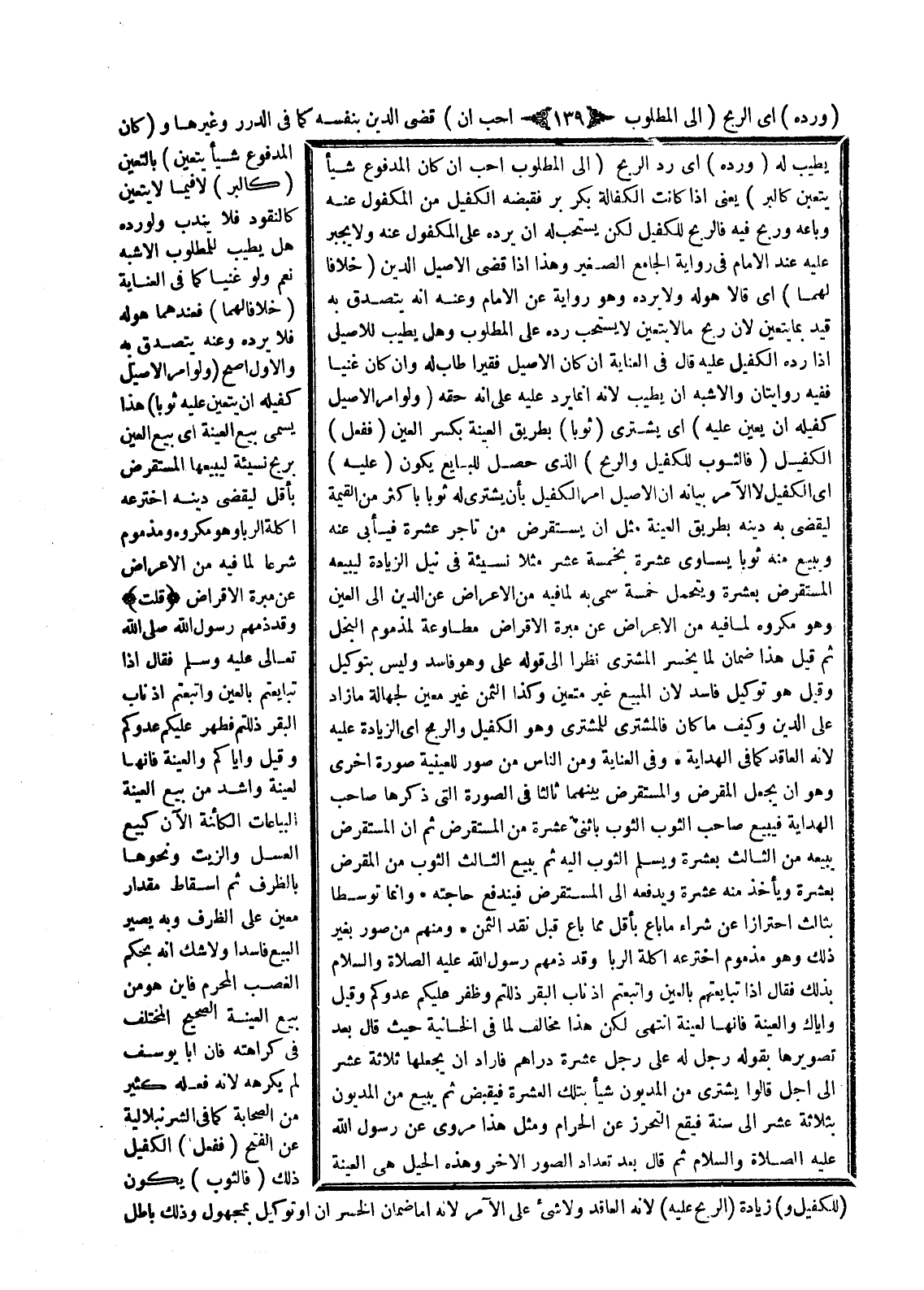 يَطِيبُ لَهُ (وَرَدُّهُ) أَيْ رَدُّ الرِّبْحِ (إلَى الْمَطْلُوبِ أَحَبُّ إنْ كَانَ الْمَدْفُوعُ شَيْئًا يَتَعَيَّنُ كَالْبُرِّ) يَعْنِي إذَا كَانَتْ الْكَفَالَةُ بِكُرِّ بُرٍّ، فَقَبَضَهُ الْكَفِيلُ مِنْ الْمَكْفُولِ عَنْهُ وَبَاعَهُ وَرَبِحَ فِيهِ فَالرِّبْحُ لِلْكَفِيلِ لَكِنْ يُسْتَحَبُّ لَهُ أَنْ يَرُدَّهُ عَلَى الْمَكْفُولِ عَنْهُ، وَلَا يُجْبَرُ عَلَيْهِ عِنْدَ الْإِمَامِ فِي رِوَايَةِ الْجَامِعِ الصَّغِيرِ وَهَذَا إذَا قَضَى الْأَصِيلُ الدَّيْنَ (خِلَافًا لَهُمَا) أَيْ قَالَا: هُوَ لَهُ وَلَا يَرُدُّهُ، وَهُوَ رِوَايَةٌ عَنْ الْإِمَامِ، وَعَنْهُ أَنَّهُ يَتَصَدَّقُ بِهِ.