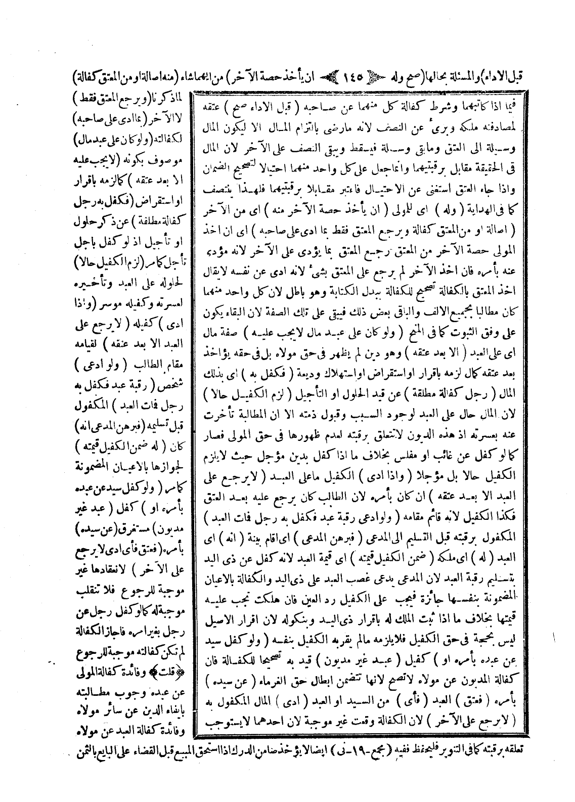 (وَلَوْ كَفَلَ سَيِّدٌ عَنْ عَبْدِهِ بِأَمْرِهِ أَوْ) كَفَلَ (عَبْدٌ غَيْرُ مَدْيُونٍ) قَيَّدَ بِهِ تَصْحِيحًا لِلْكَفَالَةِ فَإِنَّ كَفَالَةَ الْمَدْيُونِ عَنْ مَوْلَاهُ لَا تَصِحُّ لِأَنَّهَا تَتَضَمَّنُ إبْطَالَ حَقِّ الْغُرَمَاءِ (عَنْ سَيِّدِهِ) بِأَمْرِهِ (فَعَتَقَ) الْعَبْدُ (فَأَيٌّ) مِنْ السَّيِّدِ أَوْ الْعَبْدِ (أَدَّى) الْمَالَ الْمَكْفُولَ بِهِ (لَا يَرْجِعُ عَلَى الْآخَرِ) لِأَنَّ الْكَفَالَةَ وَقَعَتْ غَيْرَ مُوجِبَةٍ لِأَنَّ أَحَدَهُمَا لَا يَسْتَوْجِبُ