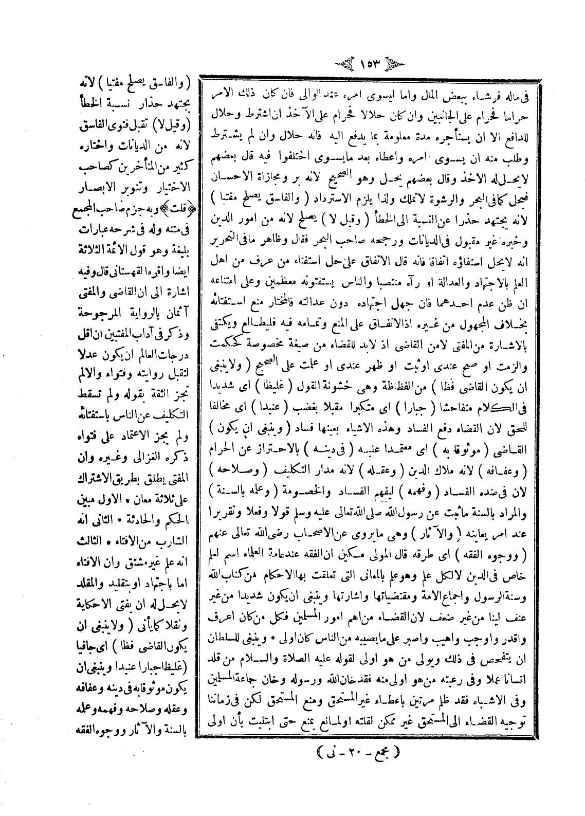 (وَلَا يَنْبَغِي أَنْ يَكُونَ الْقَاضِي فَظًّا) مِنْ الْفَظَاظَةِ وَهِيَ خُشُونَةُ الْقَوْلِ (غَلِيظًا) أَيْ شَدِيدًا فِي الْكَلَامِ مُتَفَاحِشًا (جَبَّارًا) أَيْ مُتَكَبِّرًا مُقْبِلًا بِغَضَبٍ (عَنِيدًا) أَيْ مُخَالِفًا لِلْحَقِّ، لِأَنَّ الْقَضَاءَ دَفْعُ الْفَسَادِ وَهَذِهِ الْأَشْيَاءُ بِعَيْنِهَا فَسَادٌ (وَيَنْبَغِي أَنْ يَكُونَ) الْقَاضِي (مَوْثُوقًا بِهِ) أَيْ مُعْتَمَدًا عَلَيْهِ (فِي دِينِهِ) بِالِاحْتِرَازِ عَنْ الْحَرَامِ (وَعَفَافِهِ) لِأَنَّهُ مَلَاكُ الدِّينِ (وَعَقْلِهِ) لِأَنَّهُ مَدَارُ التَّكْلِيفِ (وَصَلَاحِهِ) لِأَنَّ فِي ضِدِّهِ الْفَسَادَ (وَفَهْمِهِ) لِيَفْهَمَ الْفَسَادَ وَالْخُصُومَةَ (وَعِلْمِهِ بِالسُّنَّةِ) وَالْمُرَادُ بِالسُّنَّةِ مَا ثَبَتَ عَنْ رَسُولِ اللَّهِ - صَلَّى اللَّهُ تَعَالَى عَلَيْهِ وَسَلَّمَ - قَوْلًا وَفِعْلًا وَتَقْرِيرًا عِنْدَ أَمْرٍ يُعَايِنُهُ (وَالْآثَارِ) وَهِيَ مَا يُرْوَى عَنْ الْأَصْحَابِ - رَضِيَ اللَّهُ تَعَالَى عَنْهُمْ - (وَوُجُوهِ الْفِقْهِ) أَيْ طُرُقِهِ قَالَ الْمَوْلَى مِسْكِينٌ: إنَّ الْفِقْهَ عِنْدَ عَامَّةِ الْعُلَمَاءِ اسْمٌ لِعِلْمٍ خَاصٍّ فِي الدِّينِ لَا لِكُلِّ عِلْمٍ وَهُوَ عِلْمٌ بِالْمَعَانِي الَّتِي تَعَلَّقَتْ بِهَا الْأَحْكَامُ مِنْ كِتَابِ اللَّهِ وَسُنَّةِ الرَّسُولِ، وَإِجْمَاعِ الْأُمَّةِ وَمُقْتَضَيَاتِهَا، وَإِشَارَتِهَا وَيَنْبَغِي أَنْ يَكُونَ شَدِيدًا مِنْ غَيْرِ عُنْفٍ لَيِّنًا مِنْ غَيْرِ ضَعْفٍ لِأَنَّ الْقَضَاءَ مِنْ أَهَمِّ أُمُورِ الْمُسْلِمِينَ فَكُلُّ مَنْ كَانَ أَعْرَفَ وَأَقْدَرَ وَأَوْجَبَ وَأَهْيَبَ وَأَصْبَرَ عَلَى مَا يُصِيبُهُ مِنْ النَّاسِ كَانَ أَوْلَى.