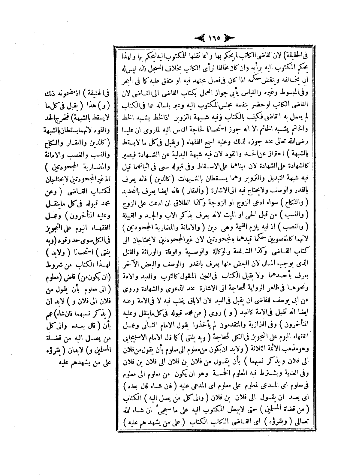 وَفِي الْمَبْسُوطِ وَغَيْرِهِ: وَالْقِيَاسُ يَأْبَى جَوَازَ الْعَمَلِ بِكِتَابِ الْقَاضِي إلَى الْقَاضِي لِأَنَّ الْقَاضِيَ الْكَاتِبَ لَوْ حَضَرَ بِنَفْسِهِ مَجْلِسَ الْمَكْتُوبِ إلَيْهِ وَعَبَّرَ بِلِسَانِهِ عَمَّا فِي الْكِتَابِ لَمْ يَعْمَلْ بِهِ الْقَاضِي فَكَيْفَ بِالْكِتَابِ وَفِيهِ شُبْهَةُ التَّزْوِيرِ، إذْ الْخَطُّ يُشْبِهُ الْخَطَّ وَالْخَاتَمُ يُشْبِهُ الْخَاتَمَ إلَّا أَنَّهُ جُوِّزَ اسْتِحْسَانًا لِحَاجَةِ النَّاسِ إلَيْهِ لِمَا رُوِيَ أَنَّ عَلِيًّا - رَضِيَ اللَّهُ تَعَالَى عَنْهُ - جَوَّزَهُ لِذَلِكَ وَعَلَيْهِ أَجْمَعَ الْفُقَهَاءُ (وَيُقْبَلُ فِي كُلِّ مَا لَا يَسْقُطُ بِالشُّبْهَةِ) احْتِرَازٌ عَنْ الْحَدِّ وَالْقَوَدِ لِأَنَّ فِيهِ شُبْهَةَ الْبَدَلِيَّةِ عَنْ الشَّهَادَةِ فَيَصِيرُ كَالشَّهَادَةِ عَلَى الشَّهَادَةِ لِأَنَّ مَبْنَاهُمَا عَلَى الْإِسْقَاطِ، وَفِي قَبُولِهِ سَعْيٌ فِي إثْبَاتِهِمَا قِيلَ فِيهِ شُبْهَةُ التَّبْدِيلِ وَالتَّزْوِيرِ وَهُمَا يَسْقُطَانِ بِالشُّبُهَاتِ (كَالدَّيْنِ) فَإِنَّهُ يُعْرَفُ بِالْقَدْرِ وَالْوَصْفِ وَلَا يُحْتَاجُ فِيهِ إلَى الْإِشَارَةِ (وَالْعَقَارِ) فَإِنَّهُ أَيْضًا يُعْرَفُ بِالتَّحْدِيدِ (وَالنِّكَاحِ) سَوَاءٌ ادَّعَى الزَّوْجُ أَوْ الزَّوْجَةُ، وَكَذَا الطَّلَاقُ إنْ ادَّعَتْ عَلَى الزَّوْجِ (وَالنَّسَبِ) مِنْ قِبَلِ الْحَيِّ أَوْ الْمَيِّتِ لِأَنَّهُ يُعْرَفُ بِذِكْرِ الْأَبِ وَالْجَدِّ وَالْقَبِيلَةِ (وَالْغَصْبِ) إذْ فِيهِ يَلْزَمُ الْقِيمَةُ وَهِيَ دَيْنٌ (وَالْأَمَانَةِ وَالْمُضَارَبَةِ الْمَجْحُودَتَيْنِ) لِأَنَّهُمَا كَالْمَغْصُوبَيْنِ حُكْمًا قَيَّدَهُمَا بِالْمَجْحُودَتَيْنِ لِأَنَّ غَيْرَ الْمَجْحُودَتَيْنِ لَا يَحْتَاجَانِ إلَى كِتَابِ الْقَاضِي، وَكَذَا الشُّفْعَةُ وَالْوَكَالَةُ وَالْوَصِيَّةُ وَالْوَفَاةُ وَالْوِرَاثَةُ وَالْقَتْلُ الَّذِي يُوجِبُ الْمَالَ لِأَنَّ الْبَعْضَ مِنْهَا يُعْرَفُ بِالْقَدْرِ وَالْوَصْفِ، وَالْبَعْضَ الْآخَرَ يُعْرَفُ بِأَحَدِهِمَا وَلَا يُقْبَلُ الْكِتَابُ فِي الْعَيْنِ الْمَنْقُولِ كَالثَّوْبِ وَالْعَبْدِ وَالْأَمَةِ وَنَحْوِهَا فِي ظَاهِرِ الرِّوَايَةِ لِلْحَاجَةِ إلَى الْإِشَارَةِ عِنْدَ الدَّعْوَى وَالشَّهَادَةِ وَرُوِيَ عَنْ أَبِي يُوسُفَ لِلْقَاضِي أَنْ يَقْبَلَ فِي الْعَبْدِ لِأَنَّ الْإِبَاقَ يَغْلِبُ فِيهِ لَا فِي الْأَمَةِ.