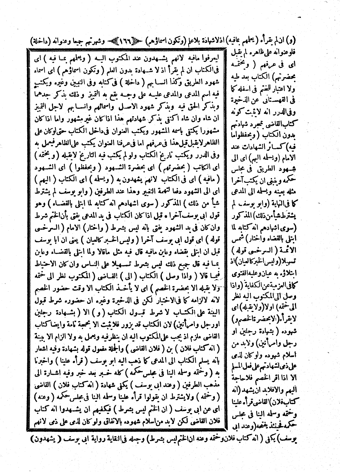 (وَ) إلَّا (بِشَهَادَةِ رَجُلَيْنِ أَوْ رَجُلٍ وَامْرَأَتَيْنِ) لِأَنَّ الْكِتَابَ قَدْ يُزَوَّرُ فَلَا يَثْبُتُ إلَّا بِحُجَّةٍ تَامَّةٍ وَأَيْضًا كِتَابُ الْقَاضِي مُلْزِمٌ إذْ يَجِبُ عَلَى الْمَكْتُوبِ إلَيْهِ أَنْ يَنْظُرَ فِيهِ وَيَعْمَلَ بِهِ وَلَا إلْزَامَ إلَّا بِبَيِّنَةٍ (أَنَّهُ كِتَابُ فُلَانِ) بْنِ (فُلَانٍ الْقَاضِي) وَالْجُمْلَةُ مَفْعُولُ قَوْلِهِ بِشَهَادَةِ، وَفِيهِ إشْعَارٌ بِأَنَّهُ يُسَلِّمُ الْكِتَابَ إلَى الْمُدَّعِي كَمَا ذَهَبَ إلَيْهِ أَبُو يُوسُفَ (قَرَأَهُ عَلَيْنَا) وَأَخْبَرَنَا بِهِ (وَخَتَمَهُ وَسَلَّمَهُ إلَيْنَا فِي مَجْلِسِ حُكْمِهِ) كُلُّهُ خَبَرٌ بَعْدَ خَبَرٍ، وَفِيهِ إشَارَةٌ إلَى مَذْهَبِ الطَّرَفَيْنِ (وَعِنْدَ أَبِي يُوسُفَ) يَكْفِي شَهَادَةُ (أَنَّهُ كِتَابُ فُلَانٍ) الْقَاضِي (وَخَتْمُهُ) وَلَا يُشْتَرَطُ أَنْ يَقُولُوا قَرَأَهُ عَلَيْنَا وَسَلَّمَهُ إلَيْنَا فِي مَجْلِسِ حُكْمِهِ (وَعَنْهُ) أَيْ عَنْ أَبِي يُوسُفَ (أَنَّ الْخَتْمَ لَيْسَ بِشَرْطٍ) فَيَكْفِيهِمْ أَنْ يَشْهَدُوا أَنَّهُ كِتَابُ فُلَانٍ الْقَاضِي لَكِنْ لَا بُدَّ مِنْ إسْلَامِ شُهُودِهِ بِالِاتِّفَاقِ وَلَوْ كَانَ لِذِمِّيٍّ عَلَى ذِمِّيٍّ لِأَنَّهُمْ