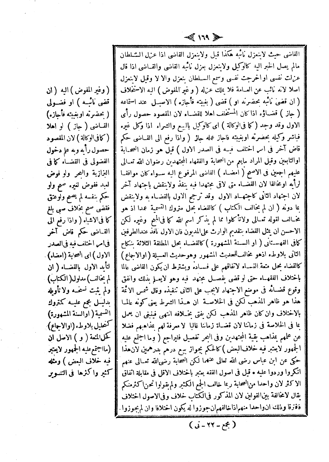 (وَإِذَا رُفِعَ إلَى الْقَاضِي حُكْمُ قَاضٍ آخَرَ فِي أَمْرٍ اُخْتُلِفَ فِيهِ فِي الصَّدْرِ الْأَوَّلِ) قِيلَ هُوَ زَمَانُ الصَّحَابَةِ أَوْ التَّابِعِينَ، وَقِيلَ الْمُرَادُ مَا يَعُمُّ مِنْ الصَّحَابَةِ وَالْفُقَهَاءِ الْمُجْتَهِدِينَ - رِضْوَانُ اللَّهِ تَعَالَى عَلَيْهِمْ أَجْمَعِينَ - فِي الْأَصَحِّ (أَمْضَاهُ) الْقَاضِي الْمَرْفُوعُ إلَيْهِ سَوَاءٌ كَانَ مُوَافِقًا لِرَأْيِهِ أَوْ مُخَالِفًا لِأَنَّ الْقَضَاءَ مَتَى لَاقَى مُجْتَهَدًا فِيهِ يَنْفُذُ وَلَا يُنْقَضُ بِاجْتِهَادٍ آخَرَ لِأَنَّ اجْتِهَادَ الثَّانِي كَاجْتِهَادِ الْأَوَّلِ وَقَدْ تَرَجَّحَ الْأَوَّلُ بِالْقَضَاءِ بِهِ، وَلَا يُنْقَضُ بِمَا دُونَهُ (إنْ لَمْ يُخَالِفْ الْكِتَابَ) كَالْقَضَاءِ بِحِلِّ مَتْرُوكِ التَّسْمِيَةِ عَمْدًا إذْ هُوَ مُخَالِفٌ لِقَوْلِهِ تَعَالَى {وَلا تَأْكُلُوا مِمَّا لَمْ يُذْكَرِ اسْمُ اللَّهِ} [الأنعام: 121] كَمَا فِي الْمِنَحِ وَغَيْرِهِ لَكِنَّ الْأَحْسَنَ أَنْ يُمَثَّلَ الْقَضَاءُ بِتَقْدِيمِ الْوَارِثِ عَلَى الْمَدْيُونِ فَإِنَّ الْأَوَّلَ نَافِذٌ عِنْدَ الطَّرَفَيْنِ كَمَا فِي الْقُهُسْتَانِيِّ (أَوْ السُّنَّةَ الْمَشْهُورَةَ) كَالْقَضَاءِ بِحِلِّ الْمُطَلَّقَةِ الثَّلَاثَةَ بِنِكَاحِ الثَّانِي بِلَا وَطْءٍ، إذْ هُوَ مُخَالِفٌ لِلْحَدِيثِ الْمَشْهُورِ وَهُوَ حَدِيثُ الْعُسَيْلَةِ (أَوْ الْإِجْمَاعَ) كَالْقَضَاءِ بِحِلِّ مُتْعَةِ النِّسَاءِ لِاتِّفَاقِهِمْ عَلَى فَسَادِهِ، وَيُشْتَرَطُ أَنْ يَكُونَ الْقَاضِي عَالِمًا بِاخْتِلَافِ الْفُقَهَاءِ حَتَّى لَوْ قَضَى بِفَصْلٍ مُجْتَهَدٍ فِيهِ وَهُوَ لَا يَعْلَمُ بِذَلِكَ وَاتَّفَقَ وُقُوعُ قَضَائِهِ فِي مَوْضِعِ الِاجْتِهَادِ لَا يَجِبُ عَلَى الثَّانِي تَنْفِيذُهُ.