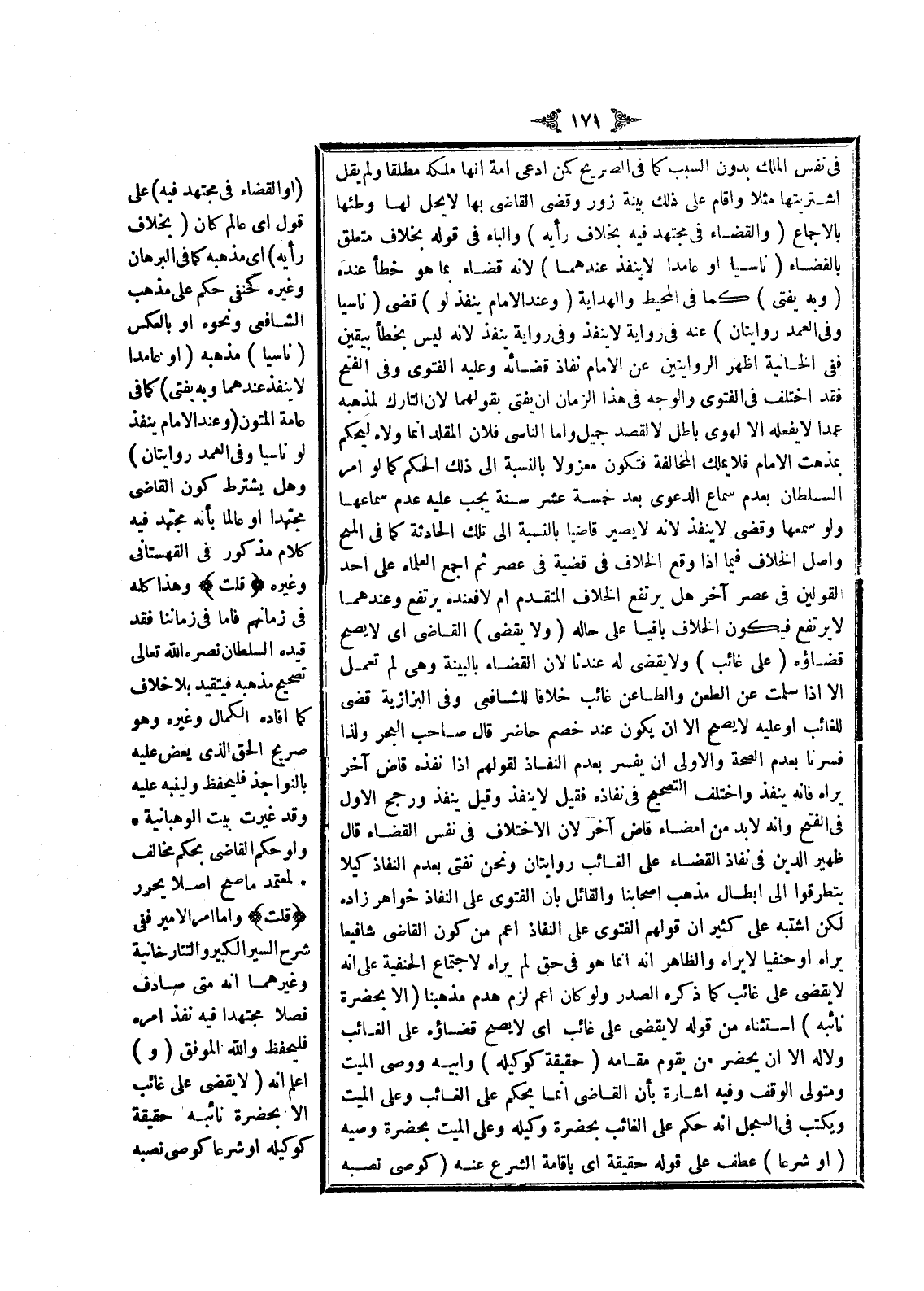 وَفِي الْبَزَّازِيَّةِ: قَضَى لِلْغَائِبِ أَوْ عَلَيْهِ لَا يَصِحُّ إلَّا أَنْ يَكُونَ عِنْدَ خَصْمٍ حَاضِرٍ، قَالَ صَاحِبُ الْبَحْرِ: وَلِذَا فَسَّرْنَا بِعَدَمِ الصِّحَّةِ، وَالْأَوْلَى أَنْ يُفَسَّرَ بِعَدَمِ النَّفَاذِ لِقَوْلِهِمْ إذَا نَفَّذَهُ قَاضٍ آخَرُ يَرَاهُ فَإِنَّهُ يَنْفُذُ وَاخْتَلَفَ التَّصْحِيحُ فِي نَفَاذِهِ، فَقِيلَ: لَا يَنْفُذُ، وَقِيلَ يَنْفُذُ وَرَجَّحَ الْأَوَّلَ فِي الْفَتْحِ، وَأَنَّهُ لَا بُدَّ مِنْ إمْضَاءِ قَاضٍ آخَرَ لِأَنَّ الِاخْتِلَافَ فِي نَفْسِ الْقَضَاءِ، قَالَ ظَهِيرُ الدِّينِ: فِي نَفَاذِ الْقَضَاءِ عَلَى الْغَائِبِ رِوَايَتَانِ، وَنَحْنُ نُفْتِي بِعَدَمِ النَّفَاذِ كَيْ لَا يَتَطَرَّقُوا إلَى إبْطَالِ مَذْهَبِ أَصْحَابِنَا، وَالْقَائِلُ بِأَنَّ الْفَتْوَى عَلَى النَّفَاذِ خُوَاهَرْ زَادَهْ، لَكِنْ اشْتَبَهَ عَلَى كَثِيرٍ أَنَّ قَوْلَهُمْ الْفَتْوَى عَلَى النَّفَاذِ أَعَمُّ مِنْ كَوْنِ الْقَاضِي شَافِعِيًّا يَرَاهُ أَوْ حَنَفِيًّا لَا يَرَاهُ، وَالظَّاهِرُ أَنَّهُ إنَّمَا هُوَ فِي حَقٍّ لَمْ يَرَاهُ لِاجْتِمَاعِ الْحَنَفِيَّةِ عَلَى أَنَّهُ لَا يُقْضَى عَلَى غَائِبٍ كَمَا ذَكَرَهُ الصَّدْرُ، وَلَوْ كَانَ أَعَمَّ لَزِمَ هَدْمُ مَذْهَبِنَا (إلَّا بِحَضْرَةِ نَائِبِهِ) اسْتِثْنَاءٌ مِنْ قَوْلِهِ لَا يَقْضِي عَلَى غَائِبٍ أَيْ لَا يَصِحُّ قَضَاؤُهُ عَلَى الْغَائِبِ وَلَا لَهُ إلَّا أَنْ يَحْضُرَ مَنْ يَقُومُ مَقَامَهُ (حَقِيقَةً كَوَكِيلِهِ) وَأَبِيهِ، وَوَصِيِّ الْمَيِّتِ، وَمُتَوَلِّي الْوَقْفِ، وَفِيهِ إشَارَةٌ بِأَنَّ الْقَاضِيَ إنَّمَا يَحْكُمُ عَلَى الْغَائِبِ وَعَلَى الْمَيِّتِ وَيَكْتُبُ فِي السِّجِلِّ أَنَّهُ حَكَمَ عَلَى الْغَائِبِ بِحَضْرَةِ وَكِيلِهِ، وَعَلَى الْمَيِّتِ بِحَضْرَةِ وَصِيِّهِ (أَوْ شَرْعًا) عَطْفٌ عَلَى قَوْلِهِ حَقِيقَةً أَيْ بِإِقَامَةِ الشَّرْعِ عَنْهُ (كَوَصِيٍّ نَصَّبَهُ