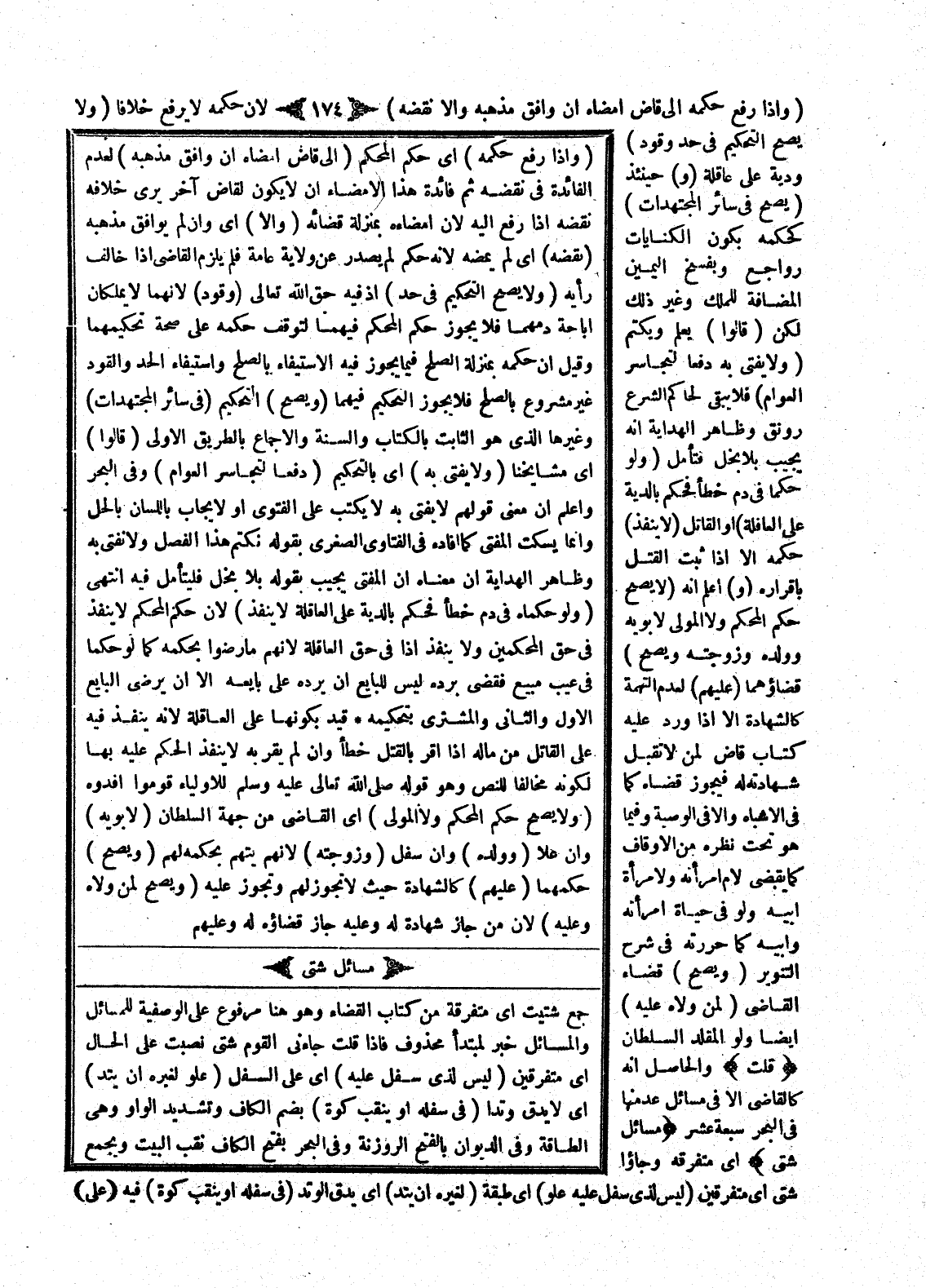 مَسَائِلُ شَتَّى جَمْعُ شَتِيتٍ أَيْ مُتَفَرِّقَةٌ مِنْ كِتَابِ الْقَضَاءِ وَهُوَ هُنَا مَرْفُوعٌ عَلَى الْوَصْفِيَّةِ لِلْمَسَائِلِ، وَالْمَسَائِلُ خَبَرٌ لِمُبْتَدَأٍ مَحْذُوفٍ، فَإِذَا قُلْتَ: جَاءَنِي الْقَوْمُ شَتَّى نَصَبْتَ عَلَى الْحَالِ أَيْ مُتَفَرِّقِينَ (لَيْسَ لِذِي سُفْلٍ عَلَيْهِ) أَيْ عَلَى السُّفْلِ (عُلُوٌّ لِغَيْرِهِ أَنْ يَتِدَ) أَيْ لَا يَدُقَّ وَتَدًا (فِي سُفْلِهِ أَوْ يَنْقُبَ كُوَّةً) بِضَمِّ الْكَافِ وَتَشْدِيدِ الْوَاوِ، وَهِيَ الطَّاقَةُ،.