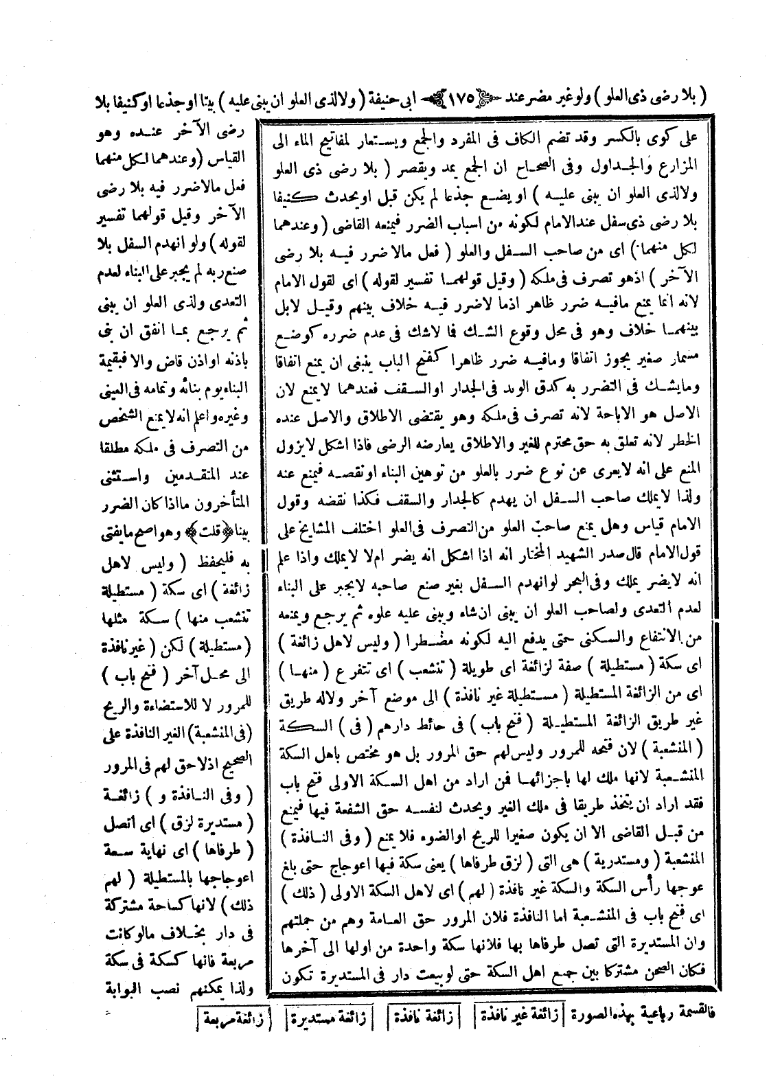 وَفِي الصِّحَاحِ أَنَّ الْجَمْعَ يُمَدُّ وَيُقْصَرُ (بِلَا رِضَى ذِي الْعُلُوِّ وَلَا لِذِي الْعُلُوِّ أَنْ يَبْنِيَ عَلَيْهِ) أَوْ يَضَعَ جِذْعًا لَمْ يَكُنْ قَبْلُ أَوْ يُحْدِثَ كَنِيفًا بِلَا رِضَى ذِي سُفْلٍ عِنْدَ الْإِمَامِ لِكَوْنِهِ مِنْ أَسْبَابِ الضَّرَرِ فَيَمْنَعُهُ الْقَاضِي (وَعِنْدَهُمَا لِكُلٍّ مِنْهُمَا) أَيْ مِنْ صَاحِبِ السُّفْلِ وَالْعُلُوِّ (فِعْلُ مَا لَا ضَرَرَ فِيهِ بِلَا رِضَى الْآخَرِ) إذْ هُوَ تَصَرُّفٌ فِي مِلْكِهِ (وَقِيلَ: قَوْلُهُمَا تَفْسِيرٌ لِقَوْلِهِ) أَيْ لِقَوْلِ الْإِمَامِ لِأَنَّهُ إنَّمَا يُمْنَعُ مَا فِيهِ ضَرَرٌ ظَاهِرٌ إذْ مَا لَا ضَرَرَ فِيهِ خِلَافٌ بَيْنَهُمْ، وَقِيلَ: لَا بَلْ بَيْنَهُمَا خِلَافٌ وَهُوَ فِي مَحَلِّ وُقُوعِ الشَّكِّ، فَمَا لَا شَكَّ فِي عَدَمِ ضَرَرِهِ كَوَضْعِ مِسْمَارٍ صَغِيرٍ يَجُوزُ اتِّفَاقًا وَمَا فِيهِ ضَرَرٌ ظَاهِرٌ كَفَتْحِ الْبَابِ يَنْبَغِي أَنْ يُمْنَعَ اتِّفَاقًا، وَمَا يُشَكُّ فِي التَّضَرُّرِ بِهِ كَدَقِّ الْوَتَدِ فِي الْجِدَارِ أَوْ السَّقْفِ فَعِنْدَهُمَا لَا يُمْنَعُ لِأَنَّ الْأَصْلَ هُوَ الْإِبَاحَةُ لِأَنَّهُ تَصَرُّفٌ فِي مِلْكِهِ وَهُوَ يَقْتَضِي الْإِطْلَاقَ، وَالْأَصْلُ عِنْدَهُ الْحَظْرُ لِأَنَّهُ تَعَلَّقَ بِهِ حَقٌّ مُحْتَرَمٌ لِلْغَيْرِ، وَالْإِطْلَاقُ يُعَارِضُهُ الرِّضَى فَإِذَا أَشْكَلَ لَا يَزُولُ الْمَنْعُ عَلَى أَنَّهُ لَا يُعَرَّى عَنْ نَوْعِ ضَرَرٍ بِالْعُلُوِّ مِنْ تَوْهِينِ الْبِنَاءِ أَوْ نَقْضِهِ فَيُمْنَعُ عَنْهُ، وَلِذَا لَا يَمْلِكُ صَاحِبُ السُّفْلِ أَنْ يَهْدِمَ كَالْجِدَارِ وَالسَّقْفِ فَكَذَا نَقْضُهُ، وَقَوْلُ الْإِمَامِ قِيَاسٌ وَهَلْ يُمْنَعُ صَاحِبُ الْعُلُوِّ مِنْ التَّصَرُّفِ فِي الْعُلُوِّ؟