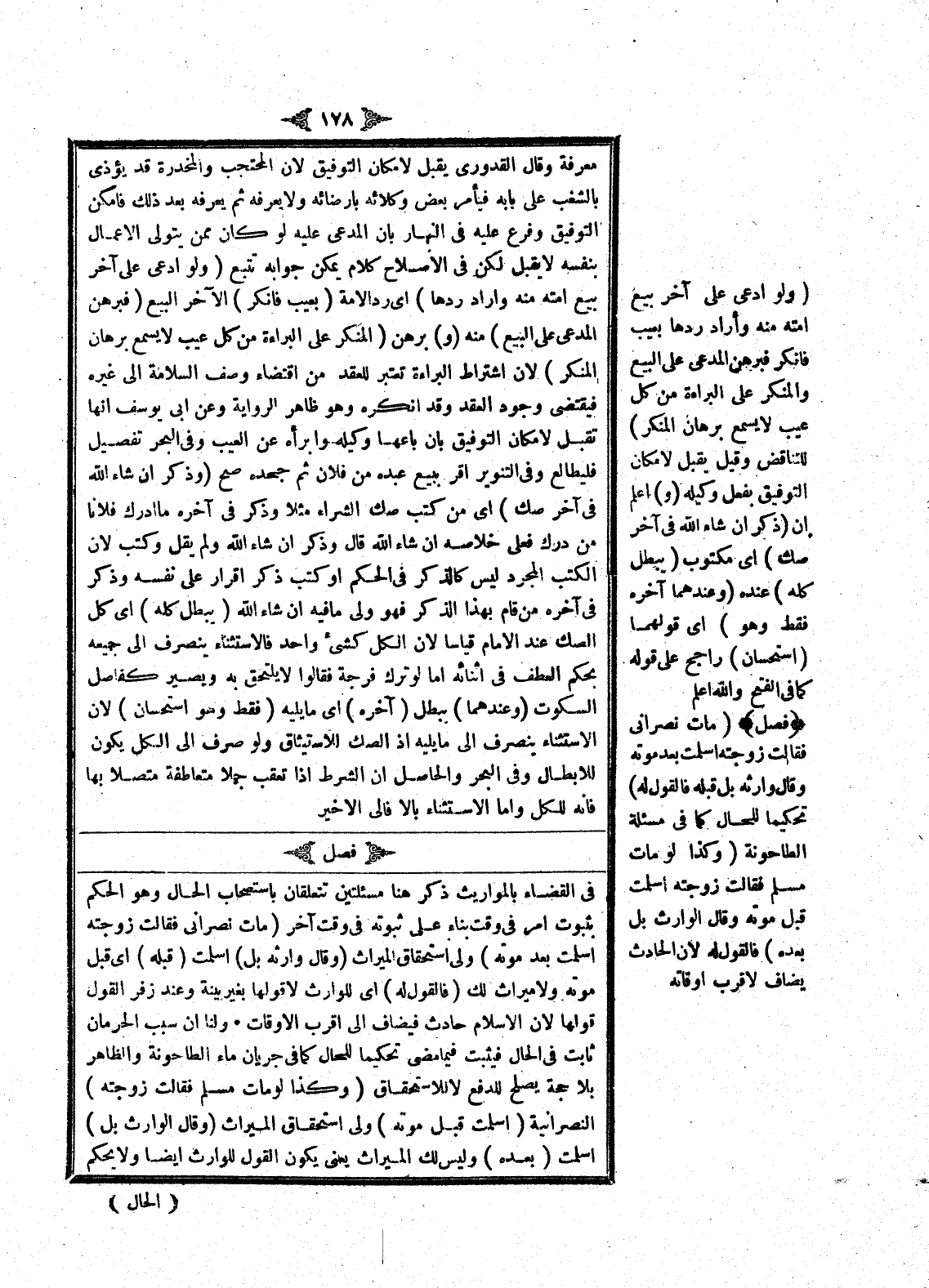 ِ ذَكَرَ هُنَا مَسْأَلَتَيْنِ تَتَعَلَّقَانِ بِاسْتِصْحَابِ الْحَالِ وَهُوَ الْحُكْمُ بِثُبُوتِ أَمْرٍ فِي وَقْتٍ بِنَاءً عَلَى ثُبُوتِهِ فِي وَقْتٍ آخَرَ (مَاتَ نَصْرَانِيٌّ فَقَالَتْ زَوْجَتُهُ أَسْلَمْتُ بَعْدَ مَوْتِهِ) وَلِي اسْتِحْقَاقُ الْمِيرَاثِ (وَقَالَ وَارِثُهُ بَلْ) أَسْلَمْتِ (قَبْلَهُ) أَيْ قَبْلَ مَوْتِهِ وَلَا مِيرَاثَ لَكِ (فَالْقَوْلُ لَهُ) أَيْ لِلْوَارِثِ لَا قَوْلُهَا بِغَيْرِ بَيِّنَةٍ وَعِنْدَ زُفَرَ الْقَوْلُ قَوْلُهَا لِأَنَّ الْإِسْلَامَ حَادِثٌ فَيُضَافُ إلَى أَقْرَبِ الْأَوْقَاتِ.