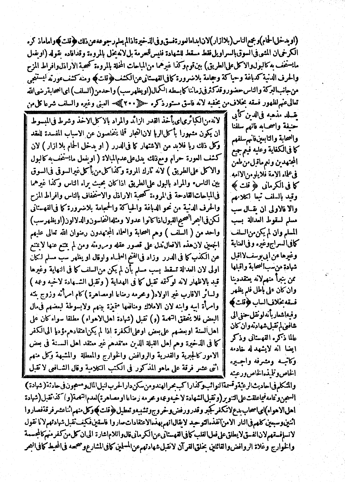 (، أَوْ يَدْخُلُ الْحَمَّامَ بِلَا إزَارٍ) ؛ لِأَنَّ كَشْفَ الْعَوْرَةِ حَرَامٌ وَمَعَ ذَلِكَ يَدُلُّ عَلَى عَدَمِ الْمُبَالَاةِ (، أَوْ يَفْعَلُ مَا يَسْتَخِفُّ بِهِ كَالْبَوْلِ وَالْأَكْلِ عَلَى الطَّرِيقِ) ؛ لِأَنَّهُ تَارِكُ الْمُرُوءَةِ وَكَذَا كُلُّ مَنْ يَأْكُلُ غَيْرَ السُّوقِيِّ فِي السُّوقِ بَيْنَ النَّاسِ وَالْمُرَادُ بِالْبَوْلِ عَلَى الطَّرِيقِ إذَا كَانَ بِحَيْثُ يَرَاهُ النَّاسُ وَكَذَا غَيْرُهُمَا فِي الْمُبَاحَاتِ الْقَادِحَةِ فِي الْمُرُوءَةِ كَصُحْبَةِ الْأَرَاذِلِ وَالِاسْتِخْفَافِ بِالنَّاسِ وَإِفْرَاطِ الْمَزْحِ وَالْحِرَفِ الدَّنِيَّةِ مِنْ نَحْوِ الدِّبَاغَةِ وَالْحِيَاكَةِ وَالْحِجَامَةِ بِلَا ضَرُورَةٍ كَمَا فِي الْقُهُسْتَانِيِّ لَكِنْ فِي الْبَحْرِ الصَّحِيحُ الْقَبُولُ إذَا كَانُوا عُدُولًا وَمِثْلُهُ النَّخَّاسُونَ وَالدَّلَّالُونَ (أَوْ يُظْهِرُ سَبَّ) وَاحِدٍ مِنْ (السَّلَفِ) وَهُمْ الصَّحَابَةُ وَالْعُلَمَاءُ الْمُجْتَهِدُونَ - رِضْوَانُ اللَّهِ تَعَالَى عَلَيْهِمْ أَجْمَعِينَ -؛ لِأَنَّ هَذِهِ الْأَفْعَالَ تَدُلُّ عَلَى قُصُورِ عَقْلِهِ وَمُرُوءَتِهِ وَمَنْ لَمْ يَمْتَنِعْ عَنْهَا لَا يَمْتَنِعُ عَنْ الْكَذِبِ كَمَا فِي الدُّرَرِ وَزَادَ فِي الْفَتْحِ الْعُلَمَاءُ وَلَوْ قَالَ، أَوْ يُظْهِرُ سَبَّ مُسْلِمٍ لَكَانَ أَوْلَى؛ لِأَنَّ الْعَدَالَةَ تَسْقُطُ بِسَبِّ مُسْلِمٍ بِأَنْ لَمْ يَكُنْ مِنْ السَّلَفِ كَمَا فِي النِّهَايَةِ وَغَيْرِهَا قَيَّدَ بِالْإِظْهَارِ؛ لِأَنَّهُ لَوْ كَتَمَهُ تُقْبَلُ كَمَا فِي الْهِدَايَةِ.