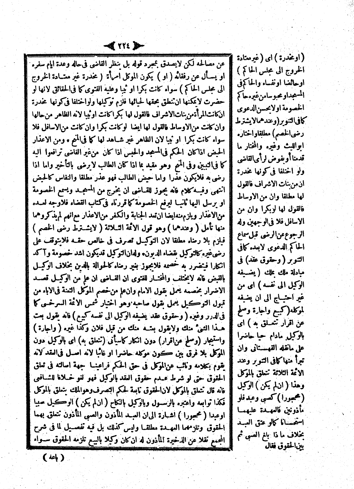 عَنْ مَصَالِحِهِ لَكِنْ لَا يُصَدَّقُ بِمُجَرَّدِ قَوْلِهِ بَلْ يَنْظُرُ الْقَاضِي فِي حَالِهِ وَعِدَّةِ أَيَّامِ سَفَرِهِ، أَوْ يَسْأَلُ عَنْ رُفَقَائِهِ (أَوْ) يَكُونُ الْمُوَكِّلُ امْرَأَةً (مُخَدَّرَةً غَيْرَ مُعْتَادَةِ الْخُرُوجِ إلَى مَجْلِسِ الْحَاكِمِ) سَوَاءٌ كَانَتْ بِكْرًا، أَوْ ثَيِّبًا وَعَلَيْهِ الْفَتْوَى كَمَا فِي الْحَقَائِقِ؛ لِأَنَّهَا لَوْ حَضَرَتْ لَا يُمْكِنُهَا أَنْ تَنْطِقَ بِحَقِّهَا لِحَيَائِهَا فَلَزِمَ تَوْكِيلُهَا وَلَوْ اخْتَلَفَا فِي كَوْنِهَا مُخَدَّرَةً إنْ كَانَتْ الْمَرْأَةُ مِنْ بَنَاتِ الْأَشْرَافِ فَالْقَوْلُ لَهَا بِكْرًا كَانَتْ، أَوْ ثَيِّبًا؛ لِأَنَّهُ الظَّاهِرُ مِنْ حَالِهَا وَإِنْ كَانَتْ مِنْ الْأَوْسَاطِ فَالْقَوْلُ لَهَا أَيْضًا لَوْ كَانَتْ بِكْرًا وَإِنْ كَانَتْ مِنْ الْأَسَافِلِ فَلَا سَوَاءٌ كَانَتْ بِكْرًا، أَوْ ثَيِّبًا؛ لِأَنَّ الظَّاهِرَ غَيْرُ شَاهِدٍ لَهَا كَمَا فِي الْمِنَحِ. وَمِنْ الْأَعْذَارِ الْحَيْضُ إذَا كَانَ الْحُكْمُ فِي الْمَسْجِدِ وَالْحَبْسُ إذَا كَانَ مِنْ غَيْرِ الْقَاضِي تَرَافَعُوا إلَيْهِ كَمَا فِي التَّبْيِينِ.