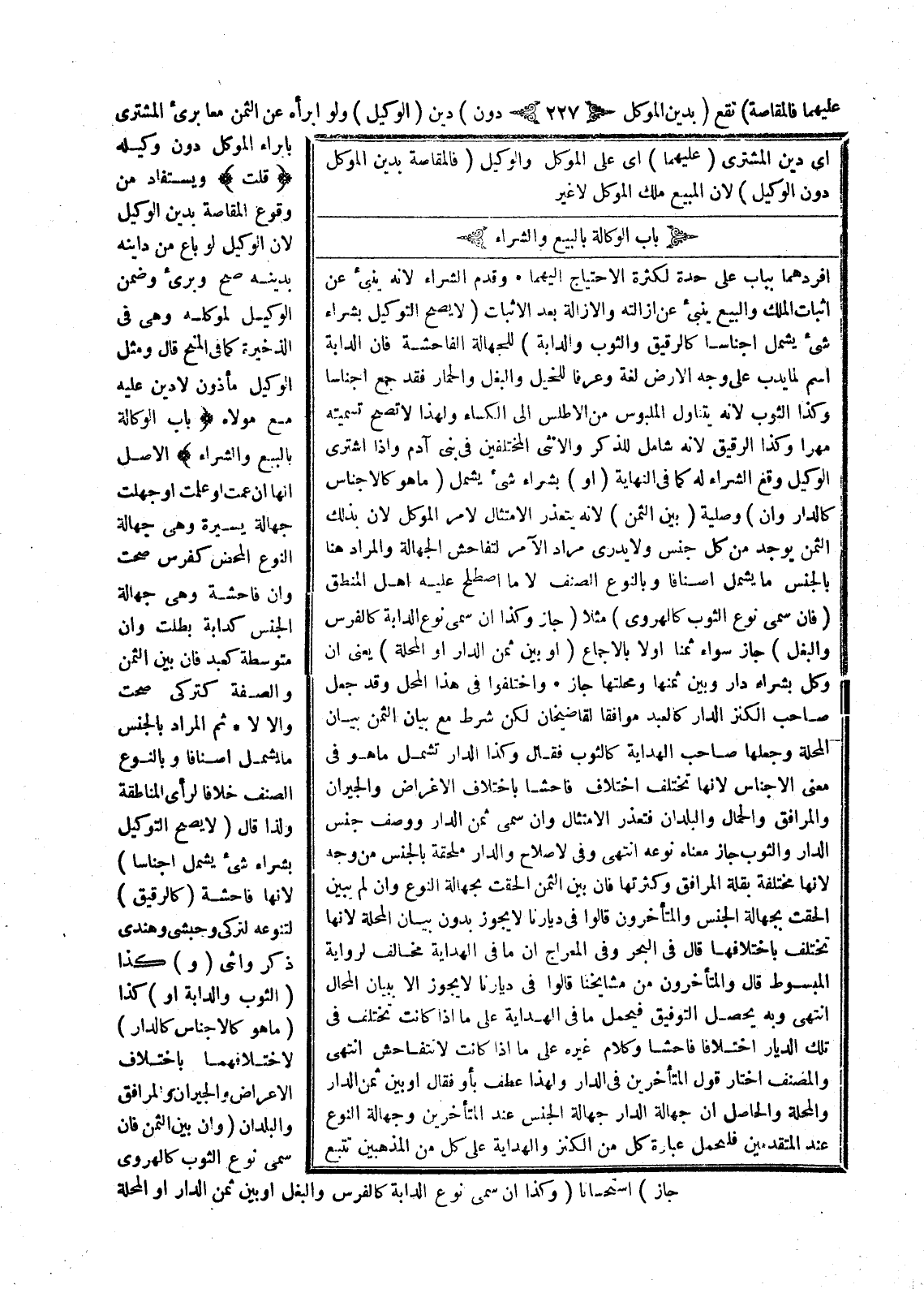 ِ أَفْرَدَهُمَا بِبَابٍ عَلَى حِدَةٍ لِكَثْرَةِ الِاحْتِيَاجِ إلَيْهِمَا وَقَدَّمَ الشِّرَاءَ؛ لِأَنَّهُ يُنْبِئُ عَنْ إثْبَاتِ الْمِلْكِ، وَالْبَيْعُ يُنْبِئُ عَنْ إزَالَتِهِ وَالْإِزَالَةُ بَعْدَ الْإِثْبَاتِ (لَا يَصِحُّ التَّوْكِيلُ بِشِرَاءِ شَيْءٍ يَشْمَلُ أَجْنَاسًا كَالرَّقِيقِ وَالثَّوْبِ وَالدَّابَّةِ) لِلْجَهَالَةِ الْفَاحِشَةِ فَإِنَّ الدَّابَّةَ اسْمٌ لِمَا يَدِبُّ عَلَى وَجْهِ الْأَرْضِ لُغَةً وَعُرْفًا لِلْخَيْلِ وَالْبَغْلِ وَالْحِمَارِ فَقَدْ جَمَعَ أَجْنَاسًا وَكَذَا الثَّوْبُ؛ لِأَنَّهُ يَتَنَاوَلُ الْمَلْبُوسَ مِنْ الْأَطْلَسِ إلَى الْكِسَاءِ؛ وَلِهَذَا لَا تَصِحُّ تَسْمِيَتُهُ مَهْرًا وَكَذَا الرَّقِيقُ؛ لِأَنَّهُ شَامِلٌ لِلذَّكَرِ وَالْأُنْثَى الْمُخْتَلِفَيْنِ فِي بَنِي آدَمَ وَإِذَا اشْتَرَى الْوَكِيلُ وَقَعَ الشِّرَاءُ لَهُ كَمَا فِي النِّهَايَةِ (أَوْ) بِشِرَاءِ شَيْءٍ يَشْمَلُ (مَا هُوَ كَالْأَجْنَاسِ كَالدَّارِ وَإِنْ) وَصْلِيَّةٌ (بَيْنَ الثَّمَنِ) ؛ لِأَنَّهُ يَتَعَذَّرُ الِامْتِثَالُ لِأَمْرِ الْمُوَكِّلِ؛ لِأَنَّ بِذَلِكَ الثَّمَنِ يُوجَدُ مِنْ كُلِّ جِنْسٍ وَلَا يَدْرِي مُرَادَ الْآمِرِ لِتَفَاحُشِ الْجَهَالَةِ وَالْمُرَادُ هُنَا بِالْجِنْسِ مَا يَشْمَلُ أَصْنَافًا وَبِالنَّوْعِ الصِّنْفُ لَا مَا اصْطَلَحَ عَلَيْهِ أَهْلُ الْمَنْطِقِ (فَإِنْ سَمَّى نَوْعَ الثَّوْبِ كَالْهَرَوِيِّ) مَثَلًا (جَازَ وَكَذَا إنْ سَمَّى نَوْعَ الدَّابَّةِ كَالْفَرَسِ وَالْبَغْلِ) جَازَ سَوَاءٌ ثَمَنًا، أَوْ لَا بِالْإِجْمَاعِ (أَوْ بَيْنَ ثَمَنِ الدَّارِ، أَوْ الْمَحَلَّةِ) يَعْنِي إنْ وُكِّلَ بِشِرَاءِ دَارٍ وَبَيَّنَ ثَمَنَهَا وَمَحَلَّتَهَا جَازَ وَاخْتَلَفُوا فِي هَذَا الْمَحَلِّ وَقَدْ جَعَلَ صَاحِبُ الْكَنْزِ الدَّارَ كَالْعَبْدِ مُوَافِقًا لِقَاضِي خَانْ لَكِنْ شَرَطَ مَعَ بَيَانِ الثَّمَنِ بَيَانَ الْمَحَلَّةِ وَجَعَلَهَا صَاحِبُ الْهِدَايَةِ كَالثَّوْبِ فَقَالَ وَكَذَا الدَّارُ تَشْمَلُ مَا هُوَ فِي مَعْنَى الْأَجْنَاسِ؛ لِأَنَّهَا تَخْتَلِفُ اخْتِلَافًا فَاحِشًا بِاخْتِلَافِ الْأَغْرَاضِ وَالْجِيرَانِ وَالْمَرَافِقِ وَالْحِمَالِ وَالْبُلْدَانِ فَتَعَذَّرَ الِامْتِثَالُ وَإِنْ سُمِّيَ ثَمَنُ الدَّارِ وَوُصِفَ جِنْسُ الدَّارِ وَالثَّوْبِ جَازَ مَعْنَاهُ نَوْعُهُ انْتَهَى.