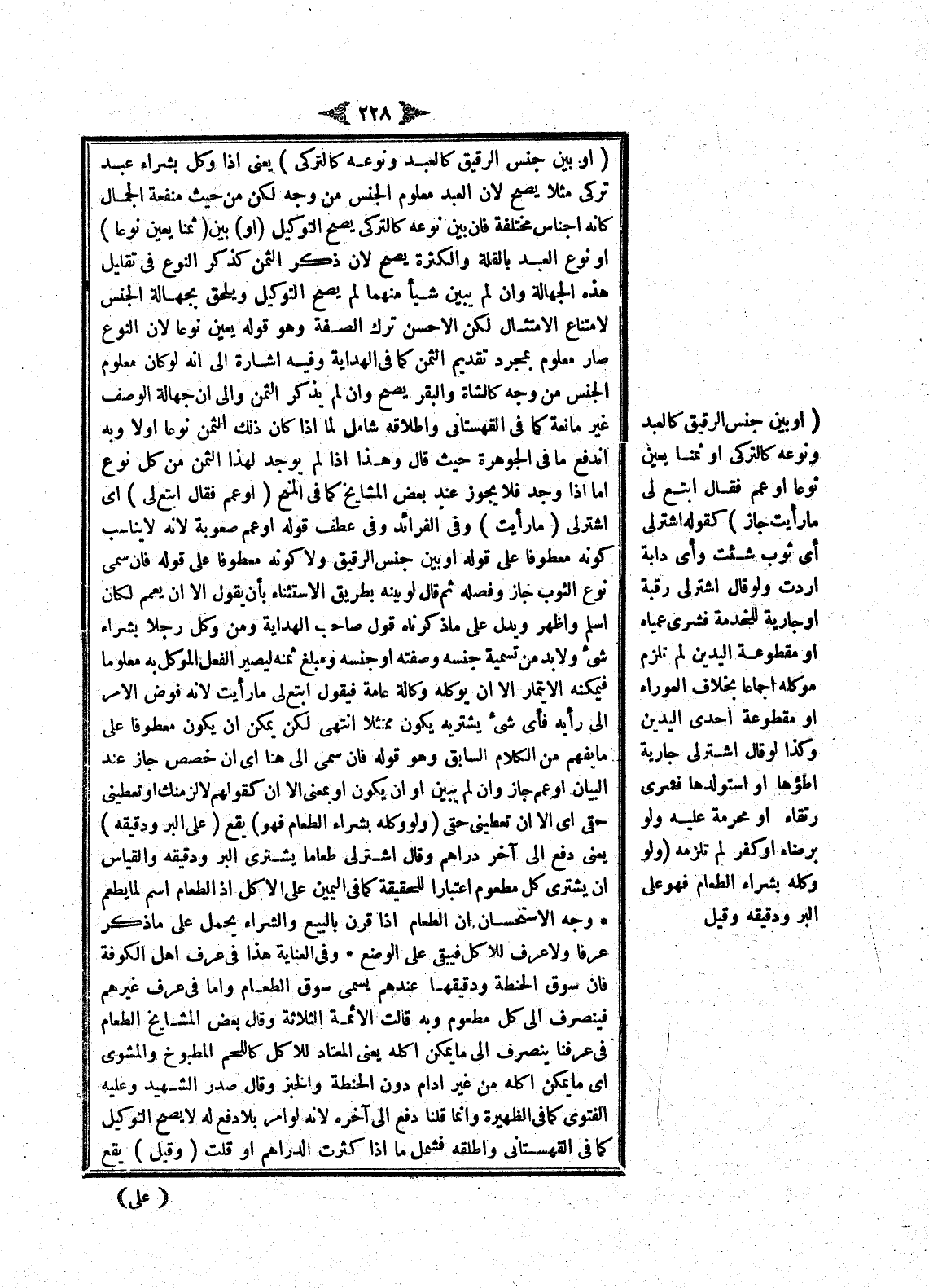 وَفِي الْفَرَائِدِ وَفِي عَطْفِ قَوْلِهِ، أَوْ عَمَّمَ صُعُوبَةٌ؛ لِأَنَّهُ لَا يُنَاسِبُ كَوْنَهُ مَعْطُوفًا عَلَى قَوْلِهِ، أَوْ بَيَّنَ جِنْسَ الرَّقِيقِ وَلَا كَوْنَهُ مَعْطُوفًا عَلَى قَوْلِهِ فَإِنْ سُمِّيَ نَوْعُ الثَّوْبِ جَازَ وَفَصَّلَهُ، ثُمَّ قَالَ لَوْ بَيَّنَهُ بِطَرِيقِ الِاسْتِثْنَاءِ بِأَنْ يَقُولَ إلَّا أَنْ يُعَمِّمَ لَكَانَ أَسْلَمَ وَأَظْهَرَ وَيَدُلُّ عَلَى مَا ذَكَرْنَاهُ قَوْلُ صَاحِبِ الْهِدَايَةِ وَمَنْ وَكَّلَ رَجُلًا بِشِرَاءِ شَيْءٍ وَلَا بُدَّ مِنْ تَسْمِيَةِ جِنْسِهِ وَصِفَتِهِ، أَوْ جِنْسِهِ وَمَبْلَغِ ثَمَنِهِ لِيَصِيرَ الْفِعْلُ الْمُوَكَّلُ بِهِ مَعْلُومًا فَيُمْكِنُهُ الِائْتِمَارُ إلَّا أَنْ يُوَكِّلَهُ وَكَالَةً عَامَّةً فَيَقُولُ ابْتَعْ لِي مَا رَأَيْت؛ لِأَنَّهُ فَوَّضَ الْأَمْرَ إلَى رَأْيِهِ فَأَيُّ شَيْءٍ يَشْتَرِيه يَكُونُ مُمْتَثِلًا انْتَهَى.