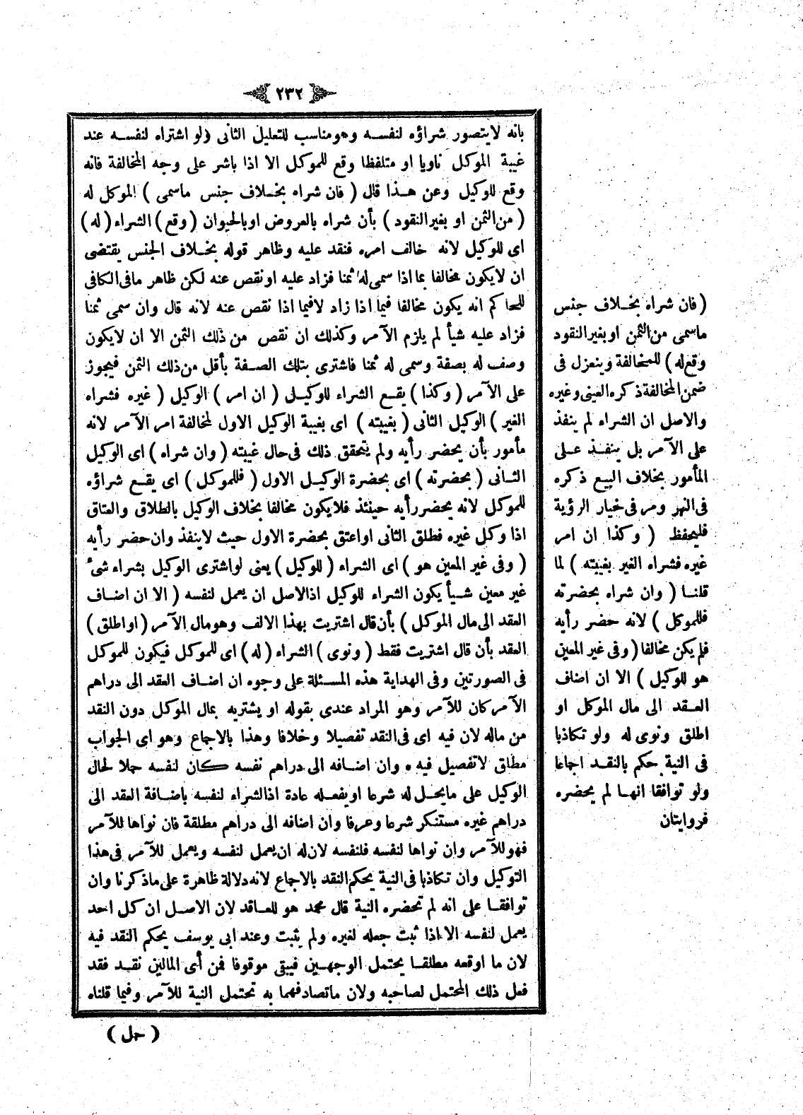 وَعَنْ هَذَا قَالَ (فَإِنْ شَرَاهُ بِخِلَافِ جِنْسِ مَا سَمَّى) الْمُوَكَّلُ لَهُ (مِنْ الثَّمَنِ أَوْ بِغَيْرِ النُّقُودِ) بِأَنْ شَرَاهُ بِالْعُرُوضِ، أَوْ بِالْحَيَوَانِ (وَقَعَ) الشِّرَاءُ (لَهُ) أَيْ لِلْوَكِيلِ؛ لِأَنَّهُ خَالَفَ أَمْرَهُ فَنُقِدَ عَلَيْهِ، وَظَاهِرُ قَوْلِهِ بِخِلَافِ الْجِنْسِ يَقْتَضِي أَنْ لَا يَكُونَ مُخَالِفًا بِمَا إذَا سَمَّى لَهُ ثَمَنًا فَزَادَ عَلَيْهِ، أَوْ نَقَصَ عَنْهُ لَكِنْ ظَاهِرُ مَا فِي الْكَافِي لِلْحَاكِمِ أَنَّهُ يَكُونُ مُخَالِفًا فِيمَا إذَا زَادَ لَا فِيمَا إذَا نَقَصَ عَنْهُ؛ لِأَنَّهُ قَالَ وَإِنْ سَمَّى ثَمَنًا فَزَادَ عَلَيْهِ شَيْئًا لَمْ يَلْزَمْ الْآمِرَ، وَكَذَلِكَ إنْ نَقَصَ مِنْ ذَلِكَ الثَّمَنِ إلَّا أَنْ لَا يَكُونَ وَصَفَ لَهُ بِصِفَةٍ وَسَمَّى لَهُ ثَمَنًا فَاشْتَرَى بِتِلْكَ الصِّفَةِ بِأَقَلَّ مِنْ ذَلِكَ الثَّمَنِ فَيَجُوزُ عَلَى الْآمِرِ.