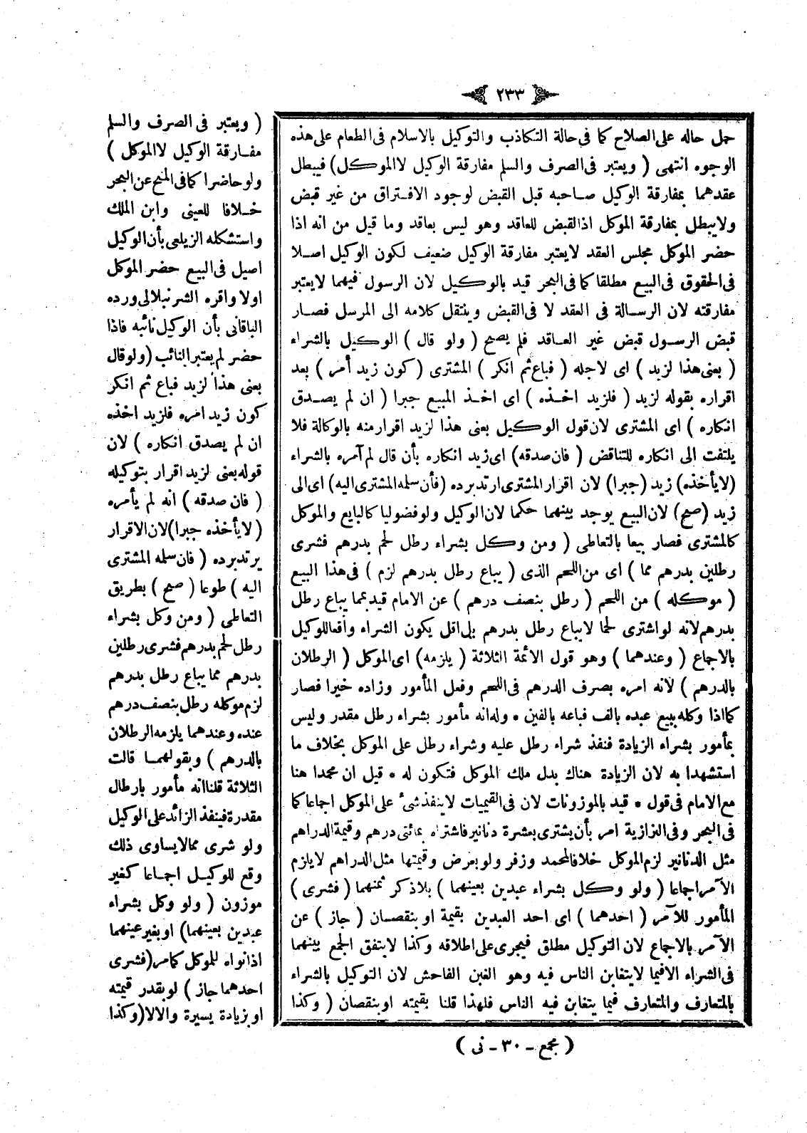 (وَمَنْ وَكَّلَ بِشِرَاءِ رِطْلِ لَحْمٍ بِدِرْهَمٍ فَشَرَى رِطْلَيْنِ بِدِرْهَمٍ مِمَّا) أَيْ مِنْ اللَّحْمِ الَّذِي (يُبَاعُ رِطْلٌ بِدِرْهَمٍ لَزِمَ) فِي هَذَا الْبَيْعِ (مُوَكِّلَهُ) مِنْ اللَّحْمِ (رِطْلٌ بِنِصْفِ دِرْهَمٍ) عَنْ الْإِمَامِ قَيَّدَ بِمِمَّا يُبَاعُ رِطْلٌ بِدِرْهَمٍ؛ لِأَنَّهُ لَوْ اشْتَرَى لَحْمًا لَا يُبَاعُ رِطْلٌ بِدِرْهَمٍ بَلْ أَقَلَّ يَكُونُ الشِّرَاءُ وَاقِعًا لِلْوَكِيلِ بِالْإِجْمَاعِ (وَعِنْدَهُمَا) وَهُوَ قَوْلُ الْأَئِمَّةِ الثَّلَاثَةِ (يَلْزَمُهُ) أَيْ الْمُوَكِّلَ (الرِّطْلَانِ بِالدِّرْهَمِ) ؛ لِأَنَّهُ أَمَرَهُ بِصَرْفِ الدِّرْهَمِ فِي اللَّحْمِ وَفَعَلَ الْمَأْمُورُ وَزَادَهُ خَيْرًا فَصَارَ كَمَا إذَا وَكَّلَهُ بِبَيْعِ عَبْدِهِ بِأَلْفٍ فَبَاعَهُ بِأَلْفَيْنِ وَلَهُ أَنَّهُ مَأْمُورٌ بِشِرَاءِ رِطْلٍ مُقَدَّرٍ وَلَيْسَ بِمَأْمُورٍ بِشِرَاءِ الزِّيَادَةِ فَنَفَذَ شِرَاءُ رِطْلٍ عَلَيْهِ وَشِرَاءُ رِطْلٍ عَلَى الْمُوَكِّلِ بِخِلَافِ مَا اسْتَشْهَدَا بِهِ؛ لِأَنَّ الزِّيَادَةَ هُنَاكَ بَدَلُ مِلْكِ الْمُوَكِّلِ فَتَكُونُ لَهُ قِيلَ إنَّ مُحَمَّدًا هُنَا مَعَ الْإِمَامِ فِي قَوْلِ قَيَّدَ بِالْمَوْزُونَاتِ؛ لِأَنَّ فِي الْقِيَمِيَّاتِ لَا يَنْفُذُ شَيْءٌ عَلَى الْمُوَكِّلِ إجْمَاعًا كَمَا فِي الْبَحْرِ.