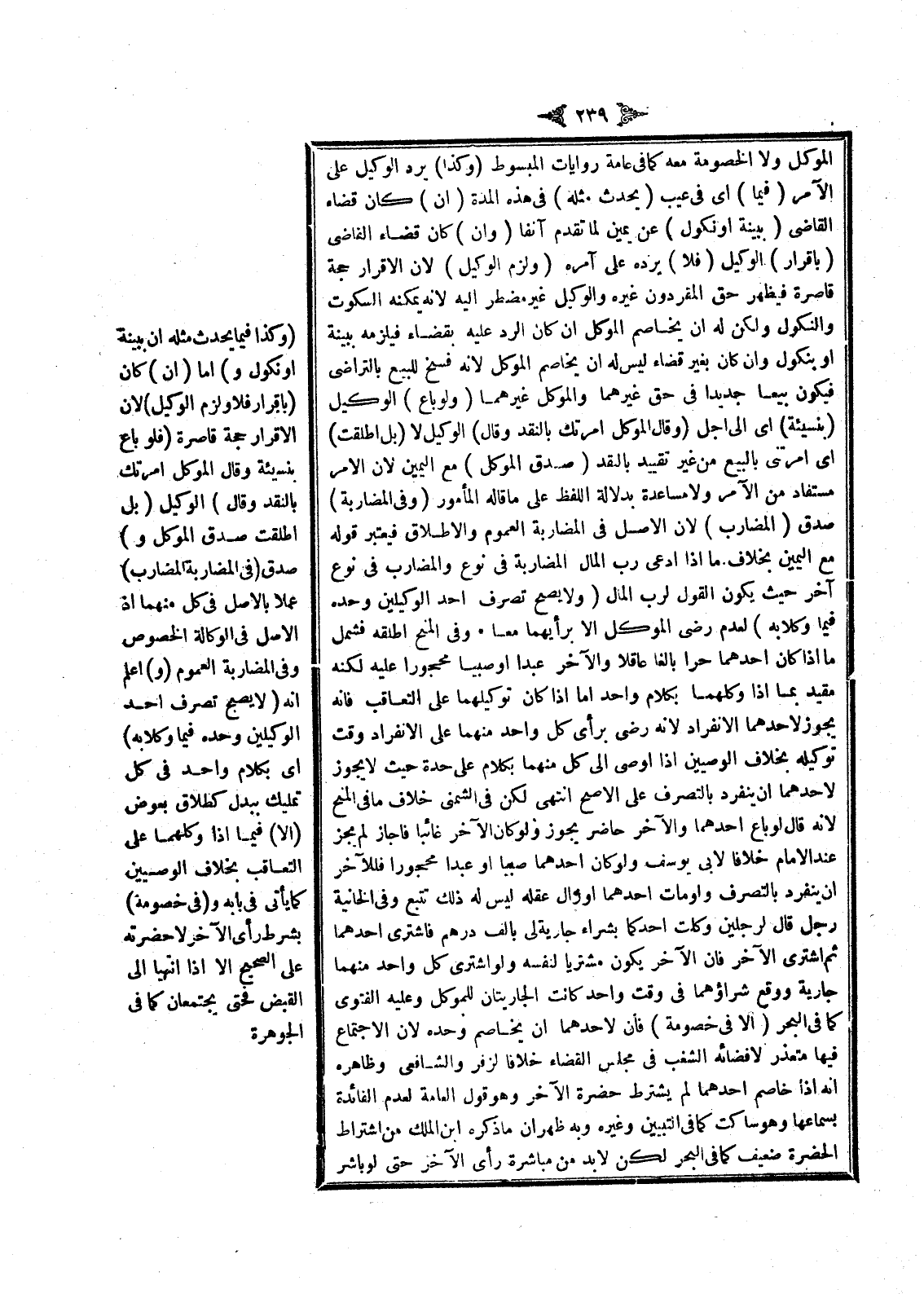 وَفِي الْخَانِيَّةِ رَجُلٌ قَالَ لِرَجُلَيْنِ: وَكَّلْتُ أَحَدَكُمَا بِشِرَاءِ جَارِيَةٍ لِي بِأَلْفِ دِرْهَمٍ فَاشْتَرَى أَحَدُهُمَا ثُمَّ اشْتَرَى الْآخَرُ فَإِنَّ الْآخَرَ يَكُونُ مُشْتَرِيًا لِنَفْسِهِ وَلَوْ اشْتَرَى كُلُّ وَاحِدٍ مِنْهُمَا جَارِيَةً وَوَقَعَ شِرَاؤُهُمَا فِي وَقْتٍ وَاحِدٍ كَانَتْ الْجَارِيَتَانِ لِلْمُوَكِّلِ وَعَلَيْهِ الْفَتْوَى كَمَا فِي الْبَحْرِ (إلَّا فِي خُصُومَةٍ) فَإِنَّ لِأَحَدِهِمَا أَنْ يُخَاصِمَ وَحْدَهُ؛ لِأَنَّ الِاجْتِمَاعَ فِيهَا مُتَعَذِّرٌ لِإِفْضَائِهِ الشَّغَبَ فِي مَجْلِسِ الْقَضَاءِ خِلَافًا لِزُفَرَ وَالشَّافِعِيِّ وَظَاهِرُهُ أَنَّهُ إذَا خَاصَمَ أَحَدُهُمَا لَمْ يُشْتَرَطْ حَضْرَةُ الْآخَرِ، وَهُوَ قَوْلُ الْعَامَّةِ لِعَدَمِ الْفَائِدَةِ بِسَمَاعِهَا، وَهُوَ سَاكِتٌ كَمَا فِي التَّبْيِينِ وَغَيْرِهِ وَبِهِ ظَهَرَ أَنَّ مَا ذَكَرَهُ ابْنُ الْمَلِكِ مِنْ اشْتِرَاطِ الْحَضْرَةِ ضَعِيفٌ كَمَا فِي الْبَحْرِ لَكِنْ لَا بُدَّ مِنْ مُبَاشَرَةِ رَأْيِ الْآخَرِ حَتَّى لَوْ بَاشَرَ