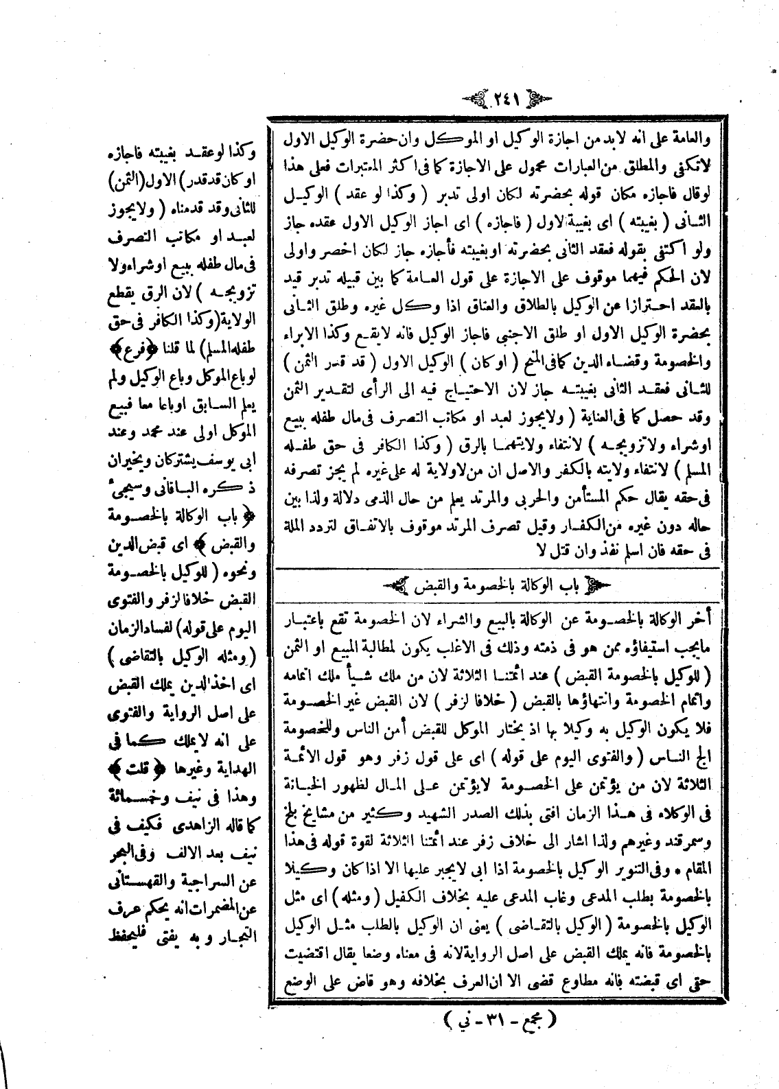 ِ أَخَّرَ الْوَكَالَةَ بِالْخُصُومَةِ عَنْ الْوَكَالَةِ بِالْبَيْعِ وَالشِّرَاءِ؛ لِأَنَّ الْخُصُومَةَ تَقَعُ بِاعْتِبَارِ مَا يَجِبُ اسْتِيفَاؤُهُ مِمَّنْ هُوَ فِي ذِمَّتِهِ وَذَلِكَ فِي الْأَغْلَبِ يَكُونُ لِمُطَالَبَةِ الْمَبِيعِ أَوْ الثَّمَنِ (لِلْوَكِيلِ بِالْخُصُومَةِ الْقَبْضُ) عِنْدَ أَئِمَّتِنَا الثَّلَاثَةِ؛ لِأَنَّ مَنْ مَلَكَ شَيْئًا مَلَكَ إتْمَامَهُ، وَإِتْمَامُ الْخُصُومَةِ وَانْتِهَاؤُهَا بِالْقَبْضِ (خِلَافًا لَزُفَرَ) ؛ لِأَنَّ الْقَبْضَ غَيْرُ الْخُصُومَةِ فَلَا يَكُونُ الْوَكِيلُ بِهِ وَكِيلًا بِهَا إذْ يَخْتَارُ الْمُوَكِّلُ لِلْقَبْضِ آمَنَ النَّاسِ وَلِلْخُصُومَةِ أَلَجَّ النَّاسِ (وَالْفَتْوَى الْيَوْمَ عَلَى قَوْلِهِ) أَيْ عَلَى قَوْلِ زُفَرَ وَهُوَ قَوْلُ الْأَئِمَّةِ الثَّلَاثَةِ؛ لِأَنَّ مَنْ يُؤْتَمَنُ عَلَى الْخُصُومَةِ لَا يُؤْتَمَنُ عَلَى الْمَالِ لِظُهُورِ الْخِيَانَةِ فِي الْوُكَلَاءِ فِي هَذَا الزَّمَانِ أَفْتَى بِذَلِكَ الصَّدْرُ الشَّهِيدُ وَكَثِيرٌ مِنْ مَشَايِخِ بَلْخِي وَسَمَرْقَنْدَ وَغَيْرِهِمْ وَلِذَا أَشَارَ إلَى خِلَافِ زُفَرَ عِنْدَ أَئِمَّتِنَا الثَّلَاثَةِ لِقُوَّةِ قَوْلِهِ فِي هَذَا الْمَقَامِ.