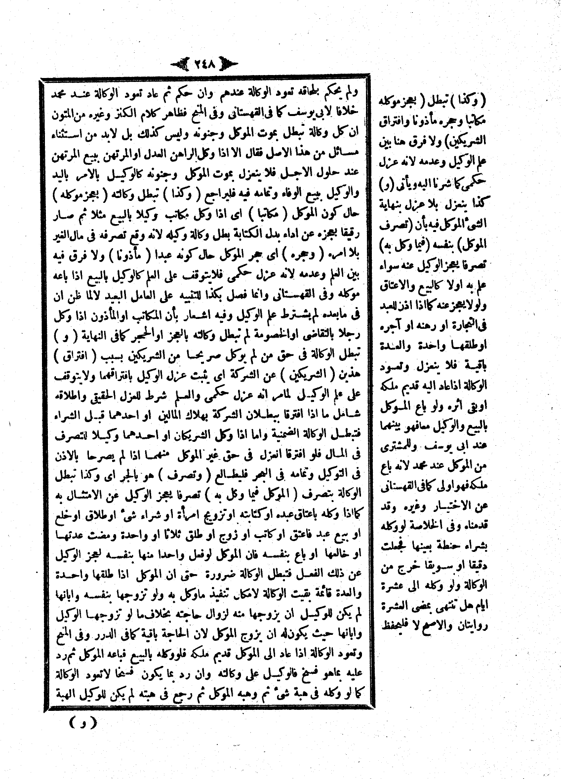 وَفِي الْقُهُسْتَانِيِّ وَإِنَّمَا فَصَلَ بِكَذَا لِلتَّنْبِيهِ عَلَى الْعَامِلِ الْبَعِيدِ لَا لِمَا ظَنَّ أَنَّ فِي مَا بَعْدَهُ لَمْ يَشْتَرِطْ عِلْمَ الْوَكِيلِ وَفِيهِ إشْعَارٌ بِأَنَّ الْمُكَاتَبَ أَوْ الْمَأْذُونَ إذَا وَكَّلَ رَجُلًا بِالتَّقَاضِي أَوْ الْخُصُومَةِ لَمْ تَبْطُلْ وَكَالَتُهُ بِالْعَجْزِ أَوْ الْحِجْرِ كَمَا فِي النِّهَايَةِ (وَ) تَبْطُلُ الْوَكَالَةُ فِي حَقِّ مَنْ لَمْ يُوَكِّلْ صَرِيحًا مِنْ الشَّرِيكَيْنِ بِسَبَبِ (افْتِرَاقِ) ، هَذَيْنِ (الشَّرِيكَيْنِ) عَنْ الشَّرِكَةِ أَيْ يَثْبُتُ عَزْلُ الْوَكِيلِ بِافْتِرَاقِهِمَا وَلَا يَتَوَقَّفُ عَلَى عِلْمِ الْوَكِيلِ لِمَا مَرَّ أَنَّهُ عَزْلٌ حُكْمِيٌّ وَالْعِلْمُ شَرْطٌ لِلْعَزْلِ الْحَقِيقِيِّ وَإِطْلَاقُهُ شَامِلٌ مَا إذَا افْتَرَقَا بِبُطْلَانِ الشَّرِكَةِ بِهَلَاكِ الْمَالَيْنِ أَوْ أَحَدِهِمَا قَبْلَ الشِّرَاءِ فَتَبْطُلُ الْوَكَالَةُ الضِّمْنِيَّةُ، وَأَمَّا إذَا وَكَّلَ الشَّرِيكَانِ أَوْ أَحَدُهُمَا وَكِيلًا لِلتَّصَرُّفِ فِي الْمَالِ فَلَوْ افْتَرَقَا انْعَزَلَ فِي حَقِّ غَيْرِ الْمُوَكِّلِ مِنْهُمَا إذَا لَمْ يُصَرِّحَا بِالْإِذْنِ فِي التَّوْكِيلِ وَتَمَامُهُ فِي الْبَحْرِ فَلْيُطَالَعْ (وَتَصَرُّفِ) هُوَ بِالْجَرِّ أَيْ وَكَذَا تَبْطُلُ الْوَكَالَةُ بِتَصَرُّفِ (الْمُوَكَّلِ فِيمَا وُكِّلَ بِهِ) تَصَرُّفًا يَعْجِزُ الْوَكِيلُ عَنْ الِامْتِثَالِ بِهِ كَمَا إذَا وَكَّلَهُ بِإِعْتَاقِ عَبْدِهِ أَوْ كِتَابَتِهِ أَوْ تَزْوِيجِ امْرَأَةٍ أَوْ شِرَاءِ شَيْءٍ أَوْ طَلَاقٍ أَوْ خُلْعٍ أَوْ بَيْعِ عَبْدٍ فَأَعْتَقَ أَوْ كَاتَبَ أَوْ زَوَّجَ أَوْ طَلَّقَ ثَلَاثًا أَوْ وَاحِدَةً وَمَضَتْ عِدَّتُهَا أَوْ خَالَعَهَا أَوْ بَاعَ بِنَفْسِهِ، فَإِنَّ الْمُوَكِّلَ لَوْ فَعَلَ وَاحِدًا مِنْهَا بِنَفْسِهِ لَعَجَزَ الْوَكِيلُ عَنْ ذَلِكَ الْفِعْلِ فَتَبْطُلُ الْوَكَالَةُ ضَرُورَةً حَتَّى أَنَّ الْمُوَكِّلَ إذَا طَلَّقَهَا وَاحِدَةً وَالْعِدَّةُ قَائِمَةٌ بَقِيَتْ الْوَكَالَةُ لِإِمْكَانِ تَنْفِيذِ مَا وُكِّلَ بِهِ وَلَوْ تَزَوَّجَهَا بِنَفْسِهِ وَأَبَانَهَا لَمْ يَكُنْ لِلْوَكِيلِ أَنْ يُزَوِّجَهَا مِنْهُ لِزَوَالِ حَاجَتِهِ بِخِلَافِ مَا لَوْ تَزَوَّجَهَا الْوَكِيلُ وَأَبَانَهَا حَيْثُ يَكُونُ لَهُ أَنْ يُزَوِّجَ الْمُوَكِّلَ؛ لِأَنَّ الْحَاجَةَ بَاقِيَةٌ كَمَا فِي الدُّرَرِ.