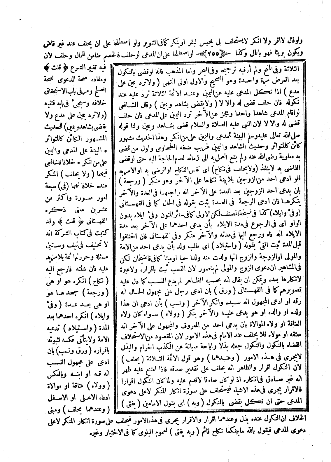 وَفِي الْقُهُسْتَانِيِّ فَإِنْ اخْتَلَفُوا قَبْلَ الْمُدَّةِ ثَبَتَ الْفَيْءُ بِقَوْلِهِ (وَاسْتِيلَادٍ) أَيْ طَلَبُ وَلَدٍ بِأَنْ يَدَّعِيَ أَحَدٌ مِنْ الْأَمَةِ وَالْمَوْلَى أَوْ الزَّوْجَةِ وَالزَّوْجِ أَنَّهَا وَلَدَتْ مِنْهُ وَلَدًا حَيًّا أَوْ مَيِّتًا كَمَا فِي قَاضِي خَانْ لَكِنْ فِي الْمَشَاهِيرِ أَنَّ دَعْوَى الزَّوْجِ وَالْمَوْلَى لَمْ يُتَصَوَّرْ؛ لِأَنَّ النَّسَبَ ثَبَتَ بِإِقْرَارِهِ وَلَا عِبْرَةَ لِإِنْكَارِهَا بَعْدَهُ وَيُمْكِنُ أَنْ يُقَالَ أَنَّهُ بِحَسَبِ الظَّاهِرِ لَمْ يَدَّعِ النَّسَبَ كَمَا دَلَّ عَلَيْهِ تَصْوِيرُهُمْ كَمَا فِي الْقُهُسْتَانِيِّ (وَرِقٍ) بِأَنْ ادَّعَى رَجُلٌ عَلَى مَجْهُولِ الْحَالِ أَنَّهُ رِقُّهُ أَوْ ادَّعَى الْمَجْهُولُ أَنَّهُ سَيِّدُهُ وَأَنْكَرَ الْآخَرُ (وَنَسَبٍ) بِأَنْ ادَّعَى أَنَّ، هَذَا وَلَدُهُ أَوْ وَالِدُهُ أَوْ هُوَ يُدَّعَى عَلَيْهِ وَالْآخَرُ يُنْكِرُ (وَوَلَاءٍ) سَوَاءٌ كَانَ وَلَاءُ الْعَتَاقَةِ أَوْ وَلَاءُ الْمُوَالَاةِ بِأَنْ يَدَّعِي أَحَدٌ مِنْ الْمَعْرُوفِ وَالْمَجْهُولِ عَلَى الْآخَرِ أَنَّهُ مُعْتَقُهُ أَوْ مَوْلَاهُ فَلَا يَحْلِفُ عِنْدَ الْإِمَامِ فِي هَذِهِ الْأُمُورِ؛ لِأَنَّ الْمَقْصُودَ مِنْ الِاسْتِحْلَافِ الْقَضَاءُ بِالنُّكُولِ وَالنُّكُولُ جَعَلَهُ بَذْلًا وَإِبَاحَةً صِيَانَةً عَنْ الْكَذِبِ الْحَرَامِ وَالْبَذْلُ لَا يَجْرِي فِي هَذِهِ الْأُمُورِ (وَعِنْدَهُمَا) وَهُوَ قَوْلُ الْأَئِمَّةِ الثَّلَاثَةِ (يَحْلِفُ) ؛ لِأَنَّ النُّكُولَ إقْرَارٌ وَالظَّاهِرُ أَنَّهُ يَحْلِفُ عَلَى تَقْدِيرِ صِدْقِهِ فَإِذَا امْتَنَعَ عَلَيْهِ ظَهَرَ أَنَّهُ غَيْرُ صَادِقٍ فِي إنْكَارِهِ إذْ لَوْ كَانَ صَادِقًا لَأَقْدَمَ عَلَيْهِ وَلَمَا كَانَ النُّكُولُ إقْرَارًا فَالْإِقْرَارُ يَجْرِي فِي هَذِهِ الْأَشْيَاءِ فَيُسْتَحْلَفُ عَلَى صُورَةِ إنْكَارِ الْمُنْكِرِ لَا عَلَى دَعْوَى الْمُدَّعِي حَتَّى إنْ نَكَلَ يَقْضِي بِالنُّكُولِ (وَبِهِ) أَيْ بِقَوْلِ الْإِمَامَيْنِ (يُفْتَى)