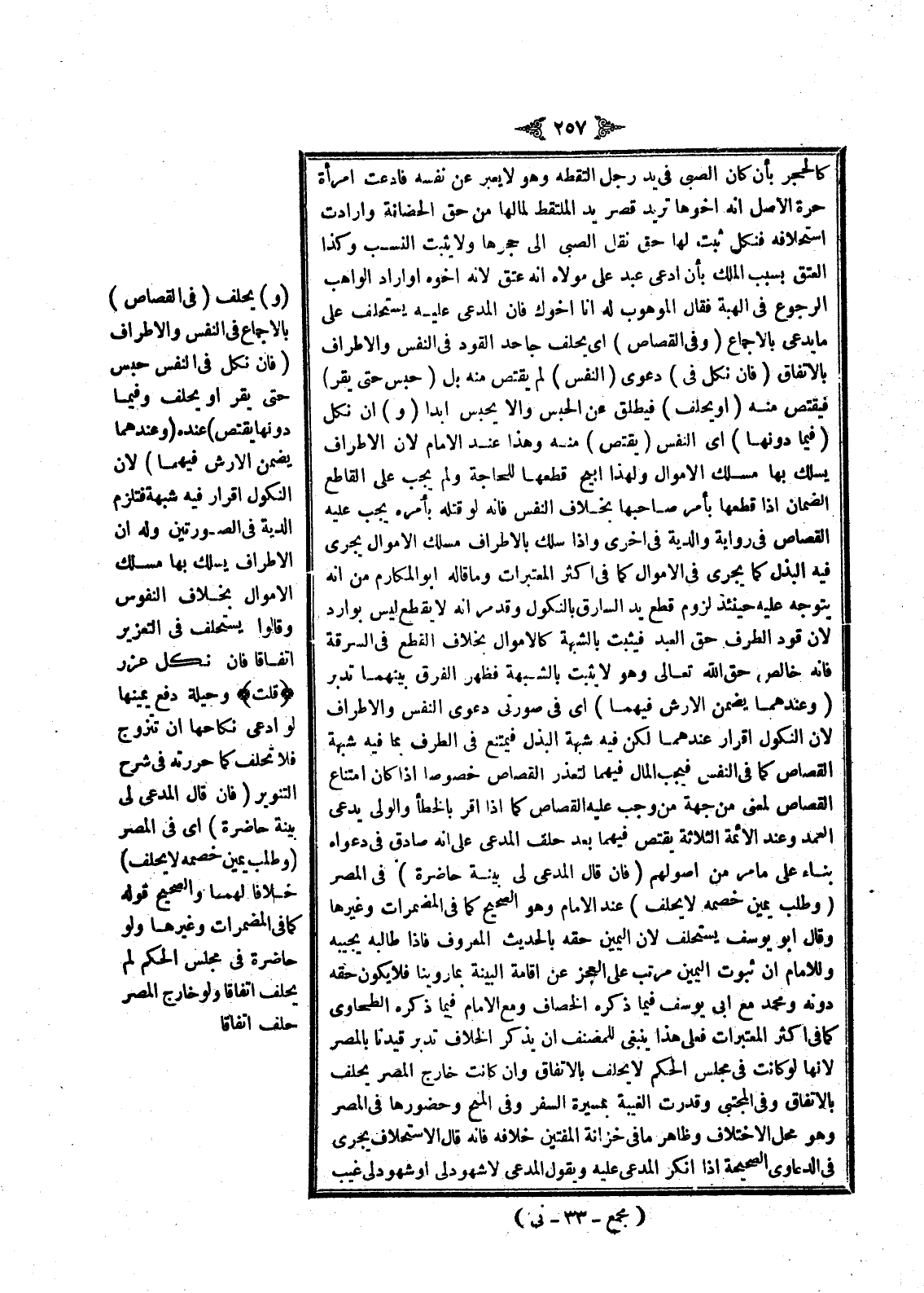 كَالْحَجْرِ بِأَنْ كَانَ الصَّبِيُّ فِي يَدِ رَجُلٍ الْتَقَطَهُ، وَهُوَ لَا يُعَبِّرُ عَنْ نَفْسِهِ فَادَّعَتْ امْرَأَةٌ حُرَّةُ الْأَصْلِ أَنَّهُ أَخُوهَا تُرِيدُ قَصْرَ يَدِ الْمُلْتَقِطِ لِمَالِهَا مِنْ حَقِّ الْحَضَانَةِ وَأَرَادَتْ اسْتِحْلَافَهُ فَنَكَلَ ثَبَتَ حَقُّ نَقْلِ الصَّبِيِّ إلَى حِجْرِهَا وَلَا يَثْبُتُ النَّسَبُ وَكَذَا الْعِتْقُ بِسَبَبِ الْمِلْكِ بِأَنْ ادَّعَى عَبْدٌ عَلَى مَوْلَاهُ أَنَّهُ عَتَقَ؛ لِأَنَّهُ أَخُوهُ أَوْ أَرَادَ الْوَاهِبُ الرُّجُوعَ فِي الْهِبَةِ فَقَالَ الْمَوْهُوبُ: لَهُ أَنَا أَخُوك فَإِنَّ الْمُدَّعَى عَلَيْهِ يُسْتَحْلَفُ عَلَى مَا يَدَّعِي بِالْإِجْمَاعِ (وَفِي الْقِصَاصِ) أَيْ يَحْلِفُ جَاحِدُ الْقَوَدِ فِي النَّفْسِ وَالْأَطْرَافِ بِالِاتِّفَاقِ (فَإِنْ نَكَلَ فِي) دَعْوَى (النَّفْسِ) لَمْ يُقْتَصَّ مِنْهُ بَلْ (حُبِسَ حَتَّى يُقِرَّ) فَيُقْتَصَّ مِنْهُ (أَوْ يَحْلِفَ) فَيُطْلَقَ عَنْ الْحَبْسِ وَإِلَّا يُحْبَسُ أَبَدًا.