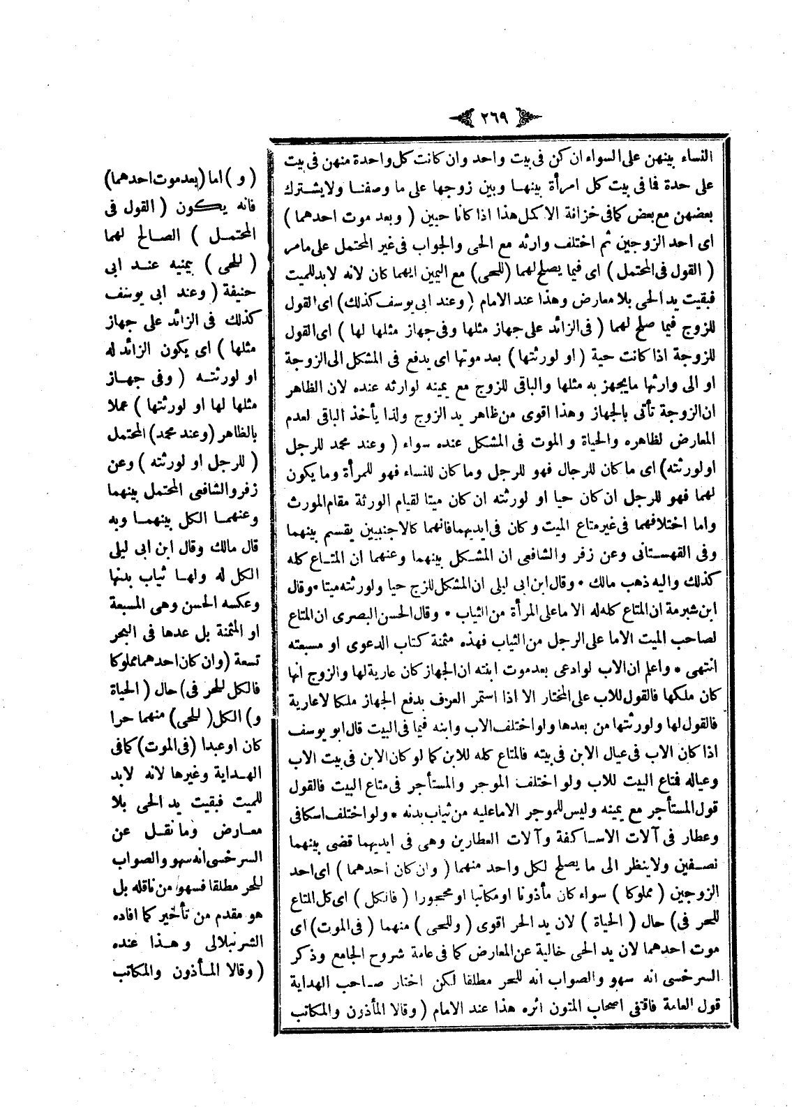 النِّسَاءِ بَيْنَهُنَّ عَلَى السَّوَاءِ إنْ كُنَّ فِي بَيْتٍ وَاحِدٍ، وَإِنْ كَانَتْ كُلُّ وَاحِدَةٍ مِنْهُنَّ فِي بَيْتٍ عَلَى حِدَةٍ فَمَا فِي بَيْتِ كُلِّ امْرَأَةٍ بَيْنَهَا وَبَيْنَ زَوْجِهَا عَلَى مَا وَصَفْنَا وَلَا يَشْتَرِك بَعْضُهُنَّ مَعَ بَعْضٍ كَمَا فِي خِزَانَةِ الْأَكْمَلِ، هَذَا إذَا كَانَا حَيَّيْنِ (وَبَعْدَ مَوْتِ أَحَدِهِمَا) أَيْ أَحَدِ الزَّوْجَيْنِ ثُمَّ اخْتَلَفَ وَارِثُهُ مَعَ الْحَيِّ وَالْجَوَابُ فِي غَيْرِ الْمُحْتَمِلِ عَلَى مَا مَرَّ (الْقَوْلُ فِي الْمُحْتَمِلِ) أَيْ فِيمَا يَصْلُحُ لَهُمَا (لِلْحَيِّ) مَعَ الْيَمِينِ أَيُّهُمَا كَانَ؛ لِأَنَّهُ لَا بُدَّ لِلْمَيِّتِ فَبَقِيَتْ يَدُ الْحَيِّ بِلَا مُعَارِضٍ وَهَذَا عِنْدَ الْإِمَامِ (وَعِنْدَ أَبِي يُوسُفَ كَذَلِكَ) أَيْ الْقَوْلُ لِلزَّوْجِ فِيمَا صَلَحَ لَهُمَا (فِي الزَّائِدِ عَلَى جِهَازِ مِثْلِهَا وَفِي جِهَازِ مِثْلِهَا لَهَا) أَيْ الْقَوْلُ لِلزَّوْجَةِ إذَا كَانَتْ حَيَّةً (أَوْ لِوَرَثَتِهَا) بَعْدَ مَوْتِهَا أَيْ يَدْفَعُ فِي الْمُشْكِلِ إلَى الزَّوْجَةِ أَوْ إلَى وَارِثِهَا مَا يُجَهَّزُ بِهِ مِثْلُهَا وَالْبَاقِي لِلزَّوْجِ مَعَ يَمِينِهِ لِوَارِثِهِ عِنْدَهُ؛ لِأَنَّ الظَّاهِرَ أَنَّ الزَّوْجَةَ تَأْتِي بِالْجِهَازِ وَهَذَا أَقْوَى مِنْ ظَاهِرِ يَدِ الزَّوْجِ وَلِذَا يَأْخُذُ الْبَاقِيَ لِعَدَمِ الْمُعَارِضِ لِظَاهِرِهِ وَالْحَيَاةُ وَالْمَوْتُ فِي الْمُشْكِلِ عِنْدَهُ سَوَاءٌ (وَعِنْدَ مُحَمَّدٍ لِلرَّجُلِ أَوْ لِوَرَثَتِهِ) أَيْ مَا كَانَ لِلرِّجَالِ فَهُوَ لِلرَّجُلِ وَمَا كَانَ لِلنِّسَاءِ فَهُوَ لِلْمَرْأَةِ وَمَا يَكُونُ لَهُمَا فَهُوَ لِلرَّجُلِ إنْ كَانَ حَيًّا أَوْ لِوَرَثَتِهِ إنْ كَانَ مَيِّتًا لِقِيَامِ الْوَرَثَةِ مَقَامَ الْمُوَرِّثِ وَأَمَّا اخْتِلَافُهُمَا فِي غَيْرِ مَتَاعِ الْمَيِّتِ وَكَانَ فِي أَيْدِيهِمَا فَإِنَّهُمَا كَالْأَجْنَبِيَّيْنِ يُقْسَمُ بَيْنَهُمَا.