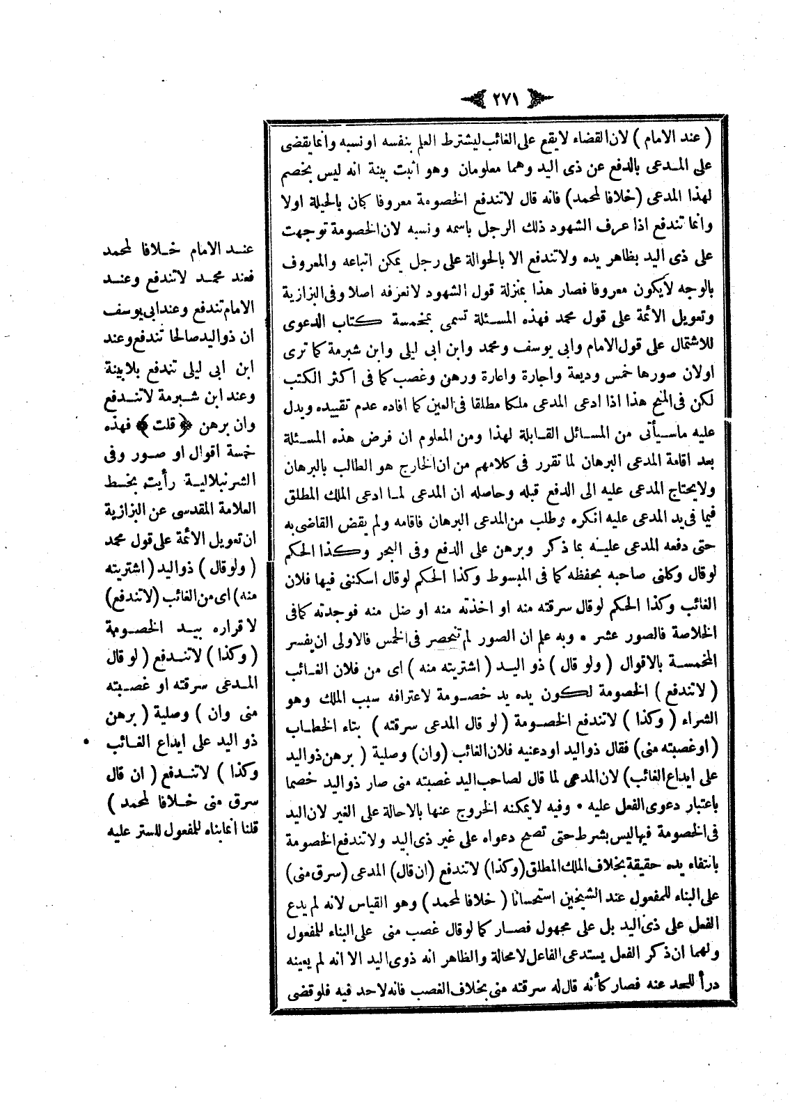 وَفِي الْبَزَّازِيَّةِ وَتَعْوِيلُ الْأَئِمَّةِ عَلَى قَوْلِ مُحَمَّدٍ فَهَذِهِ الْمَسْأَلَةُ تُسَمَّى بِمُخَمَّسَةِ كِتَابِ الدَّعْوَى لِلِاشْتِمَالِ عَلَى قَوْلِ الْإِمَامِ وَأَبِي يُوسُفَ وَمُحَمَّدٍ وَابْنِ أَبِي لَيْلَى وَابْنِ شُبْرُمَةَ كَمَا تَرَى؛ أَوْ لِأَنَّ صُوَرَهَا خَمْسٌ وَدِيعَةٌ وَإِجَارَةٌ وَإِعَارَةٌ وَرَهْنٌ وَغَصْبٌ كَمَا فِي أَكْثَرِ الْكُتُبِ لَكِنْ فِي الْمِنَحِ، هَذَا إذَا ادَّعَى الْمُدَّعِي مِلْكًا مُطْلَقًا فِي الْعَيْنِ كَمَا أَفَادَهُ عَدَمُ تَقْيِيدِهِ وَيَدُلُّ عَلَيْهِ مَا سَيَأْتِي مِنْ الْمَسَائِلِ الْقَابِلَةِ لِهَذَا وَمِنْ الْمَعْلُومِ أَنَّ فَرْضَ هَذِهِ الْمَسْأَلَةِ بَعْدَ إقَامَةِ الْمُدَّعِي الْبُرْهَانَ لِمَا تَقَرَّرَ فِي كَلَامِهِمْ مِنْ أَنَّ الْخَارِجَ هُوَ الطَّالِبُ بِالْبُرْهَانِ، وَلَا يَحْتَاجُ الْمُدَّعَى عَلَيْهِ إلَى الدَّفْعِ قَبْلَهُ وَحَاصِلُهُ أَنَّ الْمُدَّعِي لَمَّا ادَّعَى الْمِلْكَ الْمُطْلَقَ فِيمَا فِي يَد الْمُدَّعَى عَلَيْهِ أَنْكَرَهُ وَطَلَبَ مِنْ الْمُدَّعِي الْبُرْهَانَ فَأَقَامَهُ وَلَمْ يَقْضِ الْقَاضِي بِهِ حَتَّى دَفَعَهُ الْمُدَّعَى عَلَيْهِ بِمَا ذَكَرَ وَبَرْهَنَ عَلَى الدَّفْعِ.