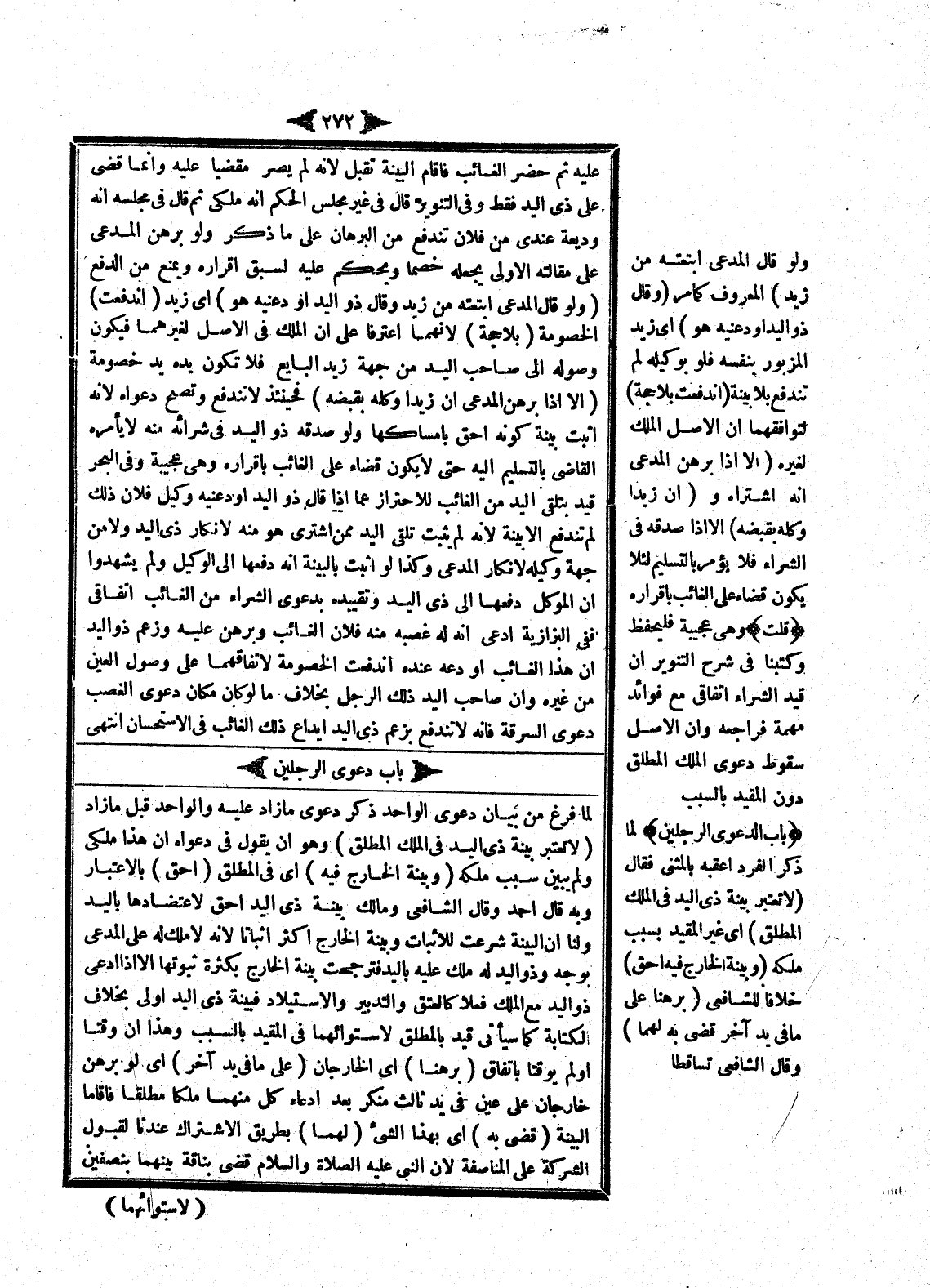 ِ لَمَّا فَرَغَ مِنْ بَيَانِ دَعْوَى الْوَاحِدِ ذَكَرَ دَعْوَى مَا زَادَ عَلَيْهِ وَالْوَاحِدُ قَبْلَ مَا زَادَ (لَا تُعْتَبَرُ بَيِّنَةُ ذِي الْيَدِ فِي الْمِلْكِ الْمُطْلَقِ) وَهُوَ أَنْ يَقُولَ فِي دَعْوَاهُ أَنَّ هَذَا مِلْكِي وَلَمْ يُبَيِّنْ سَبَبَ مِلْكِهِ (وَبَيِّنَةُ الْخَارِجِ فِيهِ) أَيْ فِي الْمُطْلَقِ (أَحَقُّ) بِالِاعْتِبَارِ وَبِهِ قَالَ أَحْمَدُ.