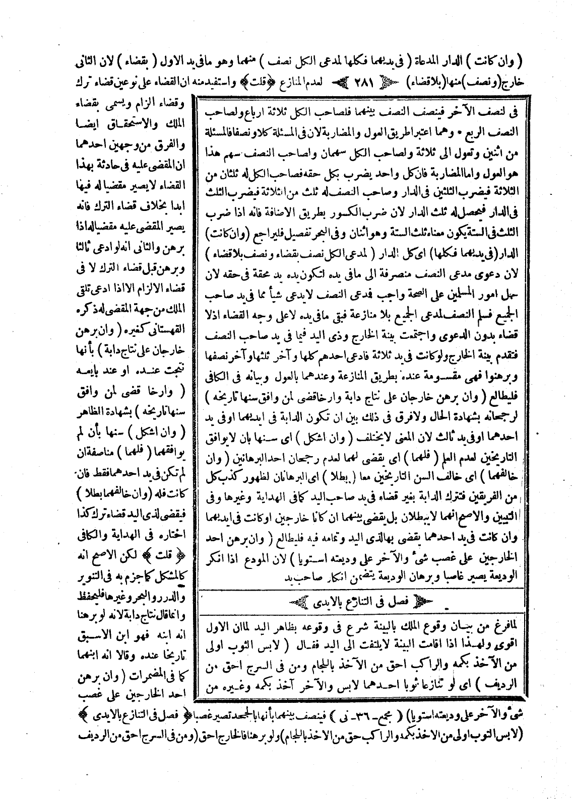 وَفِي الْبَحْرِ تَفْصِيلٌ فَلْيُرَاجَعْ (وَإِنْ كَانَتْ) الدَّارُ (فِي يَدَيْهِمَا فَكُلُّهَا) أَيْ كُلُّ الدَّارِ (لِمُدَّعِي الْكُلَّ نِصْفٌ بِقَضَاءٍ وَنِصْفٌ بِلَا قَضَاءٍ) ؛ لِأَنَّ دَعْوَى مُدَّعِي النِّصْفَ مُنْصَرِفَةٌ إلَى مَا فِي يَدِهِ لِتَكُونَ يَدُهُ يَدَ مُحِقَّةٍ فِي حَقِّهِ؛ لِأَنَّ حَمْلَ أُمُورِ الْمُسْلِمِينَ عَلَى الصِّحَّةِ وَاجِبٌ فَمُدَّعِي النِّصْفَ لَا يَدَّعِي شَيْئًا مِمَّا فِي يَدِ صَاحِبِ الْجَمِيعِ فَسَلَّمَ النِّصْفَ لِمُدَّعِي الْجَمِيعِ بِلَا مُنَازَعَةٍ فَبَقِيَ مَا فِي يَدِهِ لَا عَلَى وَجْهِ الْقَضَاءِ إذْ لَا قَضَاءَ بِدُونِ الدَّعْوَى وَاجْتَمَعَتْ بَيِّنَةُ الْخَارِجِ وَذِي الْيَدِ فِيمَا فِي يَدِ صَاحِبِ النِّصْفِ فَتُقَدَّمُ بَيِّنَةُ الْخَارِجِ وَلَوْ كَانَتْ فِي يَدِ ثَلَاثَةٍ فَادَّعَى أَحَدُهُمْ كُلَّهَا وَآخَرُ ثُلُثَهَا وَآخَرُ نِصْفَهَا وَبَرْهَنُوا فَهِيَ مَقْسُومَةٌ عِنْدَهُ بِطَرِيقِ الْمُنَازَعَةِ وَعِنْدَهُمَا بِالْعَوْلِ وَبَيَانُهُ فِي الْكَافِي فَلْيُطَالَعْ.