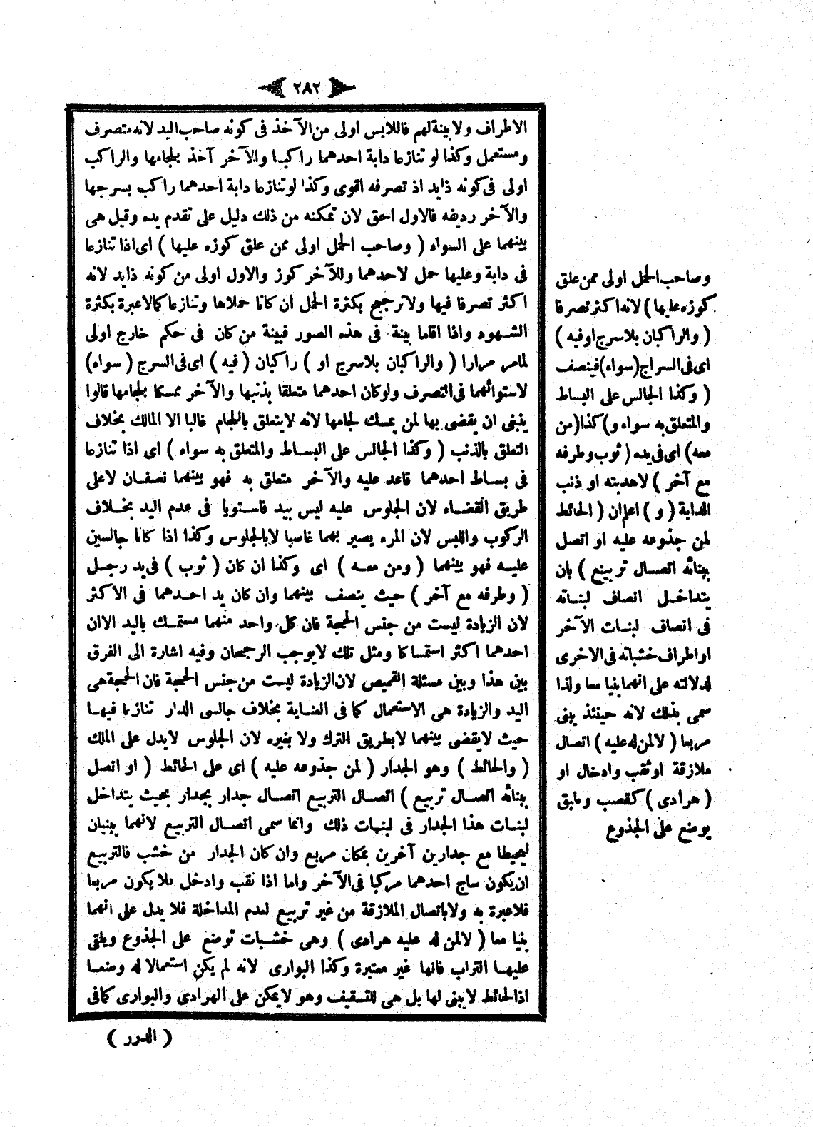 (وَكَذَا الْجَالِسُ عَلَى الْبِسَاطِ وَالْمُتَعَلِّقُ بِهِ سَوَاءٌ) أَيْ إذَا تَنَازَعَا فِي بِسَاطٍ أَحَدُهُمَا قَاعِدٌ عَلَيْهِ وَالْآخَرُ مُتَعَلِّقٌ بِهِ، فَهُوَ بَيْنَهُمَا نِصْفَانِ لَا عَلَى طَرِيقِ الْقَضَاءِ؛ لِأَنَّ الْجُلُوسَ عَلَيْهِ لَيْسَ بِيَدٍ فَاسْتَوَيَا فِي عَدَمِ الْيَدِ بِخِلَافِ الرُّكُوبِ وَاللُّبْسِ؛ لِأَنَّ الْمَرْءَ يَصِيرُ بِهِمَا غَاصِبًا لَا بِالْجُلُوسِ وَكَذَا إذَا كَانَا جَالِسَيْنِ عَلَيْهِ فَهُوَ بَيْنَهُمَا (وَمَنْ مَعَهُ) أَيْ وَكَذَا إنْ كَانَ (ثَوْبٌ) فِي يَدِ رَجُلٍ (وَطَرَفُهُ مَعَ آخَرَ) حَيْثُ يُنَصَّفُ بَيْنَهُمَا، وَإِنْ كَانَ يَدُ أَحَدِهِمَا فِي الْأَكْثَرِ؛ لِأَنَّ الزِّيَادَةَ لَيْسَتْ مِنْ جِنْسِ الْحُجَّةِ فَإِنَّ كُلَّ وَاحِدٍ مِنْهُمَا مُسْتَمْسِكٌ بِالْيَدِ إلَّا أَنَّ أَحَدَهُمَا أَكْثَرُ اسْتِمْسَاكًا وَمِثْلُ تِلْكَ لَا يُوجِبُ الرُّجْحَانَ وَفِيهِ إشَارَةٌ إلَى الْفَرْقِ بَيْنَ، هَذَا وَبَيْنَ مَسْأَلَةِ الْقَمِيصِ؛ لِأَنَّ الزِّيَادَةَ لَيْسَتْ مِنْ جِنْسِ الْحُجَّةِ فَإِنَّ الْحُجَّةَ هِيَ الْيَدُ وَالزِّيَادَةُ هِيَ الِاسْتِعْمَالُ كَمَا فِي الْعِنَايَةِ بِخِلَافِ جَالِسَيْ الدَّارِ تَنَازَعَا فِيهَا حَيْثُ لَا يَقْضِي بَيْنَهُمَا لَا بِطَرِيقِ التَّرْكِ وَلَا بِغَيْرِهِ؛ لِأَنَّ الْجُلُوسَ لَا يَدُلُّ عَلَى الْمِلْكِ (وَالْحَائِطُ) وَهُوَ الْجِدَارُ (لِمَنْ جُذُوعُهُ عَلَيْهِ) أَيْ عَلَى الْحَائِطِ (أَوْ اتَّصَلَ بِبِنَائِهِ اتِّصَالَ تَرْبِيعٍ) اتِّصَالُ التَّرْبِيعِ اتِّصَالُ جِدَارٍ بِجِدَارٍ بِحَيْثُ يَتَدَاخَلُ لِبَنَاتِ هَذَا الْجِدَارِ فِي لِبَنَاتِ ذَلِكَ وَإِنَّمَا سُمِّيَ اتِّصَالُ التَّرْبِيعِ؛ لِأَنَّهُمَا يُبْنَيَانِ لِيُحِيطَا مَعَ جِدَارَيْنِ آخَرَيْنِ بِمَكَانٍ مُرَبَّعٍ وَإِنْ كَانَ الْجِدَارُ مِنْ خَشَبٍ فَالتَّرْبِيعُ أَنْ يَكُونَ سَاجُ أَحَدِهِمَا مُرَكَّبًا فِي الْآخَرِ وَأَمَّا إذَا نُقِبَ وَأُدْخِلَ فَلَا يَكُونُ مُرَبَّعًا فَلَا عِبْرَةَ بِهِ وَلَا بِاتِّصَالِ الْمُلَازَقَةِ مِنْ غَيْرِ تَرْبِيعٍ لِعَدَمِ الْمُدَاخَلَةِ فَلَا يَدُلُّ عَلَى أَنَّهُمَا بُنِيَا مَعًا (لَا لِمَنْ لَهُ عَلَيْهِ هَرَادِيُّ) وَهِيَ خَشَبَاتٌ تُوضَعُ عَلَى الْجُذُوعِ وَيُلْقَى عَلَيْهَا التُّرَابُ فَإِنَّهَا غَيْرُ مُعْتَبَرَةٍ وَكَذَا الْبَوَارِي؛ لِأَنَّهُ لَمْ يَكُنْ اسْتِعْمَالًا لَهُ وَضْعًا إذْ الْحَائِطُ لَا يُبْنَى لَهَا بَلْ هِيَ لِلتَّسْقِيفِ وَهُوَ لَا يُمْكِنُ عَلَى الْهَرَادِيِّ وَالْبَوَارِيِّ كَمَا فِي