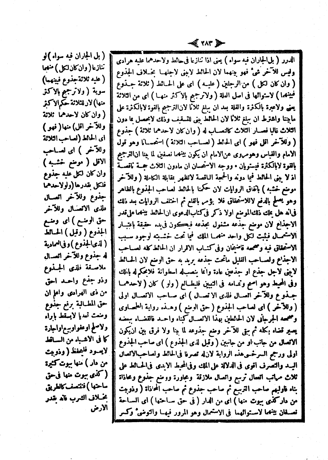 الدُّرَرِ (بَلْ الْجَارَانِ فِيهِ سَوَاءٌ) يَعْنِي إذَا تَنَازَعَا فِي حَائِطٍ وَلِأَحَدِهِمَا عَلَيْهِ هَرَادِيٌّ وَلَيْسَ لِلْآخَرِ شَيْءٌ فَهُوَ بَيْنَهُمَا؛ لِأَنَّ الْحَائِطَ لَا يُبْنَى لِأَجْلِهَا بِخِلَافِ الْجُذُوعِ.
