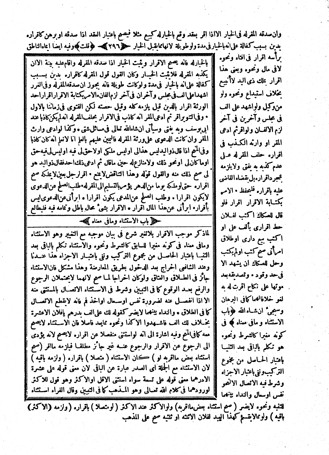 ُ لَمَّا ذَكَرَ مُوجَبَ الْإِقْرَارِ بِلَا تَغَيُّرٍ شَرَعَ فِي بَيَانِ مُوجَبِهِ مَعَ التَّغْيِيرِ، وَهُوَ الِاسْتِثْنَاءُ وَمَا فِي مَعْنَاهُ فِي كَوْنِهِ مُغَيِّرًا لِلسَّابِقِ كَالشَّرْطِ وَنَحْوِهِ. وَالِاسْتِثْنَاءُ: تَكَلُّمٌ بِالْبَاقِي بَعْدَ الثُّنْيَا بِاعْتِبَارِ الْحَاصِلِ مِنْ مَجْمُوعِ التَّرْكِيبِ، وَنَفْيٌ بِاعْتِبَارِ الْأَجْزَاءِ هَذَا عِنْدَنَا.