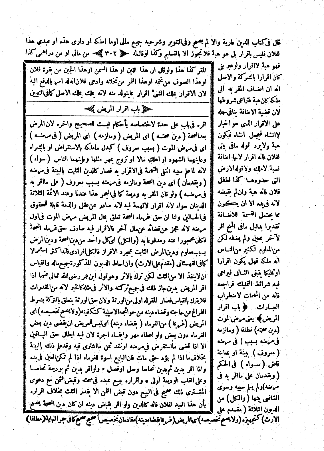 ِ أَقَرَّهُ فِي بَابٍ عَلَى حِدَةٍ لِاخْتِصَاصِهِ بِأَحْكَامٍ لَيْسَتْ لِلصَّحِيحِ، وَأَخَّرَهُ لِأَنَّ الْمَرَضَ بَعْدَ الصِّحَّةِ (دَيْنُ صِحَّتِهِ) أَيْ الْمَرِيضِ (وَمَا لَزِمَهُ) أَيْ الْمَرِيضَ (فِي مَرَضِهِ) أَيْ فِي مَرَضِ الْمَوْتِ (بِسَبَبٍ مَعْرُوفٍ) كَبَدَلِ مَا مَلَكَهُ بِالِاسْتِقْرَاضِ أَوْ بِالشِّرَاءِ، وَعَايَنَهُمَا الشُّهُودُ أَوْ أَهْلَكَ مَالًا أَوْ تَزَوَّجَ بِمَهْرِ مِثْلِهَا وَعَايَنَهُمَا النَّاسُ (سَوَاءٌ) لِأَنَّهُ لَمَّا عُلِمَ سَبَبُهُ انْتَفَى التُّهْمَةُ فِي الْإِقْرَارِ بِهِ فَصَارَ كَالدَّيْنِ الثَّابِتِ بِالْبَيِّنَةِ فِي مَرَضِهِ (وَيُقَدَّمَانِ) أَيْ دَيْنُ الصِّحَّةِ وَمَا لَزِمَهُ فِي مَرَضِهِ بِسَبَبٍ مَعْرُوفٍ (عَلَى مَا أَقَرَّ بِهِ فِي مَرَضِهِ) وَلَوْ كَانَ الْمُقَرُّ بِهِ وَدِيعَةً كَمَا فِي الْبَحْرِ هَذَا عِنْدَنَا، وَعِنْدَ الْأَئِمَّةِ الثَّلَاثَةِ الدَّيْنَانِ سَوَاءٌ لِأَنَّهُ إقْرَارٌ لَا تُهْمَةَ فِيهِ لِأَنَّهُ صَادِرٌ عَنْ عَقْلٍ، وَالذِّمَّةُ قَابِلَةٌ لِلْحُقُوقِ فِي الْحَالَيْنِ وَلَنَا أَنَّ حَقَّ غُرَمَاءِ الصِّحَّةِ تَعَلَّقَ بِمَالِ الْمَرِيضِ مَرَضَ الْمَوْتِ فِي أَوَّلِ مَرَضِهِ لِأَنَّهُ عَجَزَ عَنْ قَضَائِهِ عَنْ مَالٍ آخَرَ، فَالْإِقْرَارُ فِيهِ صَادَفَ حَقَّ غُرَمَاءِ الصِّحَّةِ فَكَانَ مَحْجُورًا عَنْهُ وَمَدْفُوعًا بِهِ (وَالْكُلُّ) أَيْ كُلُّ وَاحِدٍ مِنْ دَيْنِ الصِّحَّةِ وَدَيْنِ الْمَرَضِ بِسَبَبٍ مَعْلُومٍ، وَدَيْنِ الْمَرَضِ الثَّابِتِ بِمُجَرَّدِ الْإِقْرَارِ، فَالْكُلُّ إفْرَادِيٌّ فَإِنَّهُ أَكْثَرُ اسْتِعْمَالًا كَمَا فِي الْقُهُسْتَانِيِّ (مُقَدَّمٌ عَلَى الْإِرْثِ) ، وَإِنْ أَحَاطَ الدُّيُونُ الْمَذْكُورَةُ جَمِيعَ مَالِهِ، وَالْقِيَاسُ أَنْ لَا يَنْفُذَ إلَّا مِنْ الثُّلُثِ لَكِنْ تُرِكَ بِالْأَثَرِ، وَهُوَ قَوْلُ ابْنِ عُمَرَ - رَضِيَ اللَّهُ تَعَالَى عَنْهُمَا - إذَا أَقَرَّ الْمَرِيضُ بِدَيْنٍ جَازَ ذَلِكَ فِي جَمِيعِ تَرِكَتِهِ، وَالْأَثَرُ فِي مِثْلِهِ كَالْخَبَرِ لِأَنَّهُ مِنْ الْمُقَدَّرَاتِ فَلَا يُتْرَكُ بِالْقِيَاسِ، فَصَارَ الْمُقَرُّ لَهُ أَوْلَى مِنْ الْوَرَثَةِ وَلِأَنَّ حَقَّ الْوَرَثَةِ يَتَعَلَّقُ بِالتَّرِكَةِ بِشَرْطِ الْفَرَاغِ عَنْ حَاجَتِهِ، وَقَضَاءُ دَيْنِهِ مِنْ حَوَائِجِهِ الْأَصْلِيَّةِ كَتَكْفِينِهِ.