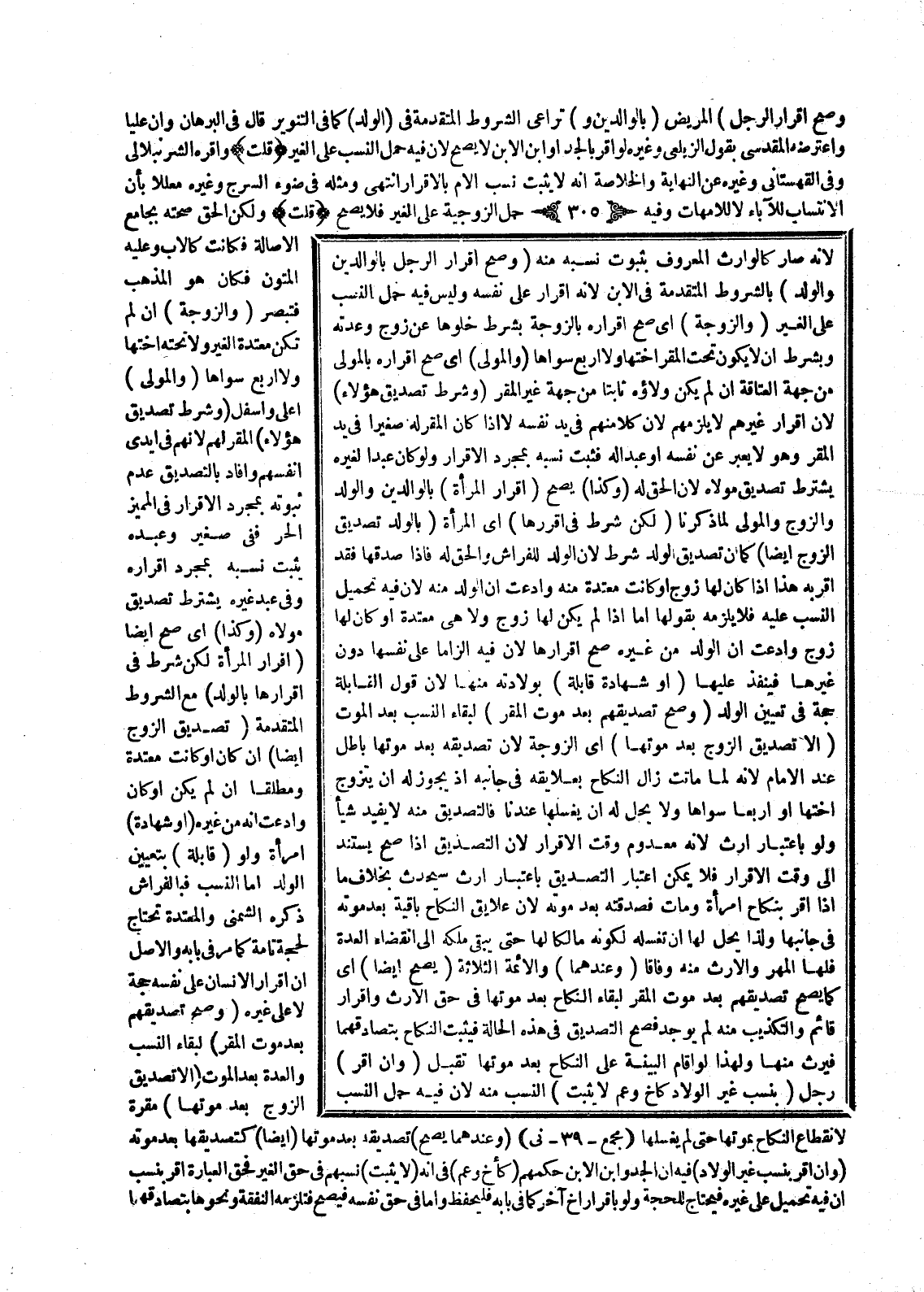 لِأَنَّهُ صَارَ كَالْوَارِثِ الْمَعْرُوفِ بِثُبُوتِ نَسَبِهِ مِنْهُ (وَصَحَّ إقْرَارُ الرَّجُلِ بِالْوَالِدَيْنِ وَالْوَلَدِ) بِالشُّرُوطِ الْمُتَقَدِّمَةِ فِي الِابْنِ، لِأَنَّهُ إقْرَارٌ عَلَى نَفْسِهِ وَلَيْسَ فِيهِ حَمْلُ النَّسَبِ عَلَى الْغَيْرِ (وَالزَّوْجَةِ) أَيْ صَحَّ إقْرَارُهُ بِالزَّوْجَةِ بِشَرْطِ خُلُوِّهَا عَنْ زَوْجٍ، وَعِدَّتِهِ، وَبِشَرْطِ أَنْ لَا يَكُونَ تَحْتَ الْمُقِرِّ أُخْتُهَا وَلَا أَرْبَعٌ سِوَاهَا (وَالْمَوْلَى) أَيْ صَحَّ إقْرَارُهُ بِالْمَوْلَى مِنْ جِهَةِ الْعَتَاقَةِ إنْ لَمْ يَكُنْ وَلَاؤُهُ ثَابِتًا مِنْ جِهَةِ غَيْرِ الْمُقِرِّ (وَشُرِطَ تَصْدِيقُ هَؤُلَاءِ) لِأَنَّ إقْرَارَ غَيْرِهِمْ لَا يَلْزَمُهُمْ لِأَنَّ كُلًّا مِنْهُمْ فِي يَدِ نَفْسِهِ لَا إذَا كَانَ الْمُقَرُّ لَهُ صَغِيرًا فِي يَدِ الْمُقِرِّ - وَهُوَ لَا يُعَبِّرُ عَنْ نَفْسِهِ - أَوْ عَبْدًا لَهُ فَثَبَتَ نَسَبُهُ بِمُجَرَّدِ الْإِقْرَارِ وَلَوْ كَانَ عَبْدًا لِغَيْرِهِ يُشْتَرَطُ تَصْدِيقُ مَوْلَاهُ لِأَنَّ الْحَقَّ لَهُ.