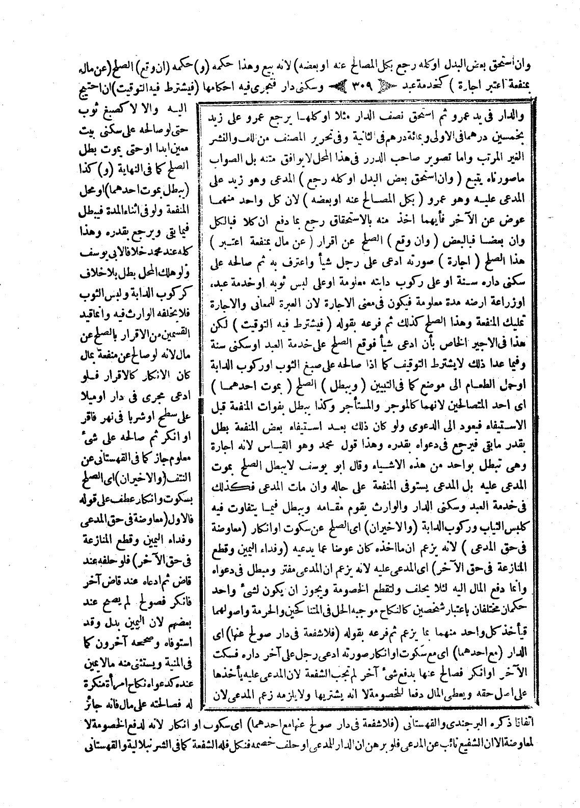 (وَإِنْ وَقَعَ) الصُّلْحُ عَنْ إقْرَارٍ (عَنْ مَالٍ بِمَنْفَعَةٍ اُعْتُبِرَ) هَذَا الصُّلْحُ (إجَارَةً) صُورَتُهُ: ادَّعَى رَجُلٌ شَيْئًا وَاعْتَرَفَ بِهِ ثُمَّ صَالَحَهُ عَلَى سُكْنَى دَارِهِ سَنَةً أَوْ عَلَى رُكُوبِ دَابَّتِهِ مَعْلُومَةً، أَوْ عَلَى لُبْسِ ثَوْبِهِ أَوْ خِدْمَةِ عَبْدِهِ أَوْ زِرَاعَةِ أَرْضِهِ مُدَّةً مَعْلُومَةً فَيَكُونُ فِي مَعْنَى الْإِجَارَةِ لِأَنَّ الْعِبْرَةَ لِلْمَعَانِي، وَالْإِجَارَةُ تَمْلِيكُ الْمَنْفَعَةِ وَهَذَا الصُّلْحُ كَذَلِكَ ثُمَّ فَرَّعَهُ بِقَوْلِهِ (فَيُشْتَرَطُ فِيهِ التَّوْقِيتُ) لَكِنَّ هَذَا فِي الْأَجِيرِ الْخَاصِّ بِأَنْ ادَّعَى شَيْئًا فَوَقَعَ الصُّلْحُ عَلَى خِدْمَةِ الْعَبْدِ أَوْ سُكْنَى سَنَةٍ، وَفِيمَا عَدَا ذَلِكَ لَا يُشْتَرَطُ التَّوْقِيفُ كَمَا إذَا صَالَحَهُ عَلَى صَبْغِ الثَّوْبِ، أَوْ رُكُوبِ الدَّابَّةِ، أَوْ حَمْلِ الطَّعَامِ إلَى مَوْضِعٍ كَمَا فِي التَّبْيِينِ.