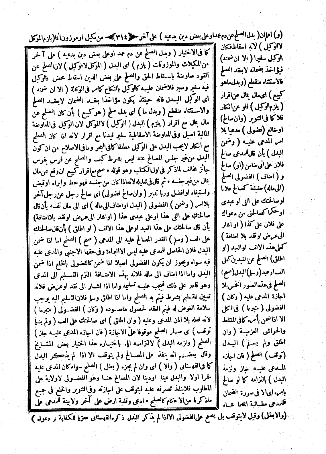 (وَبَدَلُ الصُّلْحِ عَنْ دَمِ عَمْدٍ أَوْ عَلَى بَعْضِ دَيْنٍ يَدَّعِيهِ) عَلَى آخَرَ مِنْ الْمَكِيلَاتِ وَالْمَوْزُونَاتِ (يَلْزَمُ) أَيْ الْبَدَلُ (الْمُوَكِّلَ لَا الْوَكِيلَ) لِأَنَّ الصُّلْحَ عَنْ الْقَوَدِ مُعَاوَضَةٌ بِإِسْقَاطِ الْحَقِّ، وَالصُّلْحَ عَلَى بَعْضِ الدَّيْنِ إسْقَاطٌ مَحْضٌ، فَالْوَكِيلُ فِيهِ سَفِيرٌ وَمُعَبِّرٌ فَلَا ضَمَانَ عَلَيْهِ كَالْوَكِيلِ بِالنِّكَاحِ كَمَا مَرَّ فِي الْوَكَالَةِ (إلَّا إنْ ضَمِنَهُ) أَيْ الْوَكِيلُ الْبَدَلَ فَإِنَّهُ حِينَئِذٍ يَكُونُ مُؤَاخَذًا بِعَقْدِ الضَّمَانِ لَا بِعَقْدِ الصُّلْحِ، وَالِاسْتِثْنَاءُ مُنْقَطِعٌ (وَبَدَلُ مَا) أَيْ بَدَلُ صُلْحٍ (هُوَ كَبَيْعٍ) بِأَنْ كَانَ الصُّلْحُ عَنْ مَالٍ بِمَالٍ مَعَ إقْرَارٍ (يُلْزِمُ) الْبَدَلَ (الْوَكِيلَ) لَا الْمُوَكِّلَ لِأَنَّ الْوَكِيلَ فِي الْمُعَاوَضَةِ الْمَالِيَّةِ أَصِيلٌ، وَفِي الْمُعَاوَضَةِ الْإِسْقَاطِيَّةِ سَفِيرٌ، قَيَّدْنَا مَعَ إقْرَارٍ لِأَنَّهُ إذَا كَانَ الصُّلْحُ مَعَ إنْكَارٍ لَا يَجِبُ الْبَدَلُ عَلَى الْوَكِيلِ مُطْلَقًا كَمَا فِي الْبَحْرِ وَمَا فِي الْإِصْلَاحِ مِنْ أَنَّ كَوْنَ الْبَدَلِ مِنْ غَيْرِ جِنْسِ الْمُصَالَحِ عَنْهُ لَيْسَ بِشَرْطٍ، كَيْفَ وَالصُّلْحُ عَنْ فَرَسٍ بِفَرَسٍ جَائِزٌ مُخَالِفٌ لِمَا ذَكَرَ فِي أَوَّلِ الْكِتَابِ وَهُوَ قَوْلُهُ صَحَّ مَعَ إقْرَارٍ كَبَيْعٍ إنْ وَقَعَ عَنْ مَالٍ بِمَالٍ مِنْ غَيْرِ جِنْسِهِ.