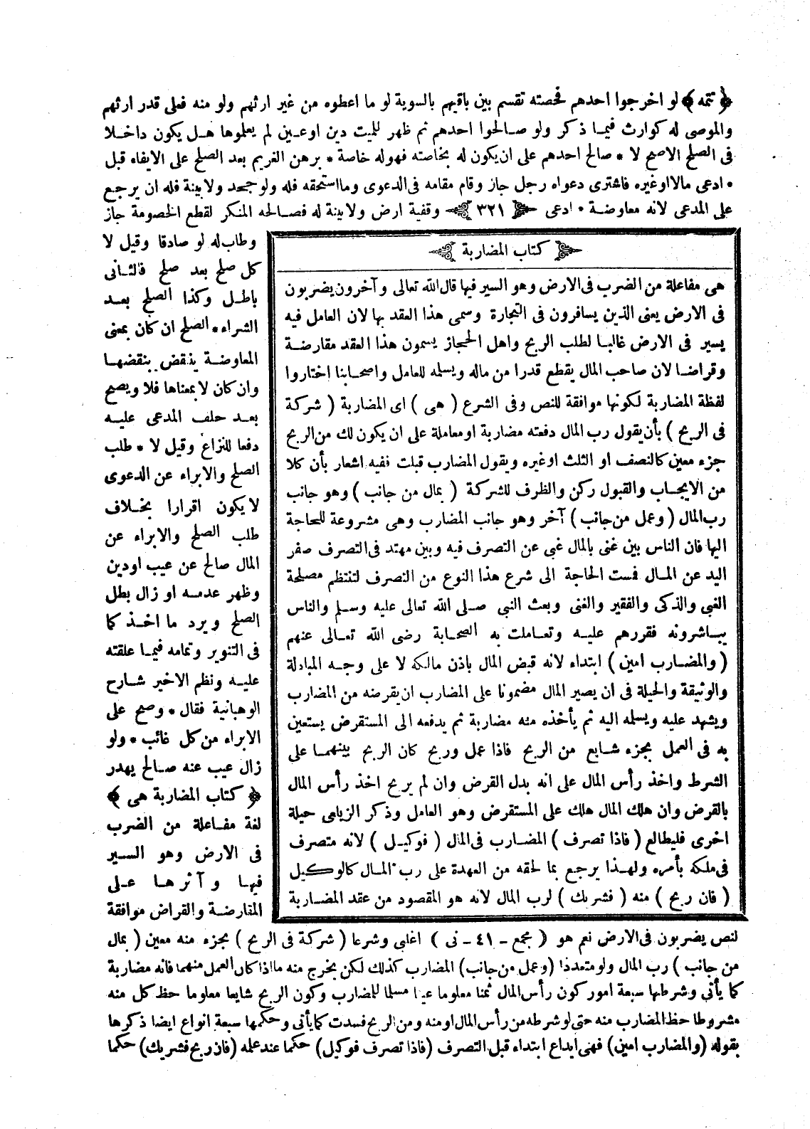 ِ هِيَ مُفَاعَلَةٌ مِنْ الضَّرْبِ فِي الْأَرْضِ، وَهُوَ السَّيْرُ فِيهَا قَالَ اللَّهُ تَعَالَى {وَآخَرُونَ يَضْرِبُونَ فِي الأَرْضِ} [المزمل: 20] يَعْنِي الَّذِينَ يُسَافِرُونَ فِي التِّجَارَةِ، وَسُمِّيَ هَذَا الْعَقْدُ بِهَا لِأَنَّ الْعَامِلَ فِيهِ يَسِيرُ فِي الْأَرْضِ غَالِبًا لِطَلَبِ الرِّبْحِ، وَأَهْلُ الْحِجَازِ يُسَمُّونَ هَذَا الْعَقْدَ مُقَارَضَةً وَقِرَاضًا؛ لِأَنَّ صَاحِبَ الْمَالِ يَقْطَعُ قَدْرًا مِنْ مَالِهِ وَيُسَلِّمُهُ لِلْعَامِلِ، وَأَصْحَابُنَا اخْتَارُوا لَفْظَةَ الْمُضَارَبَةِ لِكَوْنِهَا مُوَافِقَةً لِلنَّصِّ.