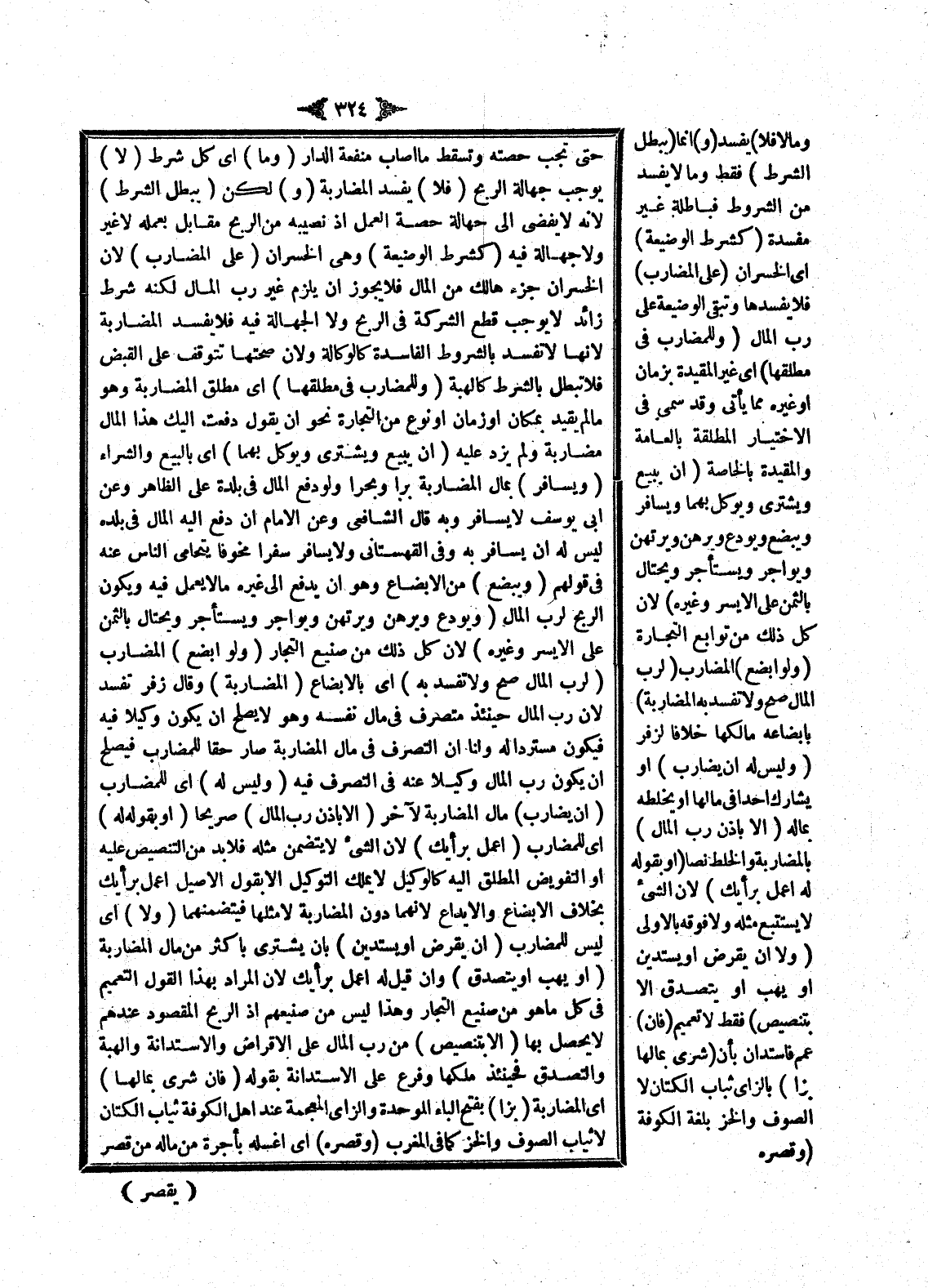 (فَإِنْ شَرَى بِمَالِهَا) أَيْ الْمُضَارَبَةِ (بَزًّا) بِفَتْحِ الْبَاءِ الْمُوَحَّدَةِ وَالزَّايِ الْمُعْجَمَةِ عِنْدَ أَهْلِ الْكُوفَةِ: ثِيَابُ الْكَتَّانِ لَا ثِيَابُ الصُّوفِ وَالْخَزِّ كَمَا فِي الْمُغْرِبِ (وَقَصَرَهُ) أَيْ غَسَلَهُ بِأُجْرَةٍ مِنْ مَالِهِ مِنْ قَصَرَ