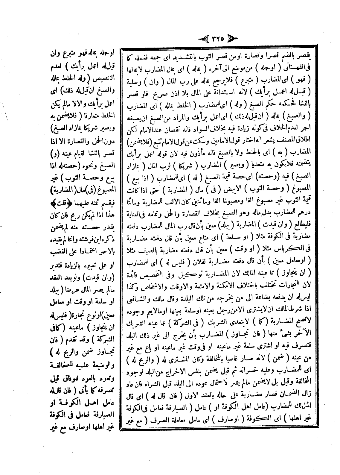 وَقَالَ مَالِكٌ وَالشَّافِعِيُّ: إذَا شَرَطَ الْمَالِكُ أَنْ لَا يَشْتَرِيَ إلَّا مِنْ رَجُلٍ بِعَيْنِهِ أَوْ سِلْعَةً بِعَيْنِهَا أَوْ مَا لَا يَعُمُّ وُجُودُهُ لَا تَصِحُّ الْمُضَارَبَةُ (كَمَا) لَا يَتَعَدَّى الشَّرِيكُ (فِي الشَّرِكَةِ) عَمَّا عَيَّنَهُ الشَّرِيكُ الْآخَرُ بِشَيْءٍ مِنْهَا (فَإِنْ تَجَاوَزَ) الْمُضَارِبُ بِأَنْ يَخْرُجَ إلَى غَيْرِ ذَلِكَ الْبَلَدِ فَتَصَرَّفَ فِيهِ أَوْ اشْتَرَى سِلْعَةً غَيْرَ مَا عَيَّنَهُ أَوْ فِي وَقْتٍ غَيْرِ مَا عَيَّنَهُ أَوْ بَاعَ مَعَ غَيْرِ مَنْ عَيَّنَهُ (ضَمِنَ) لِأَنَّهُ صَارَ غَاصِبًا بِالْمُخَالَفَةِ وَكَانَ الْمُشْتَرَى لَهُ (وَالرِّبْحُ لَهُ) أَيْ لِلْمُضَارِبِ، وَعَلَيْهِ خُسْرَانُهُ، ثُمَّ قِيلَ: يَضْمَنُ بِنَفْسِ الْإِخْرَاجِ مِنْ الْبَلَدِ لِوُجُودِ الْمُخَالَفَةِ وَقِيلَ بَلْ لَا يَضْمَنُ مَا لَمْ يَشْرِ لِاحْتِمَالِ عَوْدِهِ إلَى الْبَلَدِ قَبْلَ الشِّرَاءِ فَإِنْ عَادَ زَالَ الضَّمَانُ فَصَارَ مُضَارَبَةً عَلَى حَالِهِ بِالْعَقْدِ الْأَوَّلِ (فَإِنْ قَالَ لَهُ) أَيْ قَالَ الْمَالِكُ لِلْمُضَارِبِ (عَامِلْ أَهْلَ الْكُوفَةِ أَوْ) عَامِلْ (الصَّيَارِفَةَ فَعَامَلَ فِي الْكُوفَةِ غَيْرَ أَهْلِهَا) أَيْ الْكُوفَةِ (أَوْ صَارَفَ) أَيْ عَامَلَ مُعَامَلَةَ الصَّرْفِ (مَعَ غَيْرِ