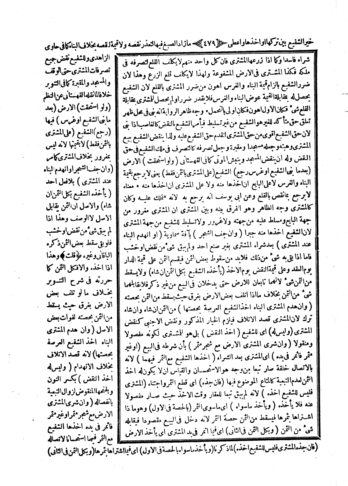 مَعْنَاهُ لَا يَرْجِعُ بِمَا نَقَصَ بِالْقَلْعِ وَعَنْ أَبِي يُوسُفَ أَنَّهُ يَرْجِعُ بِهِ؛ لِأَنَّهُ مُتَمَلِّكٌ عَلَيْهِ وَكَانَ كَالْمُشْتَرِي وَجْهُ الظَّاهِرِ وَهُوَ الْفَرْقُ بَيْنَهُ وَبَيْنَ الْمُشْتَرِي أَنَّ الْمُشْتَرِيَ مَغْرُورٌ مِنْ جِهَةِ الْبَائِعِ وَمُسَلَّطٌ عَلَيْهِ مِنْ جِهَتِهِ وَلَا غُرُورَ وَلَا تَسْلِيطَ لِلشَّفِيعِ مِنْ جِهَةِ الْمُشْتَرِي؛ لِأَنَّ الشَّفِيعَ أَخَذَهَا مِنْهُ جَبْرًا.