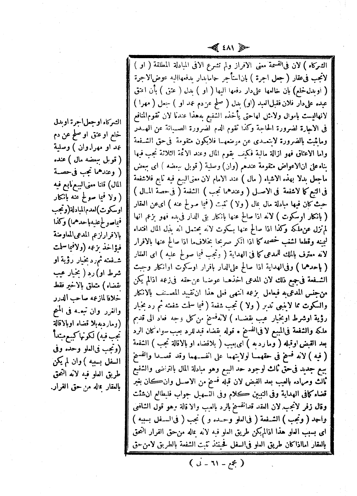 الشُّرَكَاءِ) ؛ لِأَنَّ فِي الْقِسْمَةِ مَعْنَى الْإِفْرَازِ وَلَمْ تُشْرَعْ إلَّا فِي الْمُبَادَلَةِ الْمُطْلَقَةِ (أَوْ) لَا تَجِبُ فِي عَقَارٍ (جُعِلَ أُجْرَةً) بِأَنْ اسْتَأْجَرَ حَمَّامًا بِدَارٍ يَدْفَعُهَا إلَيْهِ عِوَضَ الْأُجْرَةِ (أَوْ بَدَلَ خُلْعٍ) بِأَنْ خَالَعَهَا عَلَى دَارٍ دَفَعَهَا إلَيْهَا (أَوْ) بَدَلَ (عِتْقٍ) بِأَنْ أَعْتَقَ عَبْدَهُ عَلَى دَارِ فُلَانٍ فَقَبِلَ الْعَبْدُ (أَوْ) بَدَلَ (صُلْحٍ عَنْ دَمٍ عَمْدٍ أَوْ) جُعِلَ (مَهْرًا) ؛ لِأَنَّهَا لَيْسَتْ بِأَمْوَالٍ وَلَا مِثْلٍ لَهَا حَتَّى يَأْخُذَهُ الشَّفِيعُ بِهِ هَذَا عِنْدَنَا؛ لِأَنَّ تَقَوُّمَ الْمَنَافِعِ فِي الْإِجَارَةِ لِضَرُورَةِ الْحَاجَةِ وَكَذَا تَقَوُّمُ الدَّمِ لِضَرُورَةِ الصِّيَانَةِ عَنْ الْهَدَرِ وَمَا يَثْبُتُ بِالضَّرُورَةِ لَا يَتَعَدَّى عَنْ مَوْضِعِهَا فَلَا تَكُونُ مُتَقَوِّمَةً فِي حَقِّ الشُّفْعَةِ وَأَمَّا الْإِعْتَاقُ فَهُوَ إزَالَةُ مَالِيَّةٍ فَكَيْفَ يُقَوَّمُ الْمَالُ وَعِنْدَ الْأَئِمَّةِ الثَّلَاثَةِ تَجِبُ فِيهَا بِنَاءً عَلَى أَنَّ الْأَعْوَاضَ مُتَقَوِّمَةٌ عِنْدَهُمْ (وَإِنْ) وَصْلِيَّةٌ (قُوبِلَ بِبَعْضِهِ) أَيْ بِبَعْضِ مَا جُعِلَ بَدَلًا بِهَذِهِ الْأَشْيَاءِ (مَالٌ) عِنْدَ الْإِمَامِ؛ لِأَنَّ مَعْنَى الْبَيْعِ فِيهِ تَابِعٌ فَلَا شُفْعَةَ فِي التَّبَعِ كَمَا لَا شُفْعَةَ فِي الْأَصْلِ (وَعِنْدَهُمَا تَجِبُ) الشُّفْعَةُ (فِي حِصَّةِ الْمَالِ) حَيْثُ كَانَ فِيهَا مُبَادَلَةُ مَالٍ بِمَالٍ.