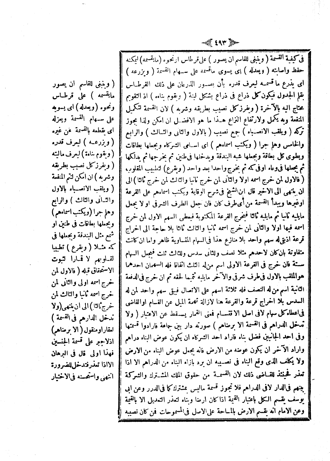 (وَيَنْبَغِي لِلْقَاسِمِ أَنْ يُصَوِّرَ) عَلَى قِرْطَاسٍ أَوْ نَحْوِهِ (مَا يَقْسِمُهُ) لِيُمْكِنَهُ حِفْظُهُ وَإِصَابَتُهُ (وَيُعَدِّلُهُ) أَيْ يُسَوِّي مَا قَسَمَهُ عَلَى سِهَامِ الْقِسْمَةِ (وَيُذَرِّعُهُ) أَيْ يُذَرِّعُ مَا قَسَمَهُ لِيَعْرِفَ قَدْرَهُ بِأَنْ يُصَوِّرَ الذُّرْعَانَ عَلَى ذَلِكَ الْقِرْطَاسِ بِقَلَمِ الْجَدْوَلِ فَيَكُونُ كُلُّ ذِرَاعٍ فِي ذِرَاعٍ بِشَكْلِ لَبِنَةٍ (وَيُقَوِّمُ بِنَاءَهُ) إذْ التَّقْوِيمُ مُحْتَاجٌ إلَيْهِ بِالْآخِرَةِ (وَيَفْرِزُ كُلَّ نَصِيبٍ بِطَرِيقِهِ وَشِرْبِهِ) ؛ لِأَنَّ الْقِسْمَةَ لِتَكْمِيلِ الْمَنْفَعَةِ وَبِهِ يَكْمُلُ وَلِارْتِفَاعِ النِّزَاعِ هَذَا مَا هُوَ الْأَفْضَلُ إنْ أَمْكَنَ وَلِذَا يَجُوزُ تَرْكُهُ (وَيُلَقِّبُ الْأَنْصِبَاءَ) جَمْعُ نَصِيبٍ (بِالْأَوَّلِ وَالثَّانِي وَالثَّالِثِ) وَالرَّابِعِ وَالْخَامِسِ وَهَلُمَّ جَرًّا (وَيَكْتُبُ أَسْمَاءَهُمْ) أَيْ أَسَامِي الشُّرَكَاءِ وَيَجْعَلُهَا بِطَاقَاتٍ وَيَطْوِي كُلَّ بِطَاقَةٍ وَيَجْعَلُهَا شِبْهَ الْبُنْدُقَةِ وَيُدْخِلُهَا فِي طُنَّيْنِ ثُمَّ يُخْرِجُهَا ثُمَّ يَدْلُكُهَا ثُمَّ يَجْعَلُهَا فِي وِعَاءٍ أَوْ فِي كُمِّهِ ثُمَّ يُخْرِجُ وَاحِدًا بَعْدَ وَاحِدٍ (وَيُقْرِعُ) لِتَطْيِيبِ الْمَقْلُوبِ (فَالْأَوَّلُ لِمَنْ خَرَجَ اسْمُهُ أَوَّلًا وَالثَّانِي لِمَنْ خَرَجَ ثَانِيًا وَالثَّالِثُ لِمَنْ خَرَجَ ثَالِثًا) إلَى أَنْ يَنْتَهِيَ إلَى الْأَخِيرِ قَالَ ابْنُ الشَّيْخِ فِي شَرْحِ الْوِقَايَةِ وَيَكْتُبُ أَسْمَاءَهُمْ عَلَى الْقُرْعَةِ أَوْ غَيْرِهَا وَيَبْدَأُ الْقِسْمَةَ مِنْ أَيِّ طَرَفٍ كَانَ فَإِنْ جَعَلَ الطَّرَفَ الشَّرْقِيَّ أَوَّلًا يَجْعَلُ مَا يَلِيه ثَانِيًا ثُمَّ مَا يَلِيه ثَالِثًا فَيُخْرِجُ الْقُرْعَةَ الْمَكْتُوبَةَ فَيُعْطِي السَّهْمَ لِمَنْ خَرَجَ اسْمُهُ فِيهَا أَوَّلًا وَالثَّانِي لِمَنْ خَرَجَ اسْمُهُ ثَانِيًا وَالثَّالِثُ ثَالِثًا بِلَا حَاجَةٍ إلَى إخْرَاجِ قُرْعَةٍ إذْ بَقِيَ لَهُ سَهْمٌ وَاحِدٌ بِلَا مُنَازِعٍ هَذَا فِي السِّهَامِ الْمُتَسَاوِيَةِ ظَاهِرٌ وَأَمَّا إنْ كَانَتْ مُتَفَاوِتَةً بِأَنْ كَانَ لِأَحَدِهِمْ مَثَلًا نِصْفٌ وَلِلثَّانِي سُدُسٌ وَلِلثَّالِثِ ثُلُثٌ فَيَجْعَلُ السِّهَامَ سِتَّةً فَإِنْ خَرَجَ فِي الْقُرْعَةِ الْأُولَى اسْمُ مَنْ لَهُ الثُّلُثُ اتِّفَاقًا فَلَهُ السَّهْمَانِ أَحَدُهُمَا هُوَ الْمُلَقَّبُ بِالْأَوَّلِ فِي طَرَفٍ شَرْقِيٍّ وَالْآخَرُ مَا يَلِيه تَتْمِيمًا لِحَقِّهِ ثُمَّ إنْ خَرَجَ فِي الدَّفْعَةِ الثَّانِيَةِ اسْمُ مَنْ لَهُ النِّصْفُ فَلَهُ ثَلَاثَةُ أَسْهُمٍ عَلَى الِاتِّصَالِ فَيَبْقَى سَهْمٌ وَاحِدٌ لِمَنْ لَهُ السُّدُسُ بِلَا إخْرَاجِ قُرْعَةٍ وَالْقُرْعَةُ هُنَا لِإِزَالَةِ تُهْمَةِ الْمَيْلِ عَنْ الْقَسَّامِ أَوْ الْقَاضِي فِي إعْطَاءِ كُلٍّ سِهَامَهُ لَا فِي أَصْلِ الِاقْتِسَامِ فَمَعْنَى الْقِمَارِ يَسْقُطُ عَنْ الِاعْتِبَارِ.
