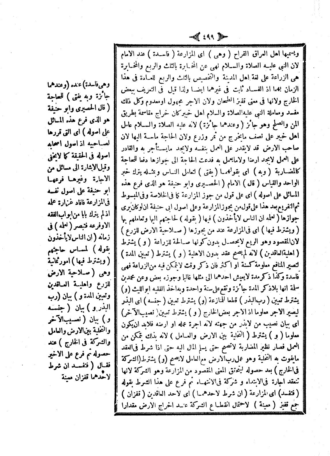 وَيُسَمِّيهَا أَهْلُ الْعِرَاقِ الْقِرَاحُ (وَهِيَ) أَيْ الْمُزَارَعَةُ (فَاسِدَةٌ) عِنْدَ الْإِمَامِ؛ لِأَنَّ النَّبِيَّ - عَلَيْهِ الصَّلَاةُ وَالسَّلَامُ - «نَهَى عَنْ الْمُخَابَرَةِ بِالثُّلُثِ وَالرُّبْعِ» وَالْمُخَابَرَةُ هِيَ الزِّرَاعَةُ عَلَى لُغَةِ أَهْلِ الْمَدِينَةِ وَالتَّخْصِيصُ بِالثُّلُثِ وَالرُّبْعِ لِلْعَادَةِ فِي هَذَا الزَّمَانِ بِهِمَا إذْ الْفَسَادُ ثَابِتٌ فِي غَيْرِهِمَا أَيْضًا وَلِذَا قِيلَ فِي التَّعْرِيفِ بِبَعْضِ الْخَارِجِ وَلِأَنَّهَا فِي مَعْنَى قَفِيزِ الطَّحَّانِ وَلِأَنَّ الْأَجْرَ مَجْهُولٌ أَوْ مَعْدُومٌ وَكُلُّ ذَلِكَ مُفْسِدٌ وَمُعَامَلَةُ النَّبِيِّ - عَلَيْهِ الصَّلَاةُ وَالسَّلَامُ - أَهْلَ خَيْبَرَ كَانَ خَرَاجَ مُقَاسَمَةٍ بِطَرِيقِ الْمَنِّ وَالصُّلْحِ وَهُوَ جَائِزٌ (وَعِنْدَهُمَا جَائِزَةٌ) ؛ لِأَنَّهُ - عَلَيْهِ الصَّلَاةُ وَالسَّلَامُ - «عَامَلَ أَهْلَ خَيْبَرَ عَلَى نِصْفِ مَا يَخْرُجُ مِنْ ثَمَرٍ وَزَرْعٍ» وَلِأَنَّ الْحَاجَةَ مَاسَّةٌ إلَيْهَا؛ لِأَنَّ صَاحِبَ الْأَرْضِ قَدْ لَا يَقْدِرُ عَلَى الْعَمَلِ بِنَفْسِهِ وَلَا يَجِدُ مَا يَسْتَأْجِرُ بِهِ وَالْقَادِرُ عَلَى الْعَمَلِ لَا يَجِدُ أَرْضًا وَلَا مَا يَعْمَلُ بِهِ فَدَعَتْ الْحَاجَةُ إلَى جَوَازِهَا دَفْعًا لِلْحَاجَةِ كَالْمُضَارَبَةِ (وَبِهِ) أَيْ بِقَوْلِهِمَا (يُفْتَى) لِتَعَامُلِ النَّاسِ وَبِمِثْلِهِ يُتْرَكُ خَبَرُ الْوَاحِدِ وَالْقِيَاسُ (قَالَ) الْإِمَامُ (الْحَصِيرِيُّ وَأَبُو حَنِيفَةَ هُوَ الَّذِي فَرَّعَ هَذِهِ الْمَسَائِلَ عَلَى أُصُولِهِ) أَيْ عَلَى قَوْلِ مَنْ جَوَّزَ الْمُزَارَعَةَ كَمَا فِي الْخُلَاصَةِ.