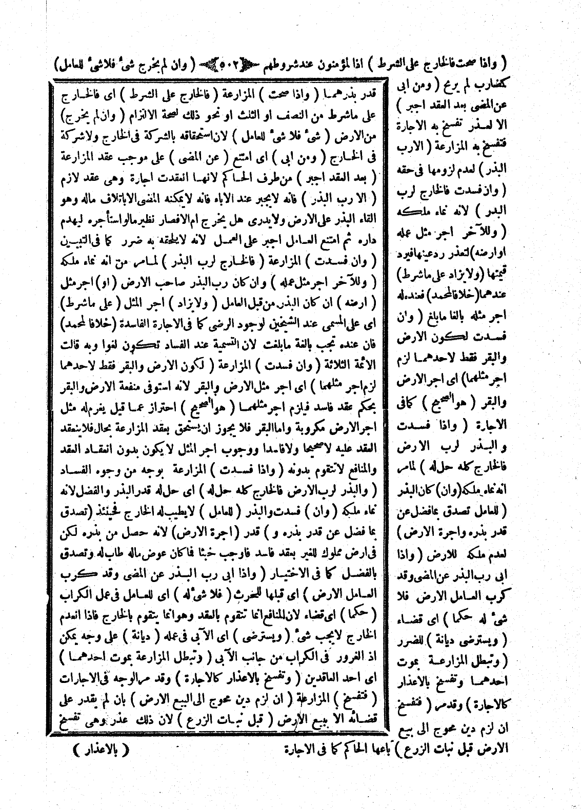 (وَتَبْطُلُ الْمُزَارَعَةُ بِمَوْتِ أَحَدِهِمَا) أَيْ أَحَدِ الْعَاقِدَيْنِ (وَتُفْسَخُ بِالْأَعْذَارِ كَالْإِجَارَةِ) وَقَدْ مَرَّ الْوَجْهُ فِي الْإِجَارَاتِ.