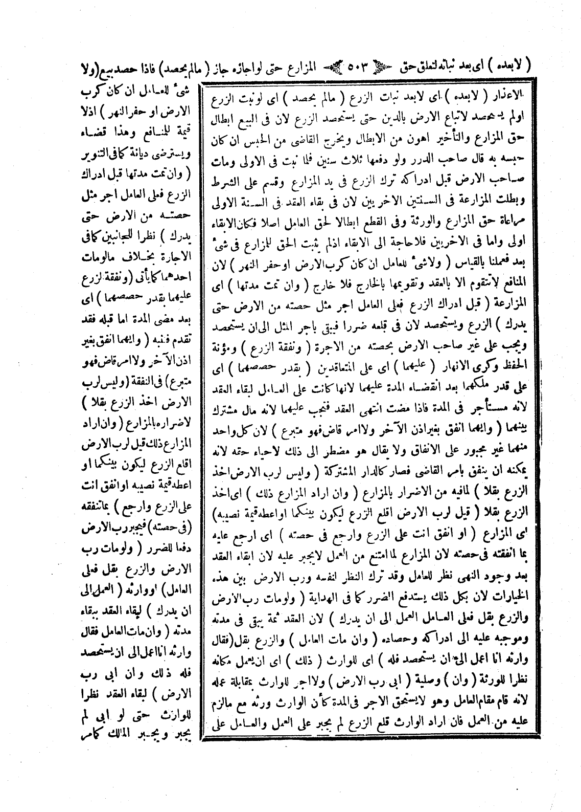 الْأَعْذَارُ (لَا بَعْدَهُ) أَيْ لَا بَعْدَ نَبَاتِ الزَّرْعِ (مَا لَمْ يُحْصَدْ) أَيْ لَوْ نَبَتَ الزَّرْعُ أَوْ لَمْ يُسْتَحْصَدْ لَا تُبَاعُ الْأَرْضُ بِالدَّيْنِ حَتَّى يُسْتَحْصَدَ الزَّرْعُ فِي الْبَيْعِ إبْطَالُ حَقِّ الْمُزَارِعِ وَالتَّأْخِيرُ أَهْوَنُ مِنْ الْإِبْطَالِ وَيُخْرِجُ الْقَاضِي مِنْ الْحَبْسِ إنْ كَانَ حَبَسَهُ بِهِ قَالَ صَاحِبُ الدُّرَرِ وَلَوْ دَفَعَهَا ثَلَاثَ سِنِينَ فَلَمَّا نَبَتَ فِي الْأُولَى وَمَاتَ صَاحِبُ الْأَرْضِ قَبْلَ إدْرَاكِهِ تَرَكَ الزَّرْعَ فِي يَدِ الْمُزَارِعِ وَقُسِّمَ عَلَى الشَّرْطِ وَبَطَلَتْ الْمُزَارَعَةُ فِي السَّنَتَيْنِ الْأُخْرَيَيْنِ؛ لِأَنَّ فِي بَقَاءِ الْعَقْدِ فِي السَّنَةِ الْأُولَى مُرَاعَاةَ حَقِّ الْمُزَارِعِ وَالْوَرَثَةِ وَفِي الْقَطْعِ إبْطَالًا لِحَقِّ الْعَامِلِ أَصْلًا فَكَانَ الْإِبْقَاءُ أَوْلَى وَأَمَّا فِي الْأُخْرَيَيْنِ فَلَا حَاجَةَ إلَى الْإِبْقَاءِ إذَا لَمْ يَثْبُتْ الْحَقُّ لِلْمُزَارِعِ فِي شَيْءٍ بَعْدُ فَعَمِلْنَا بِالْقِيَاسِ (وَلَا شَيْءَ لِلْعَامِلِ إنْ كَانَ كَرَبَ الْأَرْضَ أَوْ حَفَرَ النَّهْرَ) ؛ لِأَنَّ الْمَنَافِعَ لَا تَتَقَوَّمُ إلَّا بِالْعَقْدِ وَتَقْوِيمُهَا بِالْخَارِجِ فَلَا خَارِجَ.