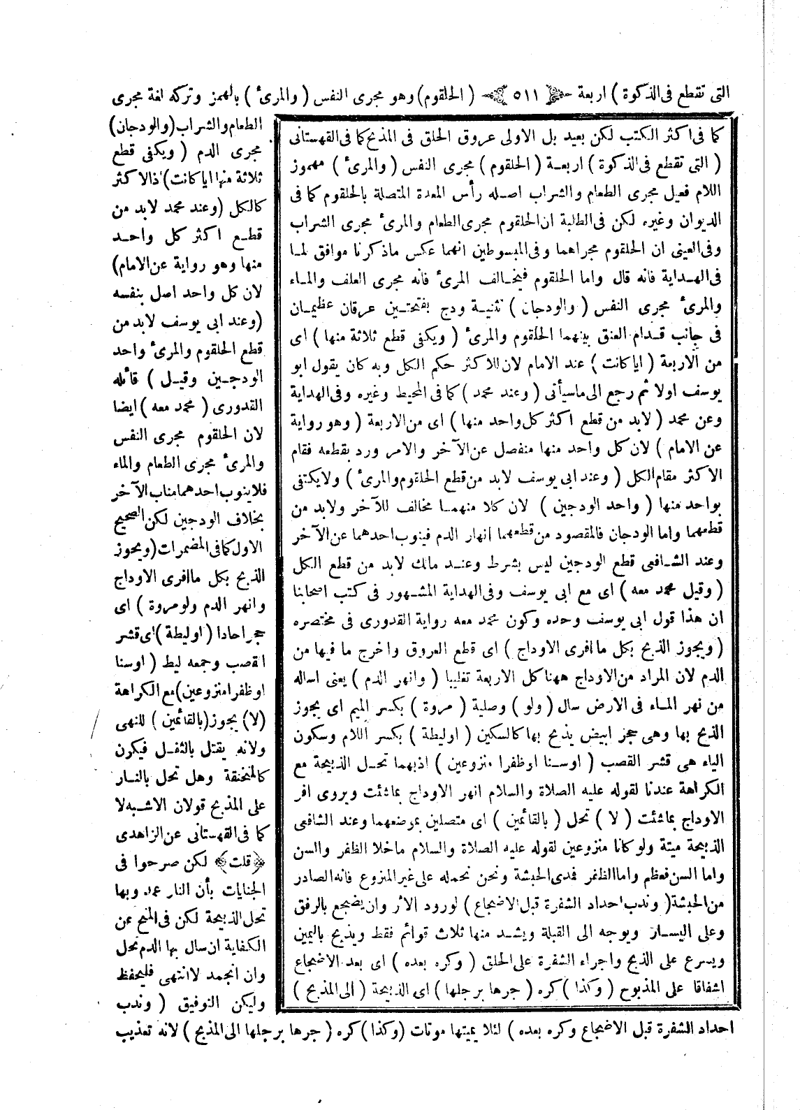 وَفِي الْهِدَايَةِ وَعَنْ مُحَمَّدٍ (لَا بُدَّ مِنْ قَطْعِ أَكْثَرِ كُلِّ وَاحِدٍ مِنْهَا) أَيْ مِنْ الْأَرْبَعَةِ (وَهُوَ رِوَايَةٌ عَنْ الْإِمَامِ) ؛ لِأَنَّ كُلَّ وَاحِدٍ مِنْهَا مُنْفَصِلٌ عَنْ الْآخَرِ وَالْأَمْرُ وَرَدَ بِقَطْعِهِ فَقَامَ الْأَكْثَرُ مَقَامَ الْكُلِّ (وَعِنْدَ أَبِي يُوسُفَ لَا بُدَّ مِنْ قَطْعِ الْحُلْقُومِ وَالْمَرِيءِ) وَلَا يَكْتَفِي بِوَاحِدٍ مِنْهَا (وَأَحَدِ الْوَدَجَيْنِ) ؛ لِأَنَّ كُلًّا مِنْهُمَا مُخَالِفٌ لِلْآخِرِ وَلَا بُدَّ مِنْ قَطْعِهِمَا وَأَمَّا الْوَدَجَانِ فَالْمَقْصُودُ مِنْ قَطْعِهِمَا إنْهَارُ الدَّمِ فَيَنُوبُ أَحَدُهُمَا عَنْ الْآخَرِ وَعِنْدَ الشَّافِعِيِّ قَطْعُ الْوَدَجَيْنِ لَيْسَ بِشَرْطٍ وَعِنْدَ مَالِكٍ لَا بُدَّ مِنْ قَطْعِ الْكُلِّ (وَقِيلَ مُحَمَّدٌ مَعَهُ) أَيْ مَعَ أَبِي يُوسُفَ.