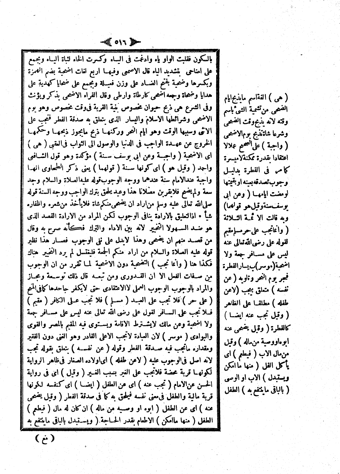 وَقَالَ الْفَرَّاءُ الْأَضْحَى يُذَكَّرُ وَيُؤَنَّثُ وَفِي الشَّرْعِ هِيَ ذَبْحُ حَيَوَانٍ مَخْصُوصٍ بِنِيَّةِ الْقُرْبَةِ فِي وَقْتٍ مَخْصُوصٍ وَهُوَ يَوْمُ الْأَضْحَى وَشَرَائِطُهَا الْإِسْلَامُ وَالْيَسَارُ الَّذِي يَتَعَلَّقُ بِهِ صَدَقَةُ الْفِطْرِ فَتَجِبُ عَلَى الْأُنْثَى وَسَبَبُهَا الْوَقْتُ وَهُوَ أَيَّامُ النَّحْرِ وَرُكْنُهَا ذَبْحُ مَا يَجُوزُ ذَبْحُهَا وَحُكْمُهَا الْخُرُوجُ عَنْ عُهْدَةِ الْوَاجِبِ فِي الدُّنْيَا وَالْوُصُولِ إلَى الثَّوَابِ فِي الْعُقْبَى (هِيَ) أَيْ الْأُضْحِيَّةُ (وَاجِبَةٌ وَعَنْ أَبِي يُوسُفَ سُنَّةٌ) مُؤَكَّدَةٌ وَهُوَ قَوْلُ الشَّافِعِيِّ وَأَحْمَدَ (وَقِيلَ هُوَ) أَيْ كَوْنُهَا سُنَّةً (قَوْلُهُمَا) يَعْنِي ذَكَرَ الطَّحَاوِيُّ أَنَّهَا وَاجِبَةٌ عِنْدَ الْإِمَامِ سُنَّةٌ عِنْدَهُمَا وَوَجْهُ الْوُجُوبِ قَوْلُهُ - عَلَيْهِ الصَّلَاةُ وَالسَّلَامُ - «مَنْ وَجَدَ سَعَةً وَلَمْ يُضَحِّ فَلَا يَقْرَبَنَّ مُصَلَّانَا» هَذَا وَعِيدٌ يَلْحَقُ بِتَرْكِ الْوَاجِبِ وَوَجْهُ السُّنَّةِ قَوْلُهُ - صَلَّى اللَّهُ تَعَالَى عَلَيْهِ وَسَلَّمَ - «مَنْ أَرَادَ أَنْ يُضَحِّيَ مِنْكُمْ شَاةً فَلَا يَأْخُذُ مِنْ شَعَرِهِ وَأَظْفَارِهِ شَيْئًا»