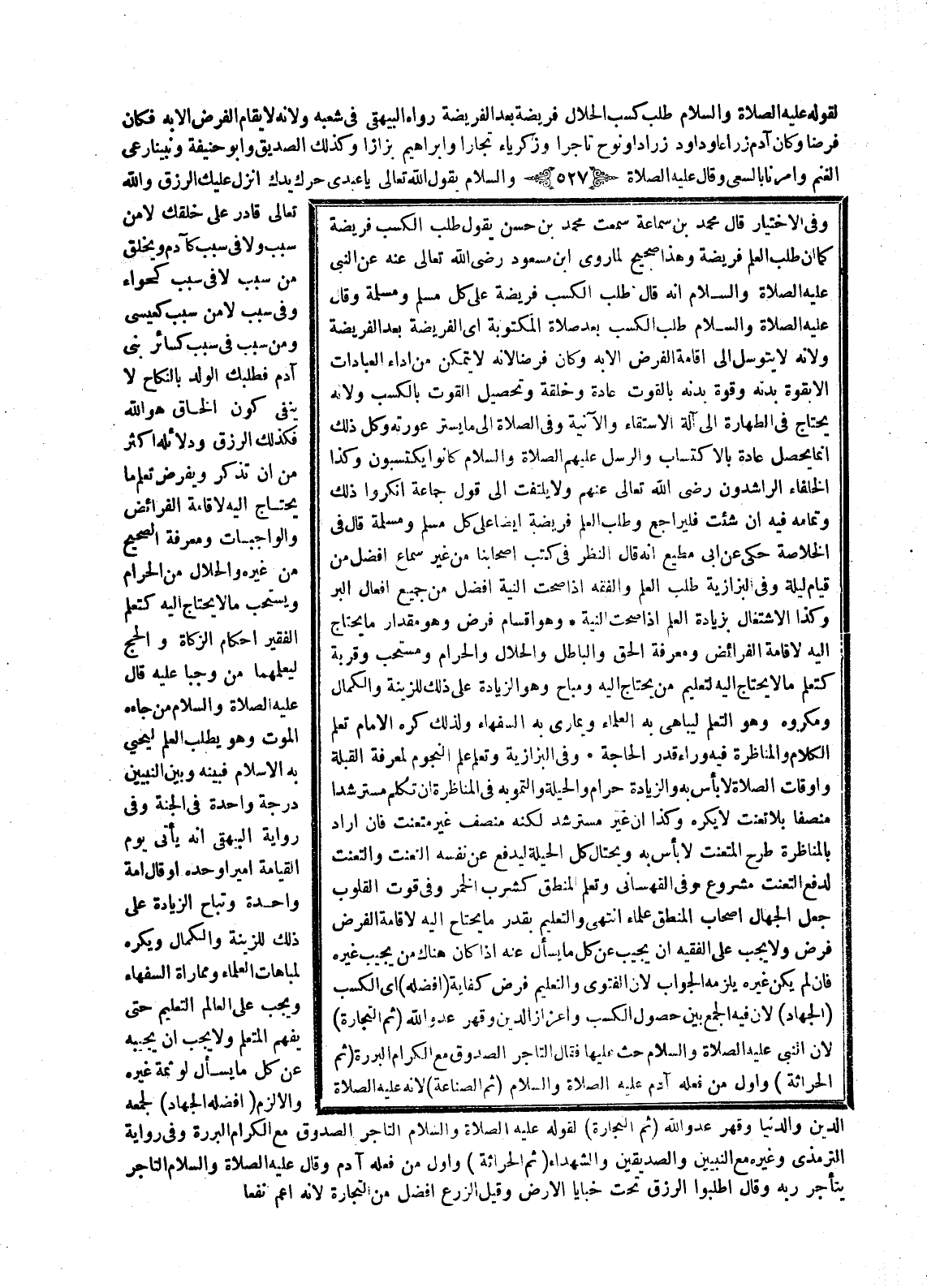ِ وَفِي الِاخْتِيَارِ قَالَ مُحَمَّدُ بْنُ سِمَاعَةَ سَمِعْت مُحَمَّدَ بْنَ حَسَنٍ يَقُولُ طَلَبُ الْكَسْبِ فَرِيضَةٌ كَمَا أَنَّ طَلَبَ الْعِلْمِ فَرِيضَةٌ وَهَذَا صَحِيحٌ لِمَا رَوَى ابْنُ مَسْعُودٍ - رَضِيَ اللَّهُ تَعَالَى عَنْهُ - عَنْ النَّبِيِّ - عَلَيْهِ الصَّلَاةُ وَالسَّلَامُ - أَنَّهُ قَالَ «طَلَبُ الْكَسْبِ فَرِيضَةٌ عَلَى كُلِّ مُسْلِمٍ وَمُسْلِمَةٍ» وَقَالَ - عَلَيْهِ الصَّلَاةُ وَالسَّلَامُ - «طَلَبُ الْكَسْبِ بَعْدَ صَلَاةِ الْمَكْتُوبَةِ أَيْ الْفَرِيضَةِ بَعْدَ الْفَرِيضَةِ» وَلِأَنَّهُ لَا يُتَوَسَّلُ إلَى إقَامَةِ الْفَرْضِ إلَّا بِهِ وَكَانَ فَرْضًا؛ لِأَنَّهُ لَا يَتَمَكَّنُ مِنْ أَدَاءِ الْعِبَادَاتِ إلَّا بِقُوَّةِ بَدَنِهِ وَقُوَّةِ بَدَنِهِ بِالْقُوتِ عَادَةً وَخِلْقَةً وَتَحْصِيلُ الْقُوتِ بِالْكَسْبِ وَلِأَنَّهُ يَحْتَاجُ فِي الطَّهَارَةِ إلَى آلَةِ الِاسْتِقَاءِ وَالْآنِيَةِ وَفِي الصَّلَاةِ إلَى مَا يَسْتُرُ عَوْرَتَهُ وَكُلُّ ذَلِكَ إنَّمَا يَحْصُلُ عَادَةً بِالِاكْتِسَابِ، وَالرُّسُلُ - عَلَيْهِمْ الصَّلَاةُ وَالسَّلَامُ - كَانُوا يَكْتَسِبُونَ وَكَذَا الْخُلَفَاءُ الرَّاشِدُونَ - رَضِيَ اللَّهُ تَعَالَى عَنْهُمْ - وَلَا يُلْتَفَتُ إلَى قَوْلٍ جَمَاعَةٍ أَنْكَرُوا ذَلِكَ وَتَمَامُهُ فِيهِ إنْ شِئْت فَلْيُرَاجَعْ.